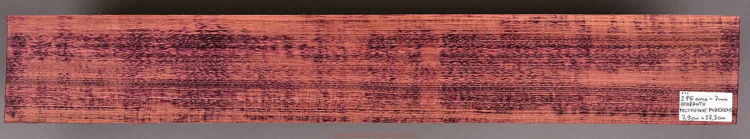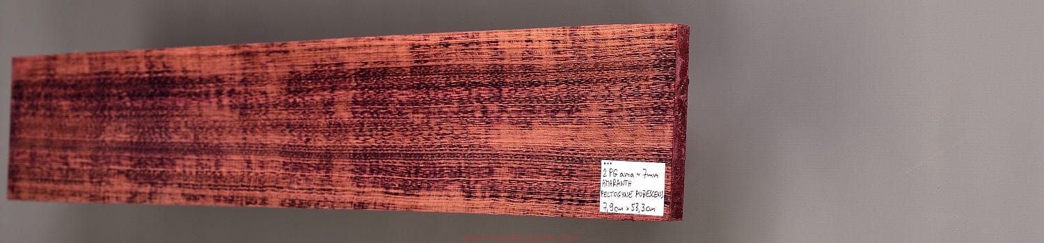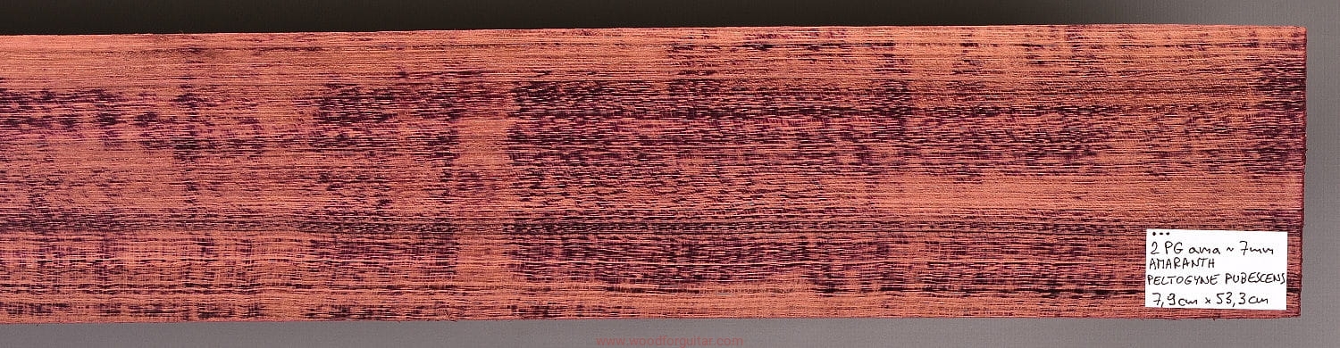 Jak sama nazwa wskazuje, Purpleheart, czyli Amaranth ma charakterystyczny fioletowy/purpurowy kolor, który z czasem przechodzi w zabarwienie brązu/czekolady, ale z poświatą tego charakterystycznego fioletu. Jeżeli zależy nam na utrzymaniu intensywnej fioletowej barwy, należy stosować lakiery z zabezpieczeniem UV. To jeden z najtwardszych i najmocniejszych gatunków drewna na naszej planecie. Dodatkowo jest odporny na wodę i wilgoć, lakierowanie nie jest wymagane. Z powodu dużej gęstości/ciężaru, nie może być stosowany na większe elementy instrumentów przenośnych, na pewno nie zalecamy na użycie go jako głównego drewna na korpus, ale jako cienki top lub podstrunnicę - już tak. Idealnie sprawdza się także jako kontrastowe przekładki w konstrukcjach laminowanych z racji swojej sztywności i/lub koloru. Obróbka sprawi dużo kłopotów, ale końcowy efekt na pewno nie zostanie niezauważony.