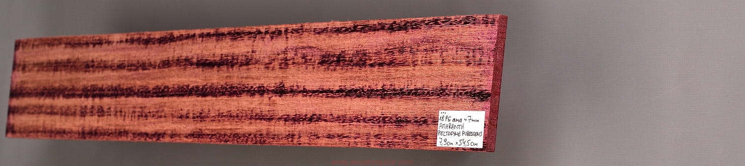 Jak sama nazwa wskazuje, Purpleheart, czyli Amaranth ma charakterystyczny fioletowy/purpurowy kolor, który z czasem przechodzi w zabarwienie brązu/czekolady, ale z poświatą tego charakterystycznego fioletu. Jeżeli zależy nam na utrzymaniu intensywnej fioletowej barwy, należy stosować lakiery z zabezpieczeniem UV. To jeden z najtwardszych i najmocniejszych gatunków drewna na naszej planecie. Dodatkowo jest odporny na wodę i wilgoć, lakierowanie nie jest wymagane. Z powodu dużej gęstości/ciężaru, nie może być stosowany na większe elementy instrumentów przenośnych, na pewno nie zalecamy na użycie go jako głównego drewna na korpus, ale jako cienki top lub podstrunnicę - już tak. Idealnie sprawdza się także jako kontrastowe przekładki w konstrukcjach laminowanych z racji swojej sztywności i/lub koloru. Obróbka sprawi dużo kłopotów, ale końcowy efekt na pewno nie zostanie niezauważony.