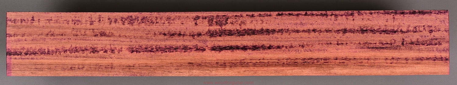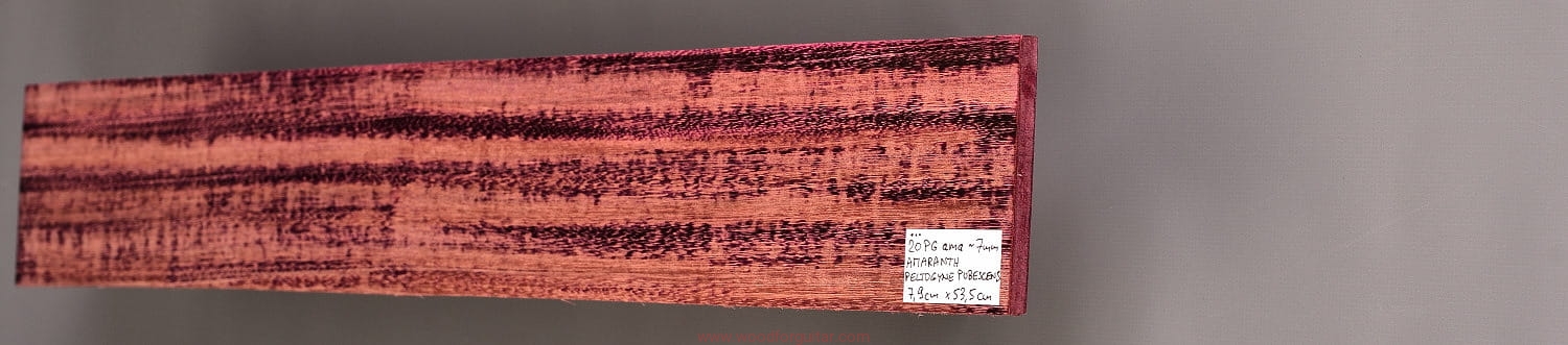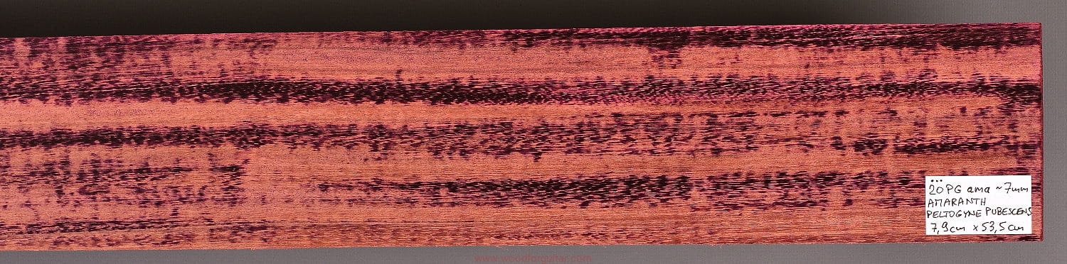 Jak sama nazwa wskazuje, Purpleheart, czyli Amaranth ma charakterystyczny fioletowy/purpurowy kolor, który z czasem przechodzi w zabarwienie brązu/czekolady, ale z poświatą tego charakterystycznego fioletu. Jeżeli zależy nam na utrzymaniu intensywnej fioletowej barwy, należy stosować lakiery z zabezpieczeniem UV. To jeden z najtwardszych i najmocniejszych gatunków drewna na naszej planecie. Dodatkowo jest odporny na wodę i wilgoć, lakierowanie nie jest wymagane. Z powodu dużej gęstości/ciężaru, nie może być stosowany na większe elementy instrumentów przenośnych, na pewno nie zalecamy na użycie go jako głównego drewna na korpus, ale jako cienki top lub podstrunnicę - już tak. Idealnie sprawdza się także jako kontrastowe przekładki w konstrukcjach laminowanych z racji swojej sztywności i/lub koloru. Obróbka sprawi dużo kłopotów, ale końcowy efekt na pewno nie zostanie niezauważony.