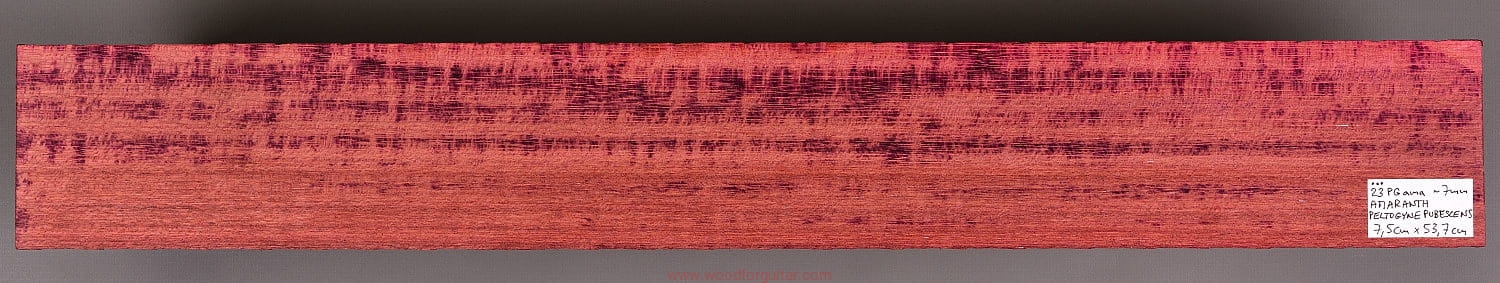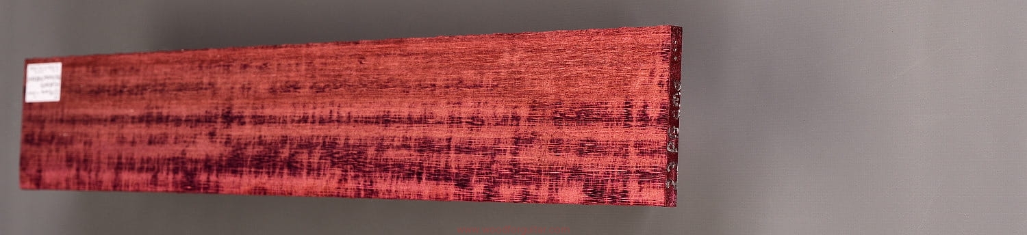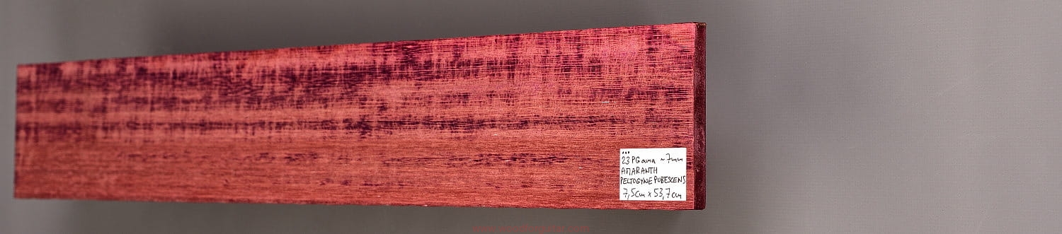 Jak sama nazwa wskazuje, Purpleheart, czyli Amaranth ma charakterystyczny fioletowy/purpurowy kolor, który z czasem przechodzi w zabarwienie brązu/czekolady, ale z poświatą tego charakterystycznego fioletu. Jeżeli zależy nam na utrzymaniu intensywnej fioletowej barwy, należy stosować lakiery z zabezpieczeniem UV. To jeden z najtwardszych i najmocniejszych gatunków drewna na naszej planecie. Dodatkowo jest odporny na wodę i wilgoć, lakierowanie nie jest wymagane. Z powodu dużej gęstości/ciężaru, nie może być stosowany na większe elementy instrumentów przenośnych, na pewno nie zalecamy na użycie go jako głównego drewna na korpus, ale jako cienki top lub podstrunnicę - już tak. Idealnie sprawdza się także jako kontrastowe przekładki w konstrukcjach laminowanych z racji swojej sztywności i/lub koloru. Obróbka sprawi dużo kłopotów, ale końcowy efekt na pewno nie zostanie niezauważony.