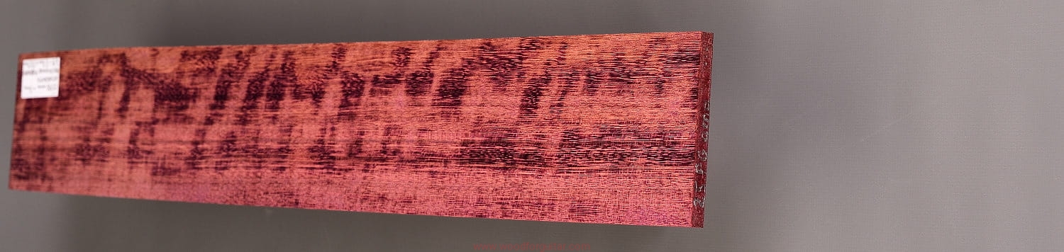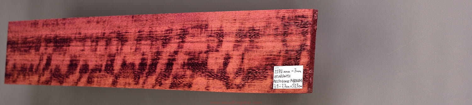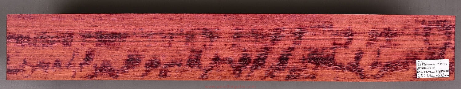 Jak sama nazwa wskazuje, Purpleheart, czyli Amaranth ma charakterystyczny fioletowy/purpurowy kolor, który z czasem przechodzi w zabarwienie brązu/czekolady, ale z poświatą tego charakterystycznego fioletu. Jeżeli zależy nam na utrzymaniu intensywnej fioletowej barwy, należy stosować lakiery z zabezpieczeniem UV. To jeden z najtwardszych i najmocniejszych gatunków drewna na naszej planecie. Dodatkowo jest odporny na wodę i wilgoć, lakierowanie nie jest wymagane. Z powodu dużej gęstości/ciężaru, nie może być stosowany na większe elementy instrumentów przenośnych, na pewno nie zalecamy na użycie go jako głównego drewna na korpus, ale jako cienki top lub podstrunnicę - już tak. Idealnie sprawdza się także jako kontrastowe przekładki w konstrukcjach laminowanych z racji swojej sztywności i/lub koloru. Obróbka sprawi dużo kłopotów, ale końcowy efekt na pewno nie zostanie niezauważony.