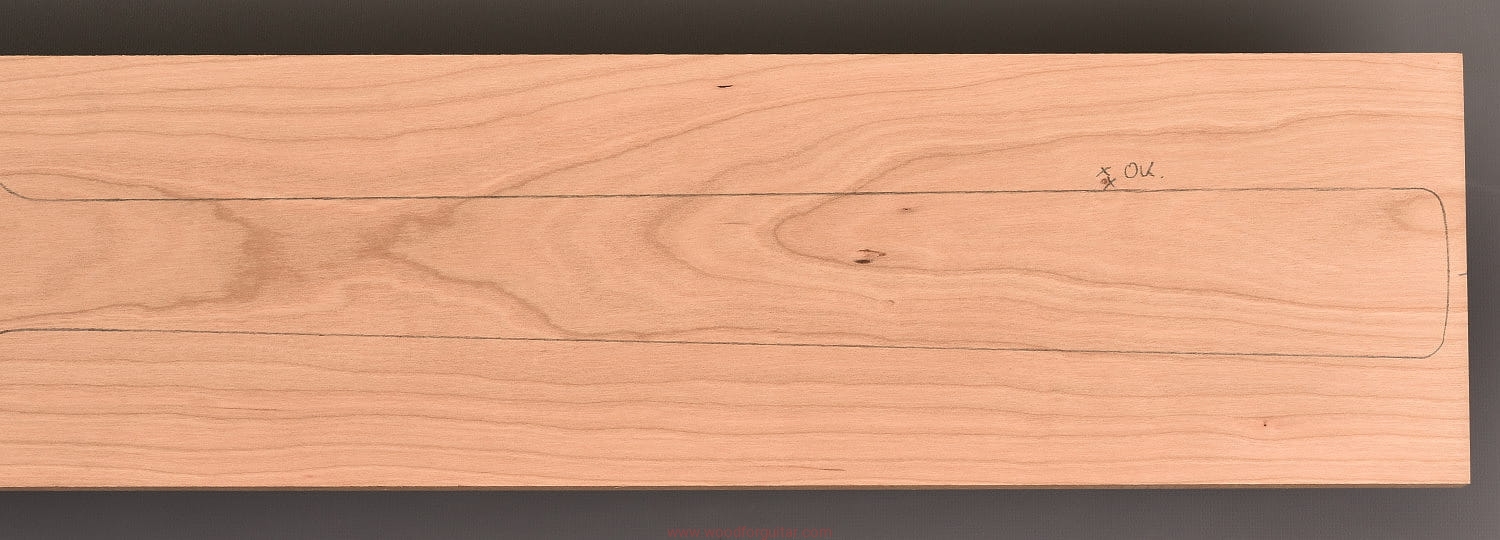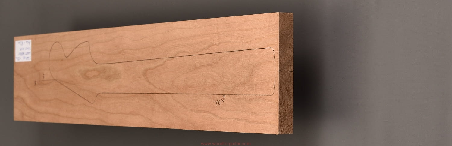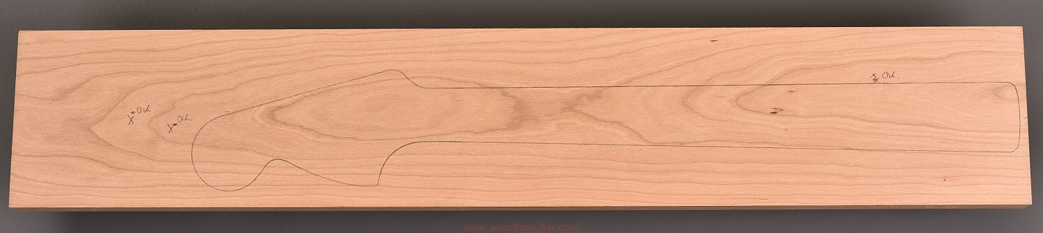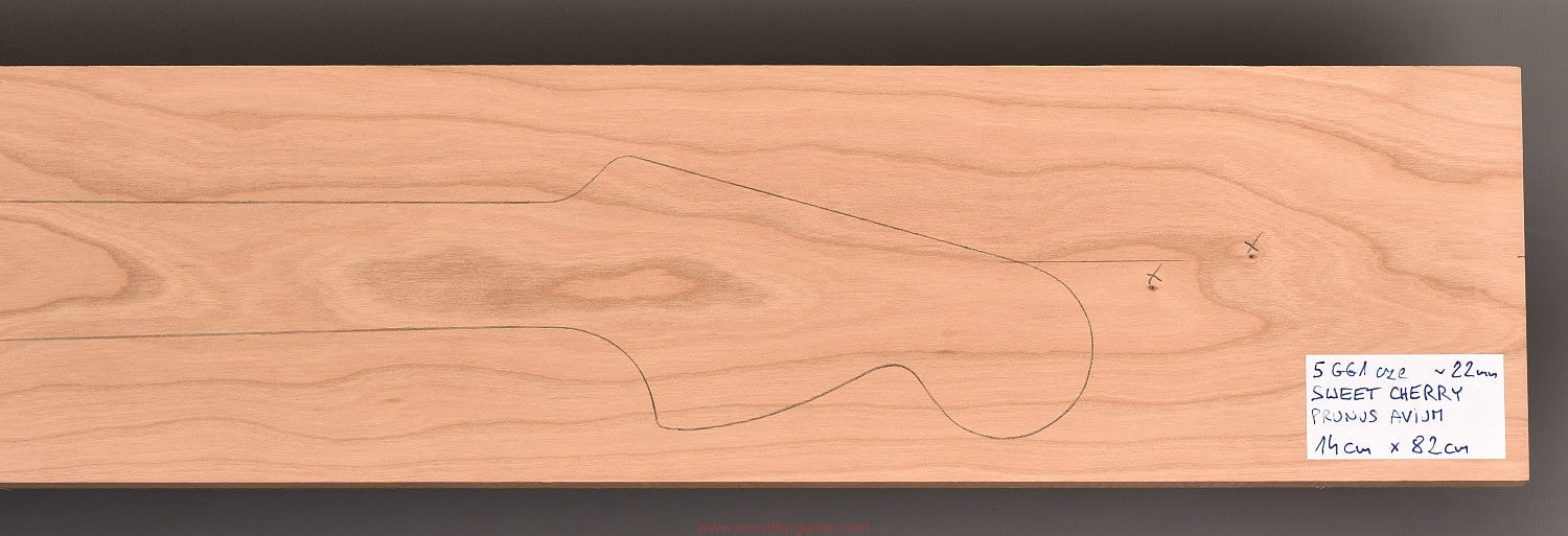 (1 kawałek drewna czereśni średniej gęstości, cięte płasko – słoje w przekroju równoległe i prawie równoległe do powierzchni, na formatkę naniesiono kształt gryfu typu Strat z dużą główką, w zaznaczonych miejscach oczka – poza kształtem gryfu)…