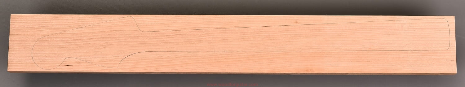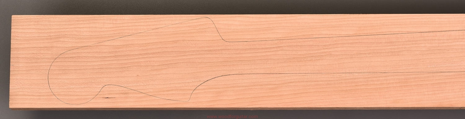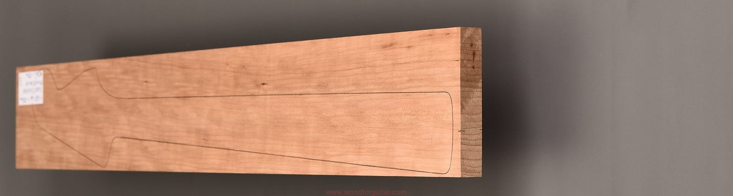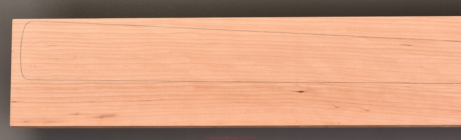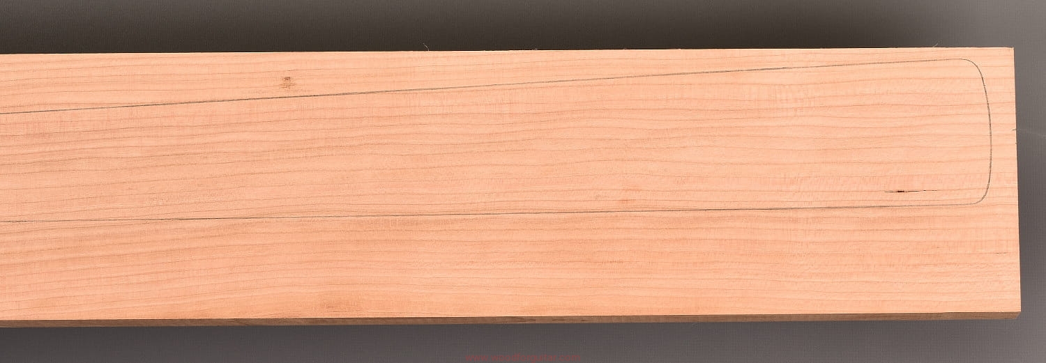 (1 kawałek drewna czereśni średniej gęstości, cięte „w ćwiartkę” – słoje w przekroju prostopadłe i prawie prostopadłe do powierzchni, na formatkę naniesiono kształt gryfu typu Jazz Bass. Sugerujemy zastosować dodatkowe wzmacniające pręty grafitowe, poprawiające sztywność i stabilność konstrukcji)…