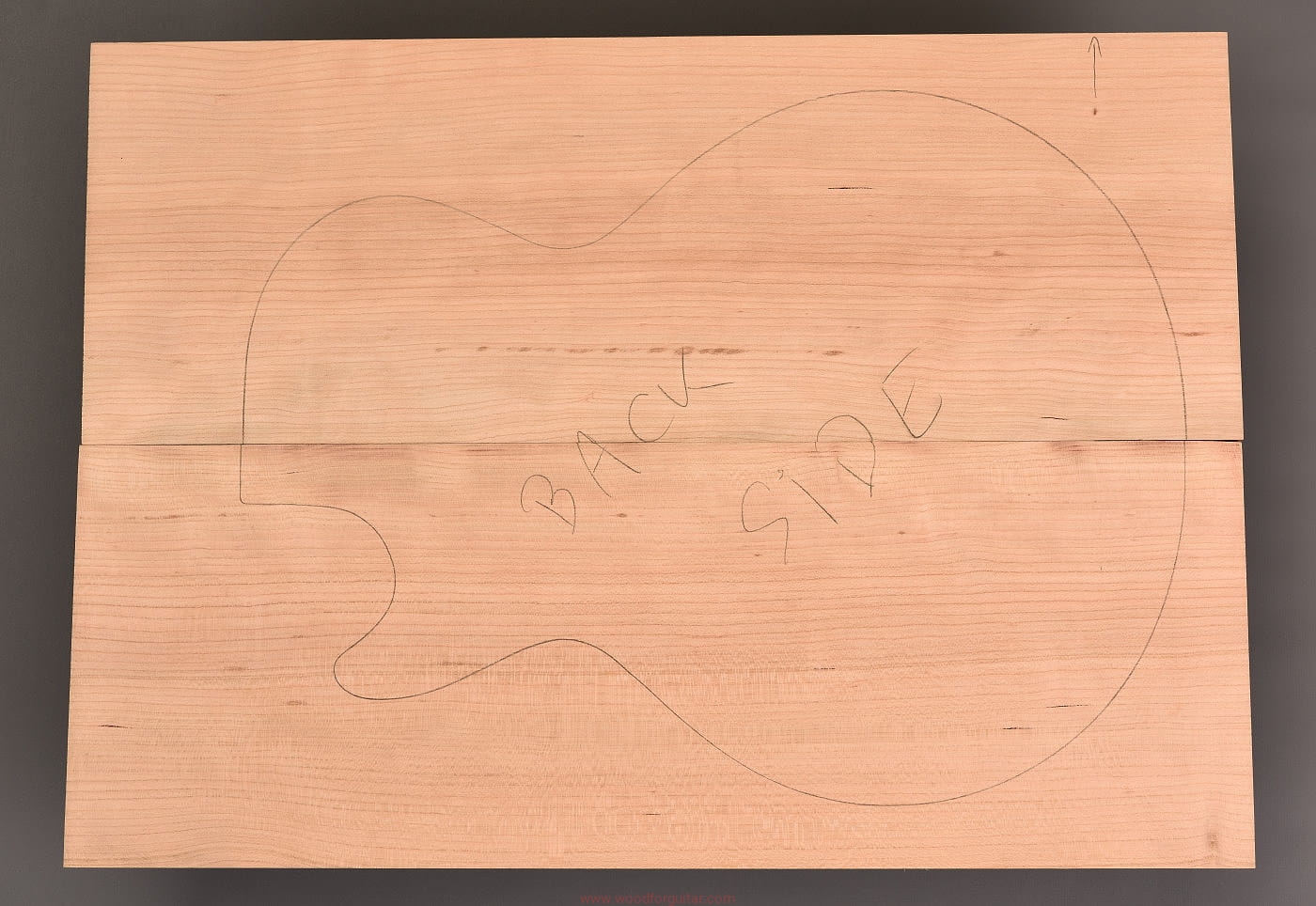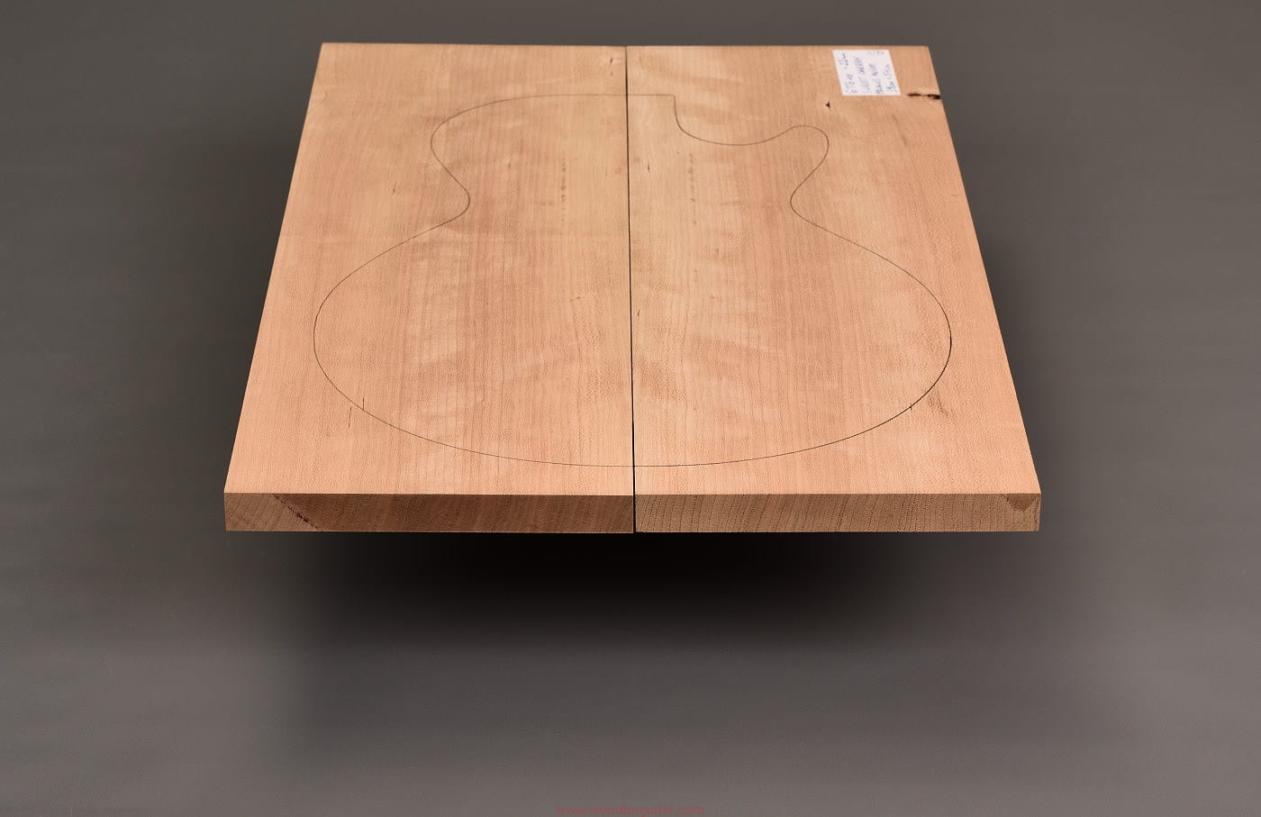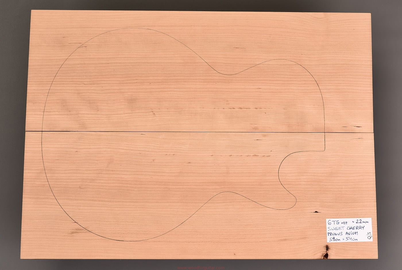 (2-częściowy zestaw drewna czereśni średniej gęstości, cięte „w ćwiartkę” – słoje w przekroju prostopadłe i prawie prostopadłe do powierzchni, rozcięte metodą „książkową” / tzw. bookmatched, widoczny sęk – poza kształtem korpusu typu LP)…