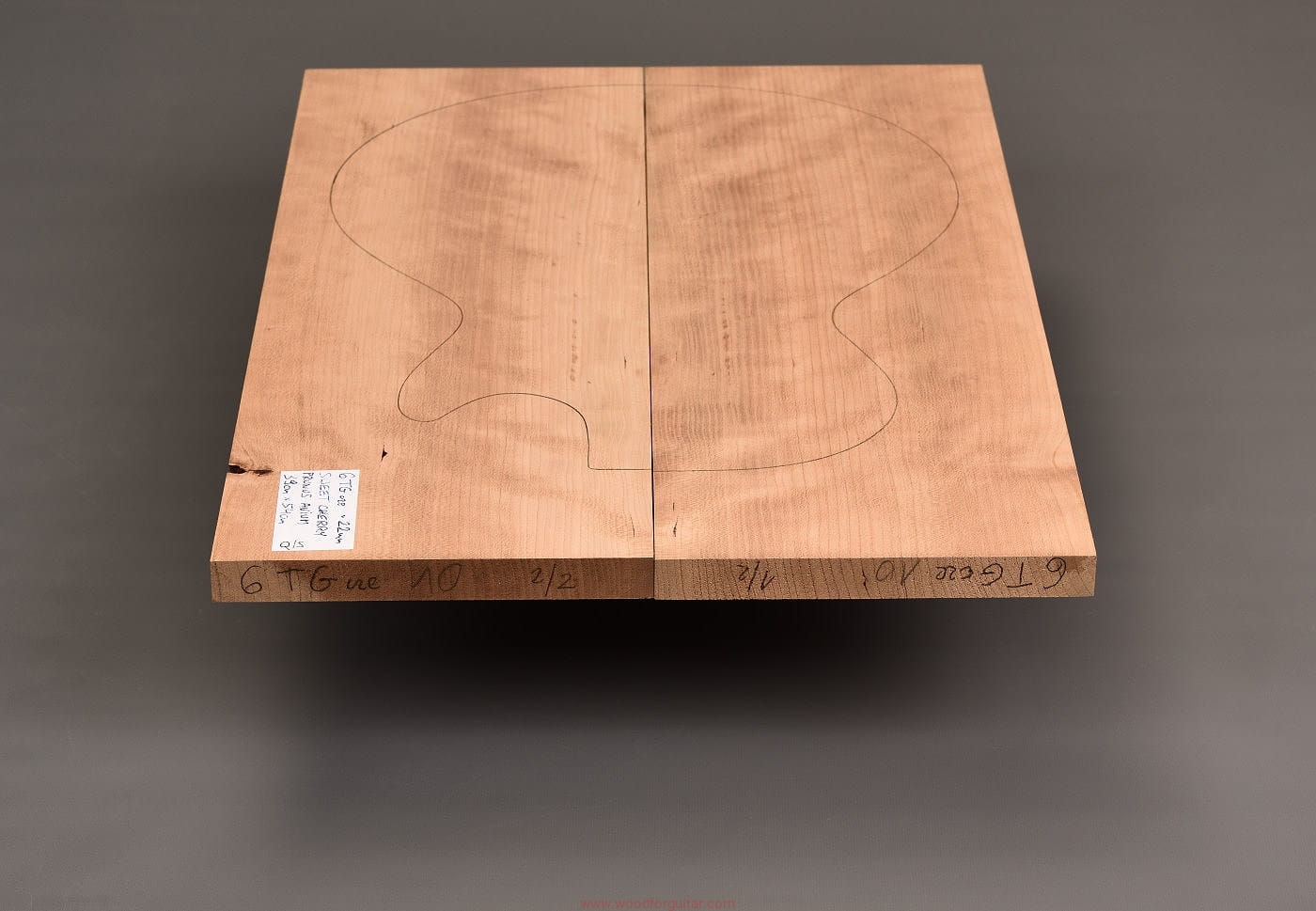 z przeznaczeniem na top korpusu gitary, gitary basowej lub innego instrumentu, w ramach którego można wykorzystać przedstawiony zestaw. Zdjęcia dotyczą tego konkretnego numerowanego zestawu drewna. Drewno jest wstępnie oszlifowane powierzchniowo papierem ściernym, klejenie oraz dostosowanie wymiarów do własnych celów należy przeprowadzić samodzielnie. Jak zawsze w przypadku pracy z drewnem, zalecamy zaaklimatyzowanie produktu w miejscu docelowym przez okres kilku tygodni. Każdy, nawet najbardziej stabilny gatunek drewna nie jest obojętny na zmiany wilgotności, temperatury i innych czynników zewnętrznych.