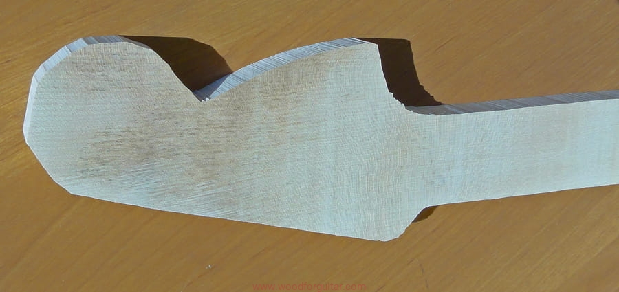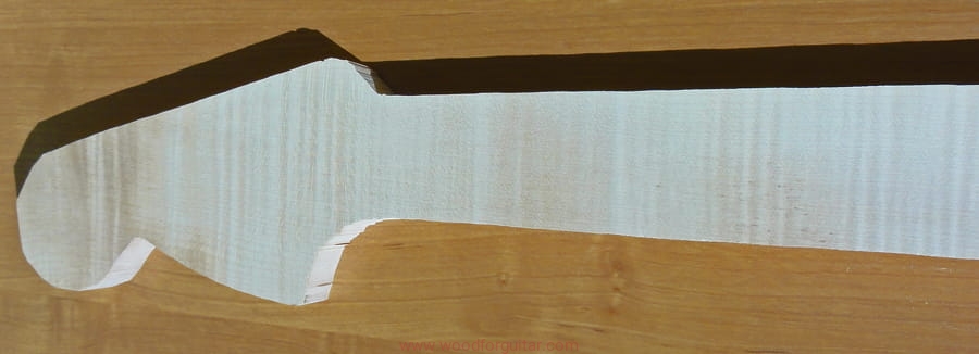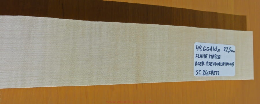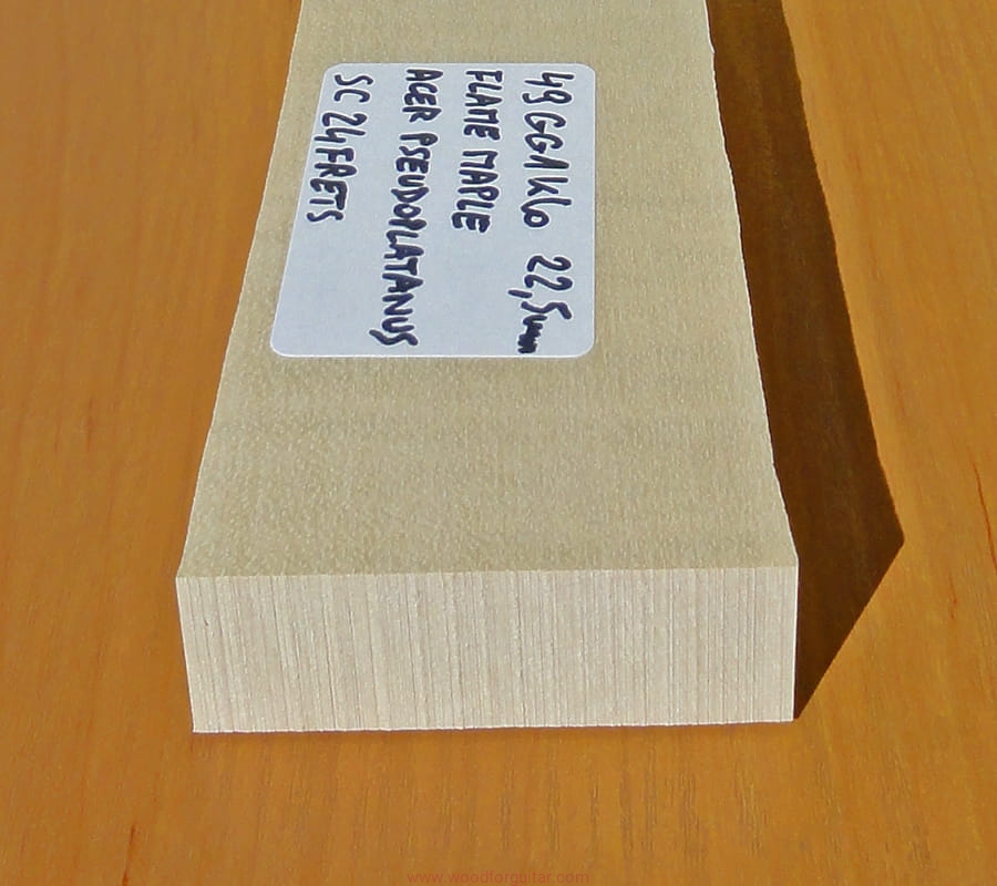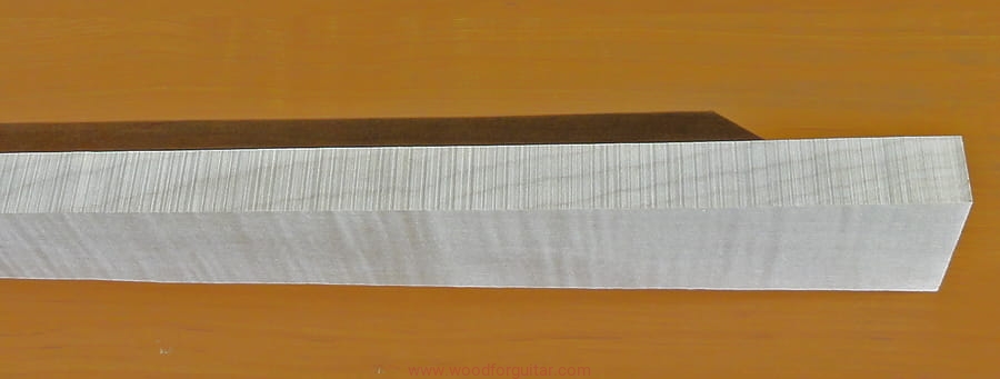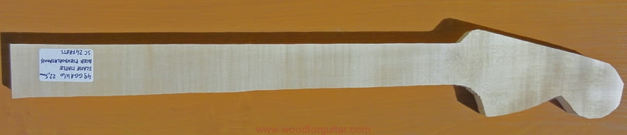 (1 kawałek, drewno o dużej gęstości z prostymi przyrostami wzdłuż materiału, cięte „w ćwiartkę” - słoje w przekroju lekko skośne/skośne odległościach ok. 1 – 1,5 mm od siebie, delikatne zauważalne płomienie/flames na całej powierzchni. Porządny kawałek na porządny gryf o solidnym rockowym brzmieniu, odpowiedź typu „high tap tone”. Brak widocznych jakichkolwiek wad, sęczków, przebarwień itp. Zwiększona długość pozwala wykonać gryf 24-progowy. Polecamy zmodyfikować oryginalny projekt i wykonać grubszą stopkę oraz główkę niżej osadzoną lub grubszą. Na podstrunnicę rekomendujemy dostępny u nas palisander lub pau ferro)…