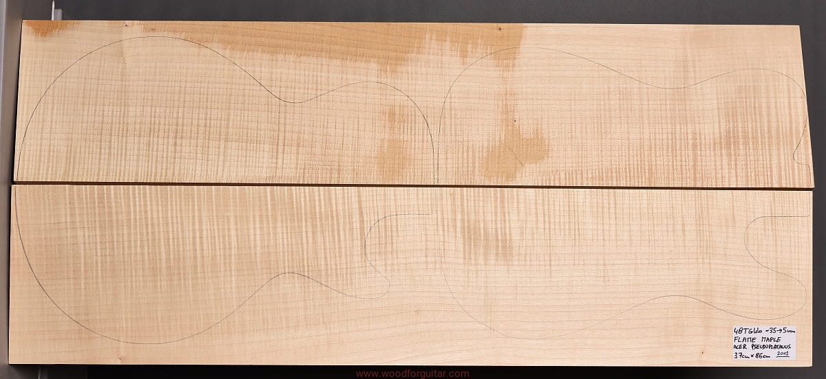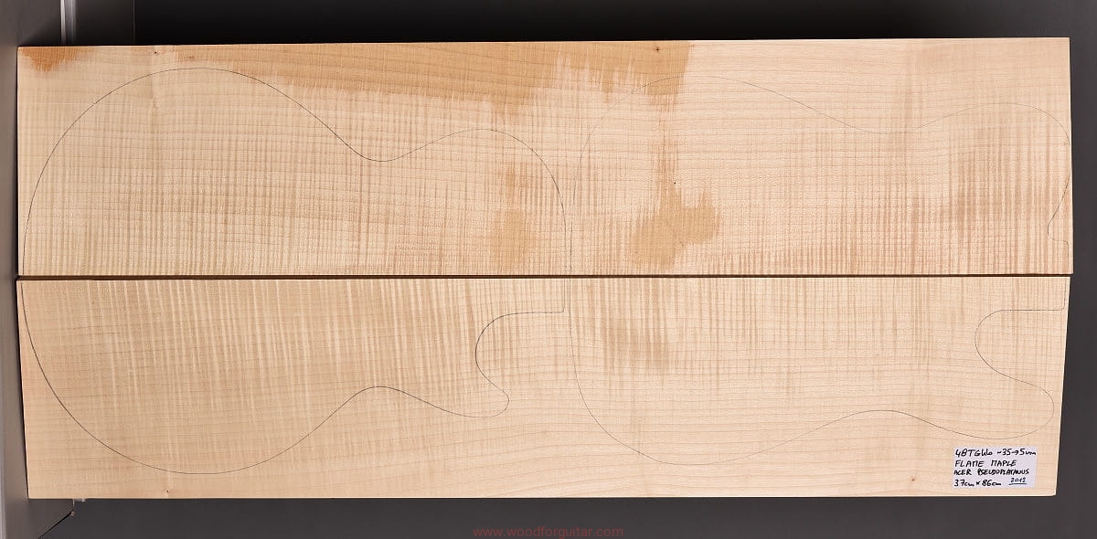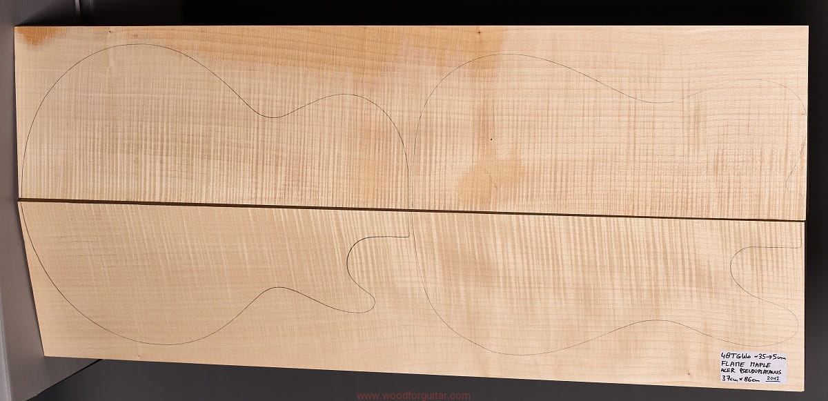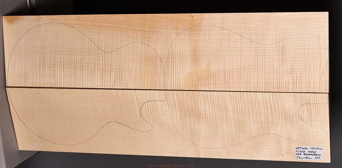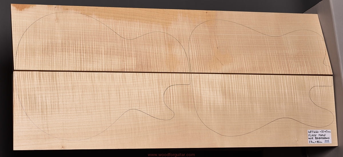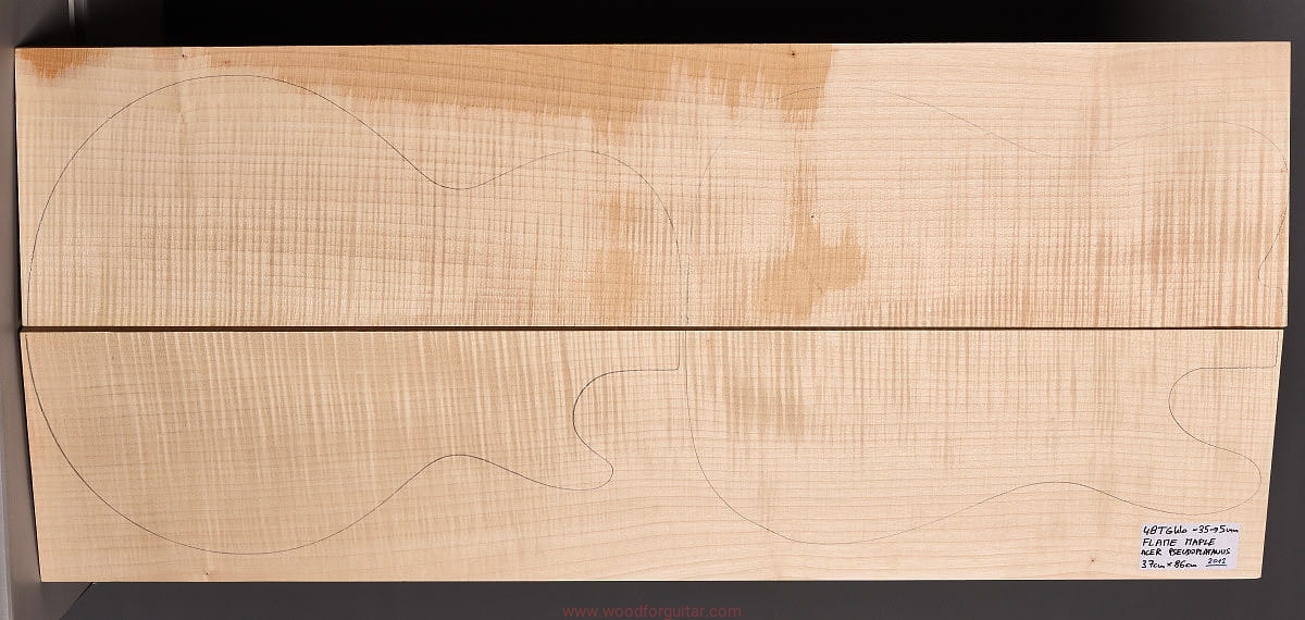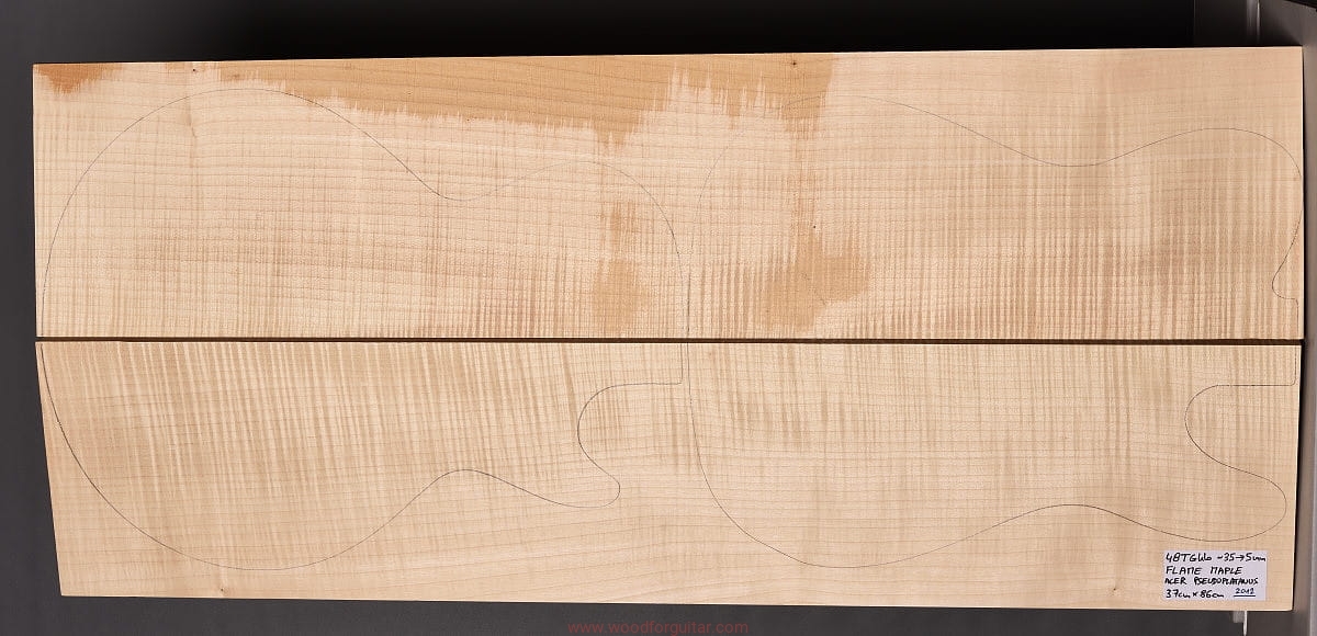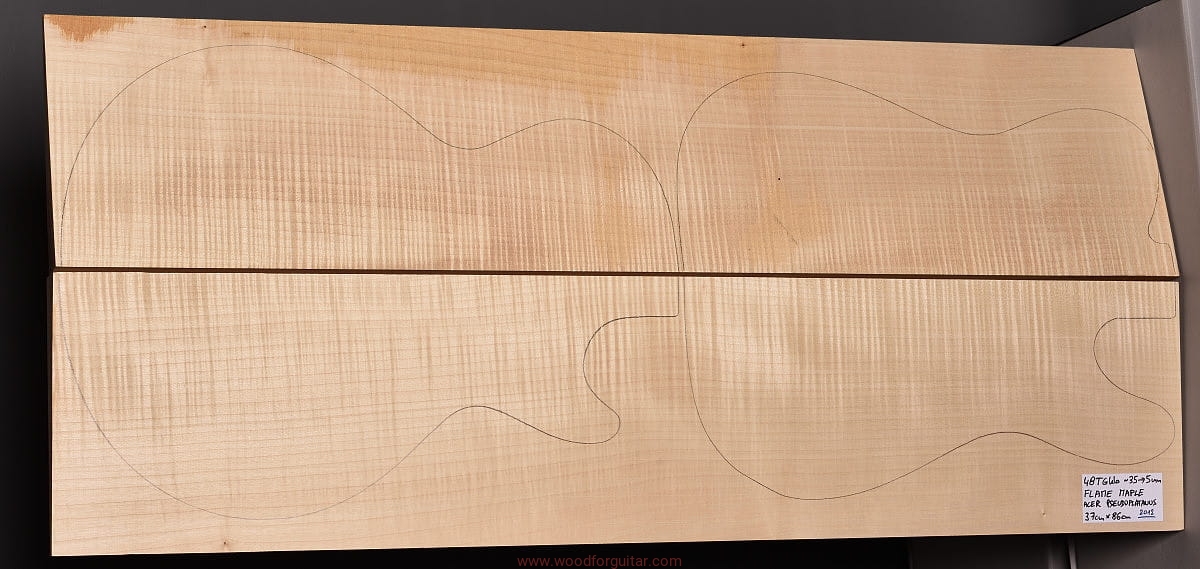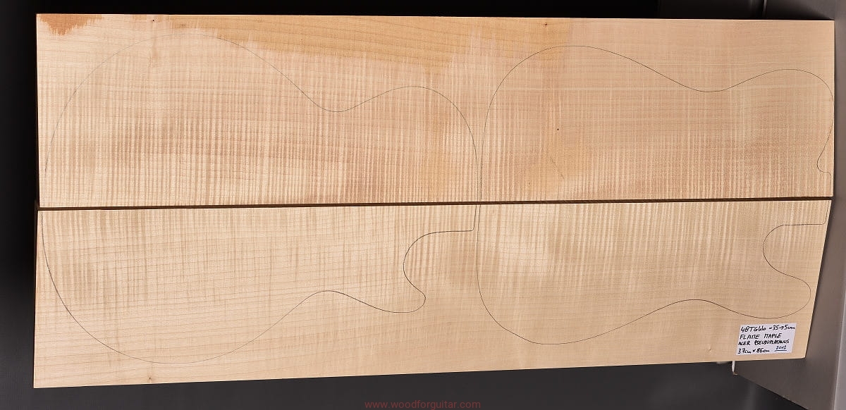 (zestaw 2 połówek klonu jaworowego falistego, cięte „w ćwiartkę” – słoje w przekroju prostopadłe i prawie prostopadłe do powierzchni, rozcięte metodą książkową / „bookmatched”, drewno sezonowane od 2012r. Nadmiar materiału do wykorzystania np. na ... może na drugi top?)…