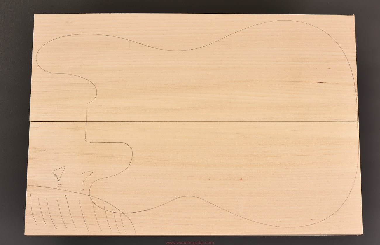 (2-częściowy zestaw drewna lipowego średniej-wysokiej gęstości, rysunek przedstawia kształt korpusu typu Precission. UWAGA – w zaznaczonym miejscu pęknięcie, które może wejść w kształt korpusu – do ewentualnego wypełnienia)…