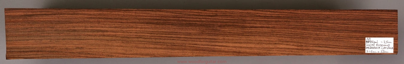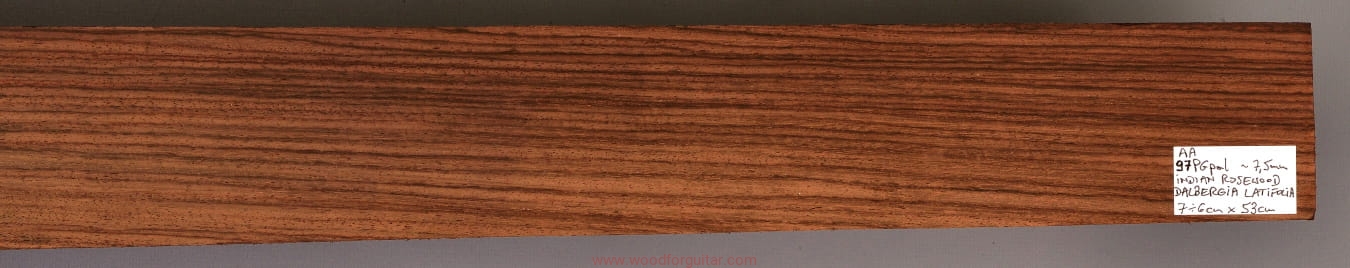 Bardzo popularne i klasyczne drewno, używane od lat głównie na podstrunnice w gitarach elektrycznych, basowych oraz akustycznych. Jak wskazuje nazwa, pochodzi głównie z Indii, ale także rośnie i jest pozyskiwane na Sri Lance oraz w Indonezji. Tonalnie palisander indyjski jest określany jako ciepłobrzmiący, nie oznacza to jednak, że brakuje mu tzw. góry. Kiedy potrzeba generuje zaokrąglone łagodnie brzmiące wysokie przydźwięki i idealnie sprawdza się w instrumentach przeznaczonych do muzyki bluesowej, rockowej lub w instrumentach uniwersalnych. Drewno jest stosunkowo tanie (raczej już niestety było tanie), jednak wysokiej klasy kawałki osiągają ceny porównywalne z czarnym hebanem, dotyczy to również kawałków unikalnych, o specyficznych cechach. Kawałek na podstrunnicę może kosztować 15 dolarów, ale może też kosztować 50 dolarów oraz więcej. Wygląd palisandra indyjskiego lubi się znacznie różnić. W zależności m.in. od warunków w jakich rosło drzewo, drewno przybiera barwę prawie czarną z ciemno-brązowymi pręgami, najczęściej jednak ma charakterystyczne zabarwienie brązowe, przechodzące w ciemny fiolet, czasami z jaśniejszymi beżowo-żółto-czerwonymi akcentami/pasami. Łatwe w obróbce, pięknie pachnie, a z powodu dużej zawartości olejków własnych nie wymaga lakierowania. W gotowym instrumencie do czyszczenia i impregnowania wystarczy tylko używać popularnego olejku cytrynowego. Po wyszlifowaniu jest aksamitne w dotyku z wyczuwalnymi porami. Drewno jest mocne, twarde, odporne na ścieranie, pory drewna są dosyć duże i szerokie. Palisander indyjski to wspaniałe i magiczne drewno, które słyszymy w muzyce od pokoleń. Niestety, wieloletnie niekontrolowane masowe wycinki drzew tego gatunku doprowadziły do zbyt daleko posuniętego zaniku palisandra indyjskiego w przyrodzie, dlatego podjęto decyzję o objęciu tego gatunku szczególną ochroną i wpisaniu go na listę gatunków zagrożonych (CITES). Sprzedaż gatunku Dalbergia latifolia prowadzimy tylko do krajów Unii Europejskiej, proszę mieć na uwadze, że wszelkie przekroczenia granicy UE instrumentu z nawet niewielkim elementem wykonanym z tego drewna z/do Unii Europejskiej wymagają specjalnych pozwoleń Ministerstwa Środowiska lub odpowiednika tej instytucji w danym kraju. Brak pozwoleń skutkuje zarekwirowaniem drewna lub całego instrumentu przez służby celne.