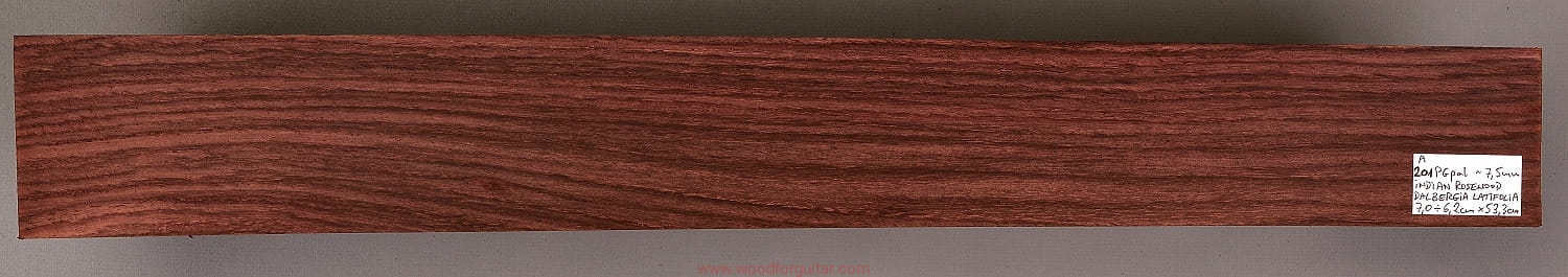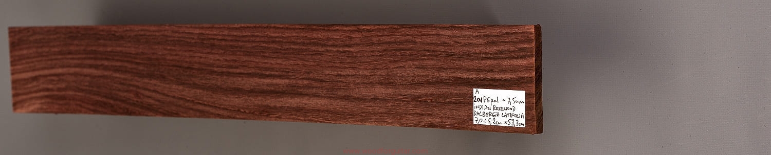 Bardzo popularne i klasyczne drewno, używane od lat głównie na podstrunnice w gitarach elektrycznych, basowych oraz akustycznych. Jak wskazuje nazwa, pochodzi głównie z Indii, ale także rośnie i jest pozyskiwane na Sri Lance oraz w Indonezji. Tonalnie palisander indyjski jest określany jako ciepłobrzmiący, nie oznacza to jednak, że brakuje mu tzw. góry. Kiedy potrzeba generuje zaokrąglone łagodnie brzmiące wysokie przydźwięki i idealnie sprawdza się w instrumentach przeznaczonych do muzyki bluesowej, rockowej lub w instrumentach uniwersalnych. Drewno jest stosunkowo tanie (raczej już niestety było tanie), jednak wysokiej klasy kawałki osiągają ceny porównywalne z czarnym hebanem, dotyczy to również kawałków unikalnych, o specyficznych cechach. Kawałek na podstrunnicę może kosztować 15 dolarów, ale może też kosztować 50 dolarów oraz więcej. Wygląd palisandra indyjskiego lubi się znacznie różnić. W zależności m.in. od warunków w jakich rosło drzewo, drewno przybiera barwę prawie czarną z ciemno-brązowymi pręgami, najczęściej jednak ma charakterystyczne zabarwienie brązowe, przechodzące w ciemny fiolet, czasami z jaśniejszymi beżowo-żółto-czerwonymi akcentami/pasami. Łatwe w obróbce, pięknie pachnie, a z powodu dużej zawartości olejków własnych nie wymaga lakierowania. W gotowym instrumencie do czyszczenia i impregnowania wystarczy tylko używać popularnego olejku cytrynowego. Po wyszlifowaniu jest aksamitne w dotyku z wyczuwalnymi porami. Drewno jest mocne, twarde, odporne na ścieranie, pory drewna są dosyć duże i szerokie. Palisander indyjski to wspaniałe i magiczne drewno, które słyszymy w muzyce od pokoleń. Niestety, wieloletnie niekontrolowane masowe wycinki drzew tego gatunku doprowadziły do zbyt daleko posuniętego zaniku palisandra indyjskiego w przyrodzie, dlatego podjęto decyzję o objęciu tego gatunku szczególną ochroną i wpisaniu go na listę gatunków zagrożonych (CITES). Sprzedaż gatunku Dalbergia latifolia prowadzimy tylko do krajów Unii Europejskiej, proszę mieć na uwadze, że wszelkie przekroczenia granicy UE instrumentu z nawet niewielkim elementem wykonanym z tego drewna z/do Unii Europejskiej wymagają specjalnych pozwoleń Ministerstwa Środowiska lub odpowiednika tej instytucji w danym kraju. Brak pozwoleń skutkuje zarekwirowaniem drewna lub całego instrumentu przez służby celne.