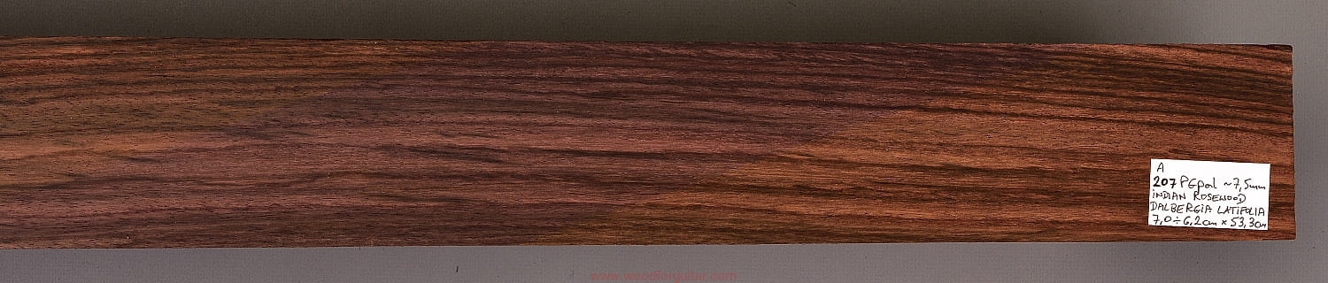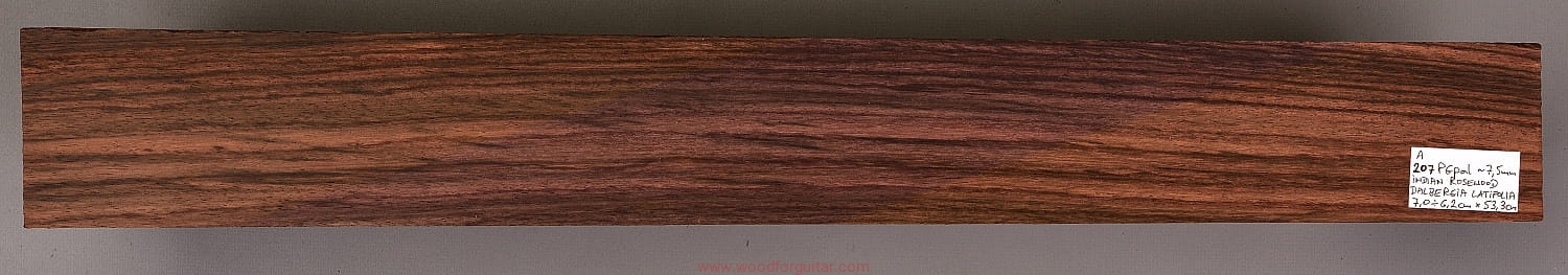 Bardzo popularne i klasyczne drewno, używane od lat głównie na podstrunnice w gitarach elektrycznych, basowych oraz akustycznych. Jak wskazuje nazwa, pochodzi głównie z Indii, ale także rośnie i jest pozyskiwane na Sri Lance oraz w Indonezji. Tonalnie palisander indyjski jest określany jako ciepłobrzmiący, nie oznacza to jednak, że brakuje mu tzw. góry. Kiedy potrzeba generuje zaokrąglone łagodnie brzmiące wysokie przydźwięki i idealnie sprawdza się w instrumentach przeznaczonych do muzyki bluesowej, rockowej lub w instrumentach uniwersalnych. Drewno jest stosunkowo tanie (raczej już niestety było tanie), jednak wysokiej klasy kawałki osiągają ceny porównywalne z czarnym hebanem, dotyczy to również kawałków unikalnych, o specyficznych cechach. Kawałek na podstrunnicę może kosztować 15 dolarów, ale może też kosztować 50 dolarów oraz więcej. Wygląd palisandra indyjskiego lubi się znacznie różnić. W zależności m.in. od warunków w jakich rosło drzewo, drewno przybiera barwę prawie czarną z ciemno-brązowymi pręgami, najczęściej jednak ma charakterystyczne zabarwienie brązowe, przechodzące w ciemny fiolet, czasami z jaśniejszymi beżowo-żółto-czerwonymi akcentami/pasami. Łatwe w obróbce, pięknie pachnie, a z powodu dużej zawartości olejków własnych nie wymaga lakierowania. W gotowym instrumencie do czyszczenia i impregnowania wystarczy tylko używać popularnego olejku cytrynowego. Po wyszlifowaniu jest aksamitne w dotyku z wyczuwalnymi porami. Drewno jest mocne, twarde, odporne na ścieranie, pory drewna są dosyć duże i szerokie. Palisander indyjski to wspaniałe i magiczne drewno, które słyszymy w muzyce od pokoleń. Niestety, wieloletnie niekontrolowane masowe wycinki drzew tego gatunku doprowadziły do zbyt daleko posuniętego zaniku palisandra indyjskiego w przyrodzie, dlatego podjęto decyzję o objęciu tego gatunku szczególną ochroną i wpisaniu go na listę gatunków zagrożonych (CITES). Sprzedaż gatunku Dalbergia latifolia prowadzimy tylko do krajów Unii Europejskiej, proszę mieć na uwadze, że wszelkie przekroczenia granicy UE instrumentu z nawet niewielkim elementem wykonanym z tego drewna z/do Unii Europejskiej wymagają specjalnych pozwoleń Ministerstwa Środowiska lub odpowiednika tej instytucji w danym kraju. Brak pozwoleń skutkuje zarekwirowaniem drewna lub całego instrumentu przez służby celne.