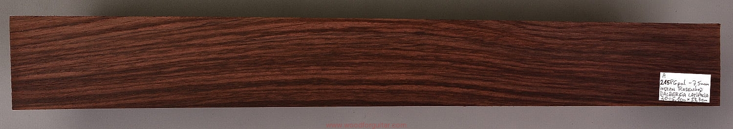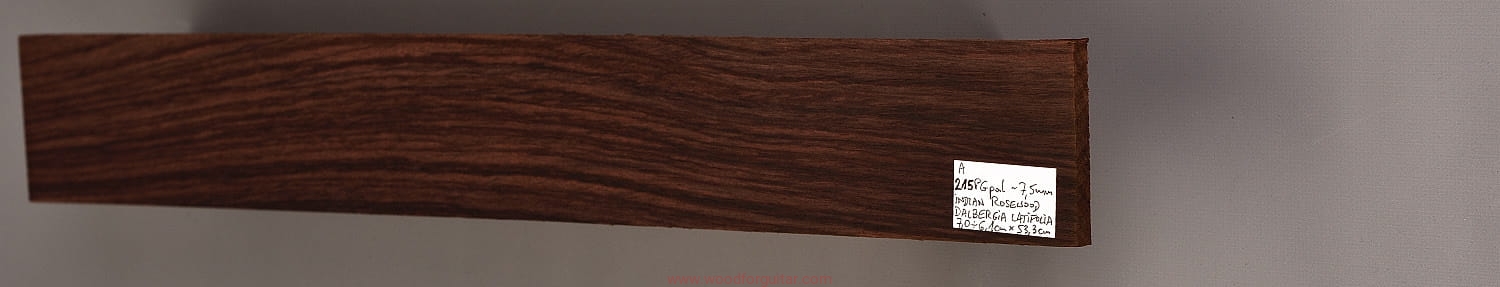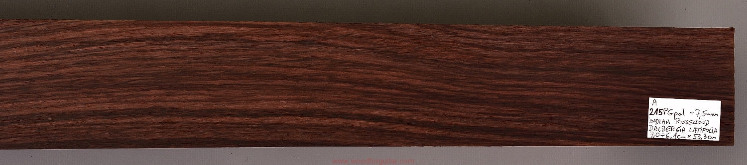 Bardzo popularne i klasyczne drewno, używane od lat głównie na podstrunnice w gitarach elektrycznych, basowych oraz akustycznych. Jak wskazuje nazwa, pochodzi głównie z Indii, ale także rośnie i jest pozyskiwane na Sri Lance oraz w Indonezji. Tonalnie palisander indyjski jest określany jako ciepłobrzmiący, nie oznacza to jednak, że brakuje mu tzw. góry. Kiedy potrzeba generuje zaokrąglone łagodnie brzmiące wysokie przydźwięki i idealnie sprawdza się w instrumentach przeznaczonych do muzyki bluesowej, rockowej lub w instrumentach uniwersalnych. Drewno jest stosunkowo tanie (raczej już niestety było tanie), jednak wysokiej klasy kawałki osiągają ceny porównywalne z czarnym hebanem, dotyczy to również kawałków unikalnych, o specyficznych cechach. Kawałek na podstrunnicę może kosztować 15 dolarów, ale może też kosztować 50 dolarów oraz więcej. Wygląd palisandra indyjskiego lubi się znacznie różnić. W zależności m.in. od warunków w jakich rosło drzewo, drewno przybiera barwę prawie czarną z ciemno-brązowymi pręgami, najczęściej jednak ma charakterystyczne zabarwienie brązowe, przechodzące w ciemny fiolet, czasami z jaśniejszymi beżowo-żółto-czerwonymi akcentami/pasami. Łatwe w obróbce, pięknie pachnie, a z powodu dużej zawartości olejków własnych nie wymaga lakierowania. W gotowym instrumencie do czyszczenia i impregnowania wystarczy tylko używać popularnego olejku cytrynowego. Po wyszlifowaniu jest aksamitne w dotyku z wyczuwalnymi porami. Drewno jest mocne, twarde, odporne na ścieranie, pory drewna są dosyć duże i szerokie. Palisander indyjski to wspaniałe i magiczne drewno, które słyszymy w muzyce od pokoleń. Niestety, wieloletnie niekontrolowane masowe wycinki drzew tego gatunku doprowadziły do zbyt daleko posuniętego zaniku palisandra indyjskiego w przyrodzie, dlatego podjęto decyzję o objęciu tego gatunku szczególną ochroną i wpisaniu go na listę gatunków zagrożonych (CITES). Sprzedaż gatunku Dalbergia latifolia prowadzimy tylko do krajów Unii Europejskiej, proszę mieć na uwadze, że wszelkie przekroczenia granicy UE instrumentu z nawet niewielkim elementem wykonanym z tego drewna z/do Unii Europejskiej wymagają specjalnych pozwoleń Ministerstwa Środowiska lub odpowiednika tej instytucji w danym kraju. Brak pozwoleń skutkuje zarekwirowaniem drewna lub całego instrumentu przez służby celne.
