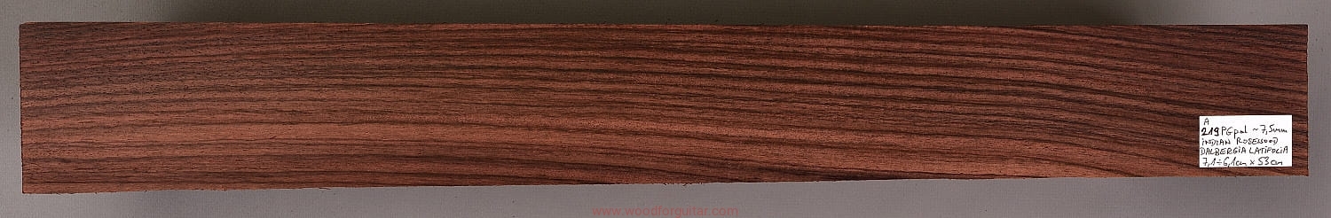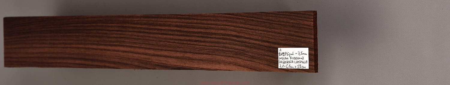 Bardzo popularne i klasyczne drewno, używane od lat głównie na podstrunnice w gitarach elektrycznych, basowych oraz akustycznych. Jak wskazuje nazwa, pochodzi głównie z Indii, ale także rośnie i jest pozyskiwane na Sri Lance oraz w Indonezji. Tonalnie palisander indyjski jest określany jako ciepłobrzmiący, nie oznacza to jednak, że brakuje mu tzw. góry. Kiedy potrzeba generuje zaokrąglone łagodnie brzmiące wysokie przydźwięki i idealnie sprawdza się w instrumentach przeznaczonych do muzyki bluesowej, rockowej lub w instrumentach uniwersalnych. Drewno jest stosunkowo tanie (raczej już niestety było tanie), jednak wysokiej klasy kawałki osiągają ceny porównywalne z czarnym hebanem, dotyczy to również kawałków unikalnych, o specyficznych cechach. Kawałek na podstrunnicę może kosztować 15 dolarów, ale może też kosztować 50 dolarów oraz więcej. Wygląd palisandra indyjskiego lubi się znacznie różnić. W zależności m.in. od warunków w jakich rosło drzewo, drewno przybiera barwę prawie czarną z ciemno-brązowymi pręgami, najczęściej jednak ma charakterystyczne zabarwienie brązowe, przechodzące w ciemny fiolet, czasami z jaśniejszymi beżowo-żółto-czerwonymi akcentami/pasami. Łatwe w obróbce, pięknie pachnie, a z powodu dużej zawartości olejków własnych nie wymaga lakierowania. W gotowym instrumencie do czyszczenia i impregnowania wystarczy tylko używać popularnego olejku cytrynowego. Po wyszlifowaniu jest aksamitne w dotyku z wyczuwalnymi porami. Drewno jest mocne, twarde, odporne na ścieranie, pory drewna są dosyć duże i szerokie. Palisander indyjski to wspaniałe i magiczne drewno, które słyszymy w muzyce od pokoleń. Niestety, wieloletnie niekontrolowane masowe wycinki drzew tego gatunku doprowadziły do zbyt daleko posuniętego zaniku palisandra indyjskiego w przyrodzie, dlatego podjęto decyzję o objęciu tego gatunku szczególną ochroną i wpisaniu go na listę gatunków zagrożonych (CITES). Sprzedaż gatunku Dalbergia latifolia prowadzimy tylko do krajów Unii Europejskiej, proszę mieć na uwadze, że wszelkie przekroczenia granicy UE instrumentu z nawet niewielkim elementem wykonanym z tego drewna z/do Unii Europejskiej wymagają specjalnych pozwoleń Ministerstwa Środowiska lub odpowiednika tej instytucji w danym kraju. Brak pozwoleń skutkuje zarekwirowaniem drewna lub całego instrumentu przez służby celne.