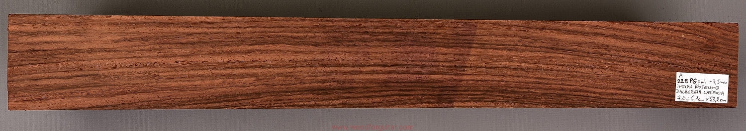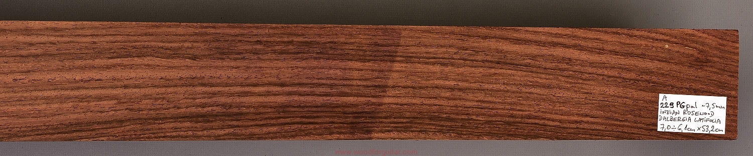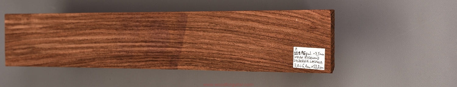 Bardzo popularne i klasyczne drewno, używane od lat głównie na podstrunnice w gitarach elektrycznych, basowych oraz akustycznych. Jak wskazuje nazwa, pochodzi głównie z Indii, ale także rośnie i jest pozyskiwane na Sri Lance oraz w Indonezji. Tonalnie palisander indyjski jest określany jako ciepłobrzmiący, nie oznacza to jednak, że brakuje mu tzw. góry. Kiedy potrzeba generuje zaokrąglone łagodnie brzmiące wysokie przydźwięki i idealnie sprawdza się w instrumentach przeznaczonych do muzyki bluesowej, rockowej lub w instrumentach uniwersalnych. Drewno jest stosunkowo tanie (raczej już niestety było tanie), jednak wysokiej klasy kawałki osiągają ceny porównywalne z czarnym hebanem, dotyczy to również kawałków unikalnych, o specyficznych cechach. Kawałek na podstrunnicę może kosztować 15 dolarów, ale może też kosztować 50 dolarów oraz więcej. Wygląd palisandra indyjskiego lubi się znacznie różnić. W zależności m.in. od warunków w jakich rosło drzewo, drewno przybiera barwę prawie czarną z ciemno-brązowymi pręgami, najczęściej jednak ma charakterystyczne zabarwienie brązowe, przechodzące w ciemny fiolet, czasami z jaśniejszymi beżowo-żółto-czerwonymi akcentami/pasami. Łatwe w obróbce, pięknie pachnie, a z powodu dużej zawartości olejków własnych nie wymaga lakierowania. W gotowym instrumencie do czyszczenia i impregnowania wystarczy tylko używać popularnego olejku cytrynowego. Po wyszlifowaniu jest aksamitne w dotyku z wyczuwalnymi porami. Drewno jest mocne, twarde, odporne na ścieranie, pory drewna są dosyć duże i szerokie. Palisander indyjski to wspaniałe i magiczne drewno, które słyszymy w muzyce od pokoleń. Niestety, wieloletnie niekontrolowane masowe wycinki drzew tego gatunku doprowadziły do zbyt daleko posuniętego zaniku palisandra indyjskiego w przyrodzie, dlatego podjęto decyzję o objęciu tego gatunku szczególną ochroną i wpisaniu go na listę gatunków zagrożonych (CITES). Sprzedaż gatunku Dalbergia latifolia prowadzimy tylko do krajów Unii Europejskiej, proszę mieć na uwadze, że wszelkie przekroczenia granicy UE instrumentu z nawet niewielkim elementem wykonanym z tego drewna z/do Unii Europejskiej wymagają specjalnych pozwoleń Ministerstwa Środowiska lub odpowiednika tej instytucji w danym kraju. Brak pozwoleń skutkuje zarekwirowaniem drewna lub całego instrumentu przez służby celne.
