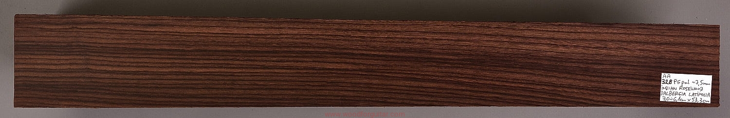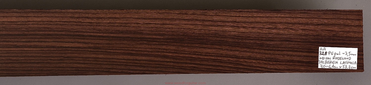 Bardzo popularne i klasyczne drewno, używane od lat głównie na podstrunnice w gitarach elektrycznych, basowych oraz akustycznych. Jak wskazuje nazwa, pochodzi głównie z Indii, ale także rośnie i jest pozyskiwane na Sri Lance oraz w Indonezji. Tonalnie palisander indyjski jest określany jako ciepłobrzmiący, nie oznacza to jednak, że brakuje mu tzw. góry. Kiedy potrzeba generuje zaokrąglone łagodnie brzmiące wysokie przydźwięki i idealnie sprawdza się w instrumentach przeznaczonych do muzyki bluesowej, rockowej lub w instrumentach uniwersalnych. Drewno jest stosunkowo tanie (raczej już niestety było tanie), jednak wysokiej klasy kawałki osiągają ceny porównywalne z czarnym hebanem, dotyczy to również kawałków unikalnych, o specyficznych cechach. Kawałek na podstrunnicę może kosztować 15 dolarów, ale może też kosztować 50 dolarów oraz więcej. Wygląd palisandra indyjskiego lubi się znacznie różnić. W zależności m.in. od warunków w jakich rosło drzewo, drewno przybiera barwę prawie czarną z ciemno-brązowymi pręgami, najczęściej jednak ma charakterystyczne zabarwienie brązowe, przechodzące w ciemny fiolet, czasami z jaśniejszymi beżowo-żółto-czerwonymi akcentami/pasami. Łatwe w obróbce, pięknie pachnie, a z powodu dużej zawartości olejków własnych nie wymaga lakierowania. W gotowym instrumencie do czyszczenia i impregnowania wystarczy tylko używać popularnego olejku cytrynowego. Po wyszlifowaniu jest aksamitne w dotyku z wyczuwalnymi porami. Drewno jest mocne, twarde, odporne na ścieranie, pory drewna są dosyć duże i szerokie. Palisander indyjski to wspaniałe i magiczne drewno, które słyszymy w muzyce od pokoleń. Niestety, wieloletnie niekontrolowane masowe wycinki drzew tego gatunku doprowadziły do zbyt daleko posuniętego zaniku palisandra indyjskiego w przyrodzie, dlatego podjęto decyzję o objęciu tego gatunku szczególną ochroną i wpisaniu go na listę gatunków zagrożonych (CITES). Sprzedaż gatunku Dalbergia latifolia prowadzimy tylko do krajów Unii Europejskiej, proszę mieć na uwadze, że wszelkie przekroczenia granicy UE instrumentu z nawet niewielkim elementem wykonanym z tego drewna z/do Unii Europejskiej wymagają specjalnych pozwoleń Ministerstwa Środowiska lub odpowiednika tej instytucji w danym kraju. Brak pozwoleń skutkuje zarekwirowaniem drewna lub całego instrumentu przez służby celne.