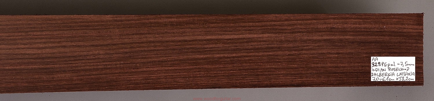 Bardzo popularne i klasyczne drewno, używane od lat głównie na podstrunnice w gitarach elektrycznych, basowych oraz akustycznych. Jak wskazuje nazwa, pochodzi głównie z Indii, ale także rośnie i jest pozyskiwane na Sri Lance oraz w Indonezji. Tonalnie palisander indyjski jest określany jako ciepłobrzmiący, nie oznacza to jednak, że brakuje mu tzw. góry. Kiedy potrzeba generuje zaokrąglone łagodnie brzmiące wysokie przydźwięki i idealnie sprawdza się w instrumentach przeznaczonych do muzyki bluesowej, rockowej lub w instrumentach uniwersalnych. Drewno jest stosunkowo tanie (raczej już niestety było tanie), jednak wysokiej klasy kawałki osiągają ceny porównywalne z czarnym hebanem, dotyczy to również kawałków unikalnych, o specyficznych cechach. Kawałek na podstrunnicę może kosztować 15 dolarów, ale może też kosztować 50 dolarów oraz więcej. Wygląd palisandra indyjskiego lubi się znacznie różnić. W zależności m.in. od warunków w jakich rosło drzewo, drewno przybiera barwę prawie czarną z ciemno-brązowymi pręgami, najczęściej jednak ma charakterystyczne zabarwienie brązowe, przechodzące w ciemny fiolet, czasami z jaśniejszymi beżowo-żółto-czerwonymi akcentami/pasami. Łatwe w obróbce, pięknie pachnie, a z powodu dużej zawartości olejków własnych nie wymaga lakierowania. W gotowym instrumencie do czyszczenia i impregnowania wystarczy tylko używać popularnego olejku cytrynowego. Po wyszlifowaniu jest aksamitne w dotyku z wyczuwalnymi porami. Drewno jest mocne, twarde, odporne na ścieranie, pory drewna są dosyć duże i szerokie. Palisander indyjski to wspaniałe i magiczne drewno, które słyszymy w muzyce od pokoleń. Niestety, wieloletnie niekontrolowane masowe wycinki drzew tego gatunku doprowadziły do zbyt daleko posuniętego zaniku palisandra indyjskiego w przyrodzie, dlatego podjęto decyzję o objęciu tego gatunku szczególną ochroną i wpisaniu go na listę gatunków zagrożonych (CITES). Sprzedaż gatunku Dalbergia latifolia prowadzimy tylko do krajów Unii Europejskiej, proszę mieć na uwadze, że wszelkie przekroczenia granicy UE instrumentu z nawet niewielkim elementem wykonanym z tego drewna z/do Unii Europejskiej wymagają specjalnych pozwoleń Ministerstwa Środowiska lub odpowiednika tej instytucji w danym kraju. Brak pozwoleń skutkuje zarekwirowaniem drewna lub całego instrumentu przez służby celne.