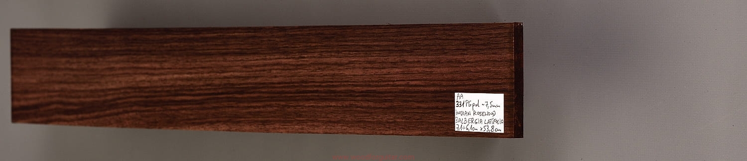 Bardzo popularne i klasyczne drewno, używane od lat głównie na podstrunnice w gitarach elektrycznych, basowych oraz akustycznych. Jak wskazuje nazwa, pochodzi głównie z Indii, ale także rośnie i jest pozyskiwane na Sri Lance oraz w Indonezji. Tonalnie palisander indyjski jest określany jako ciepłobrzmiący, nie oznacza to jednak, że brakuje mu tzw. góry. Kiedy potrzeba generuje zaokrąglone łagodnie brzmiące wysokie przydźwięki i idealnie sprawdza się w instrumentach przeznaczonych do muzyki bluesowej, rockowej lub w instrumentach uniwersalnych. Drewno jest stosunkowo tanie (raczej już niestety było tanie), jednak wysokiej klasy kawałki osiągają ceny porównywalne z czarnym hebanem, dotyczy to również kawałków unikalnych, o specyficznych cechach. Kawałek na podstrunnicę może kosztować 15 dolarów, ale może też kosztować 50 dolarów oraz więcej. Wygląd palisandra indyjskiego lubi się znacznie różnić. W zależności m.in. od warunków w jakich rosło drzewo, drewno przybiera barwę prawie czarną z ciemno-brązowymi pręgami, najczęściej jednak ma charakterystyczne zabarwienie brązowe, przechodzące w ciemny fiolet, czasami z jaśniejszymi beżowo-żółto-czerwonymi akcentami/pasami. Łatwe w obróbce, pięknie pachnie, a z powodu dużej zawartości olejków własnych nie wymaga lakierowania. W gotowym instrumencie do czyszczenia i impregnowania wystarczy tylko używać popularnego olejku cytrynowego. Po wyszlifowaniu jest aksamitne w dotyku z wyczuwalnymi porami. Drewno jest mocne, twarde, odporne na ścieranie, pory drewna są dosyć duże i szerokie. Palisander indyjski to wspaniałe i magiczne drewno, które słyszymy w muzyce od pokoleń. Niestety, wieloletnie niekontrolowane masowe wycinki drzew tego gatunku doprowadziły do zbyt daleko posuniętego zaniku palisandra indyjskiego w przyrodzie, dlatego podjęto decyzję o objęciu tego gatunku szczególną ochroną i wpisaniu go na listę gatunków zagrożonych (CITES). Sprzedaż gatunku Dalbergia latifolia prowadzimy tylko do krajów Unii Europejskiej, proszę mieć na uwadze, że wszelkie przekroczenia granicy UE instrumentu z nawet niewielkim elementem wykonanym z tego drewna z/do Unii Europejskiej wymagają specjalnych pozwoleń Ministerstwa Środowiska lub odpowiednika tej instytucji w danym kraju. Brak pozwoleń skutkuje zarekwirowaniem drewna lub całego instrumentu przez służby celne.