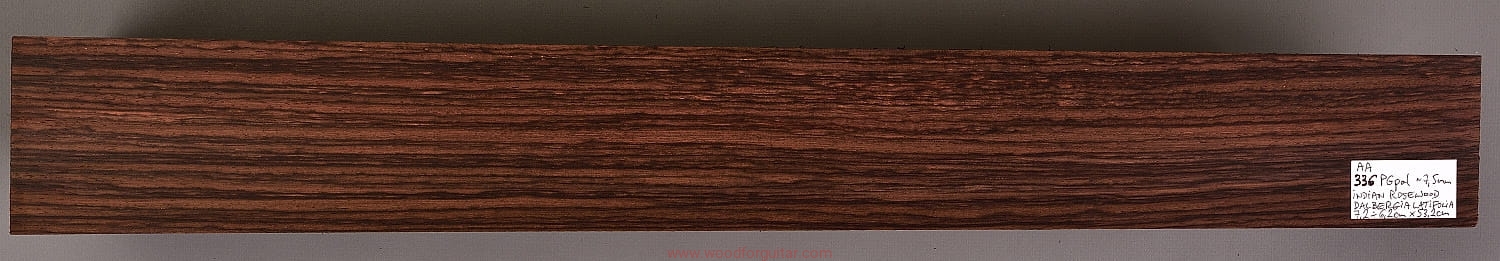 Bardzo popularne i klasyczne drewno, używane od lat głównie na podstrunnice w gitarach elektrycznych, basowych oraz akustycznych. Jak wskazuje nazwa, pochodzi głównie z Indii, ale także rośnie i jest pozyskiwane na Sri Lance oraz w Indonezji. Tonalnie palisander indyjski jest określany jako ciepłobrzmiący, nie oznacza to jednak, że brakuje mu tzw. góry. Kiedy potrzeba generuje zaokrąglone łagodnie brzmiące wysokie przydźwięki i idealnie sprawdza się w instrumentach przeznaczonych do muzyki bluesowej, rockowej lub w instrumentach uniwersalnych. Drewno jest stosunkowo tanie (raczej już niestety było tanie), jednak wysokiej klasy kawałki osiągają ceny porównywalne z czarnym hebanem, dotyczy to również kawałków unikalnych, o specyficznych cechach. Kawałek na podstrunnicę może kosztować 15 dolarów, ale może też kosztować 50 dolarów oraz więcej. Wygląd palisandra indyjskiego lubi się znacznie różnić. W zależności m.in. od warunków w jakich rosło drzewo, drewno przybiera barwę prawie czarną z ciemno-brązowymi pręgami, najczęściej jednak ma charakterystyczne zabarwienie brązowe, przechodzące w ciemny fiolet, czasami z jaśniejszymi beżowo-żółto-czerwonymi akcentami/pasami. Łatwe w obróbce, pięknie pachnie, a z powodu dużej zawartości olejków własnych nie wymaga lakierowania. W gotowym instrumencie do czyszczenia i impregnowania wystarczy tylko używać popularnego olejku cytrynowego. Po wyszlifowaniu jest aksamitne w dotyku z wyczuwalnymi porami. Drewno jest mocne, twarde, odporne na ścieranie, pory drewna są dosyć duże i szerokie. Palisander indyjski to wspaniałe i magiczne drewno, które słyszymy w muzyce od pokoleń. Niestety, wieloletnie niekontrolowane masowe wycinki drzew tego gatunku doprowadziły do zbyt daleko posuniętego zaniku palisandra indyjskiego w przyrodzie, dlatego podjęto decyzję o objęciu tego gatunku szczególną ochroną i wpisaniu go na listę gatunków zagrożonych (CITES). Sprzedaż gatunku Dalbergia latifolia prowadzimy tylko do krajów Unii Europejskiej, proszę mieć na uwadze, że wszelkie przekroczenia granicy UE instrumentu z nawet niewielkim elementem wykonanym z tego drewna z/do Unii Europejskiej wymagają specjalnych pozwoleń Ministerstwa Środowiska lub odpowiednika tej instytucji w danym kraju. Brak pozwoleń skutkuje zarekwirowaniem drewna lub całego instrumentu przez służby celne.