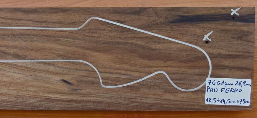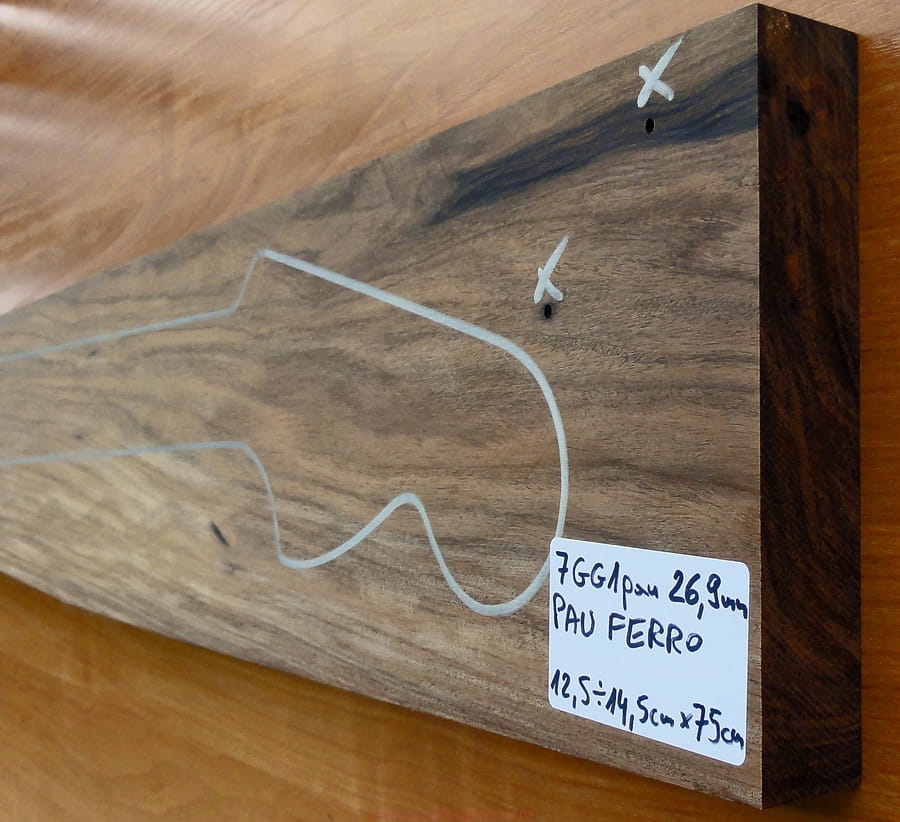 Pau Ferro pochodzi głównie z tropikalnych lasów Brazylii oraz Boliwii. Drewno w wyglądzie jest jasnobrązowe z nieco ciemniejszym i regularnymi brązowymi liniami. Włókna przebiegają regularnie, wizualnie bardzo klasyczne i przewidywalne, kolorystyka nieco jaśniejsza od wszelkich odmian palisandru. Pau Ferro, pomimo że nazywany jest palisandrem, formalnie palisandrem nie jest, ma bardzo podobne właściwości fizyczne, wytrzymałościowe (w porównaniu z palisandrami ma bardziej zwartą strukturę bez wyraźnych głębokich porów). Akustycznie w porównaniu do palisandrów generuje twardsze dźwięki. Jeżeli uważasz, że palisander indyjski brzmi zbyt ciepło, a heban i klon jest za twardy brzmieniowo, to właśnie Pau Ferro sprawdzi się doskonale. To jest wspaniałe drewno na podstrunnice, podatne na artykulację, szybko się odzywa, nie wymaga lakierowania, jest miłe w dotyku, brzmi bardzo szlachetnie i łamie stereotypy, że na podstrunnicę idealny jest tylko palisander, klon lub heban. Tradycja tradycją, ale idąc z duchem czasu warto sięgnąć po mniej znane drewno. To nie jest tańsza alternatywa, to nie jest zamiennik, to jest w 100% odpowiednie drewno na instrumenty, na podstrunnice i gryfy szczególnie polecamy. Dobrej klasy Pau Ferro powinno się cenowo kształtować tak jak czarny heban, będzie jednak cieplejsze brzmieniowo i wizualnie. Egzotyka, nowa wizja, nowa jakość.