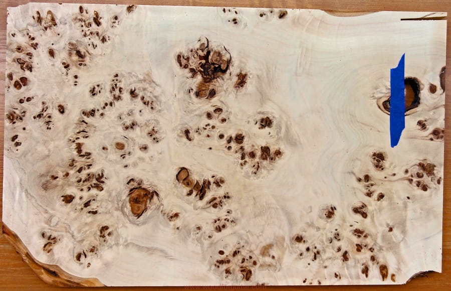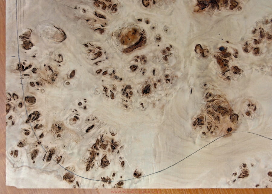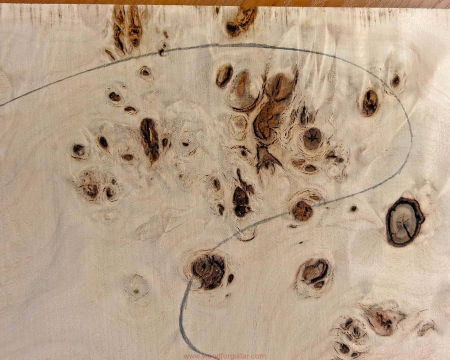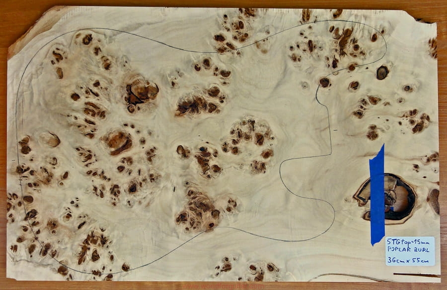 (1-częściowy kawałek drewna, nieregularne, głębokie, mieniące się w świetle fale oraz widoczne liczne luźne struktury sprawiają, że drewno wizualnie jest bardzo dynamiczne. Luźne struktury oraz perforacje należy samodzielnie wypełnić np. bezbarwną lub kontrastową masą kleju epoksydowego, ewentualnie dedykowaną masą z zawartością pyłu drzewnego. Proces ten najlepiej przeprowadzić przed oraz po obróbce drewna, wymagane jest doświadczenie w pracy z tego typu drewnem. Grubość pozwala na zastosowanie w konstrukcji gitary/ gitary basowej z profilowanym topem lub typu „kanapka”. Wyjątkowe drewno do wysokiej klasy instrumentu Custom)…