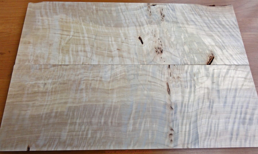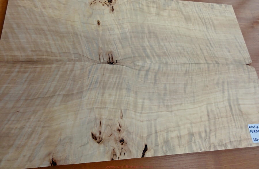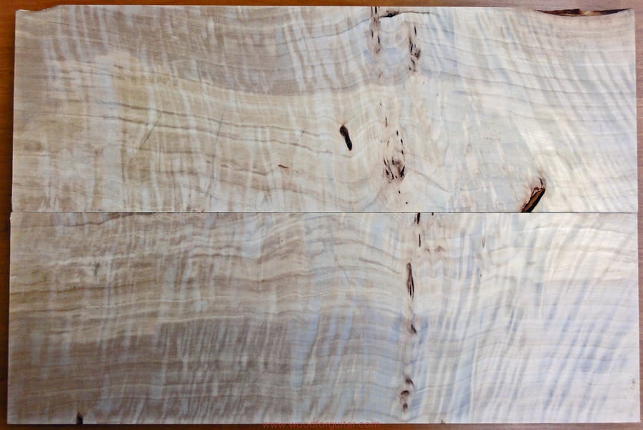 (2-częściowy zestaw drewna, rozcięte metodą książkową, tzw. bookmatched, cięte „w ćwiartkę” – słoje w przekroju prostopadłe do powierzchni, zakrzywiony przebieg przyrostów wzdłuż materiału. Nieregularne, głębokie, mieniące się w świetle fale oraz widoczne luźne struktury sprawiają, że drewno wizualnie jest bardzo dynamiczne. Luźne struktury oraz perforacje należy samodzielnie wypełnić kontrastową masą kleju epoksydowego lub dedykowaną masą z zawartością pyłu drzewnego. Proces ten najlepiej przeprowadzić przed oraz po obróbce drewna. Grubość tego zestawu pozwala na zastosowanie w konstrukcji z profilowanym topem lub typu „kanapka”. Wyjątkowe drewno do wysokiej klasy instrumentu)…