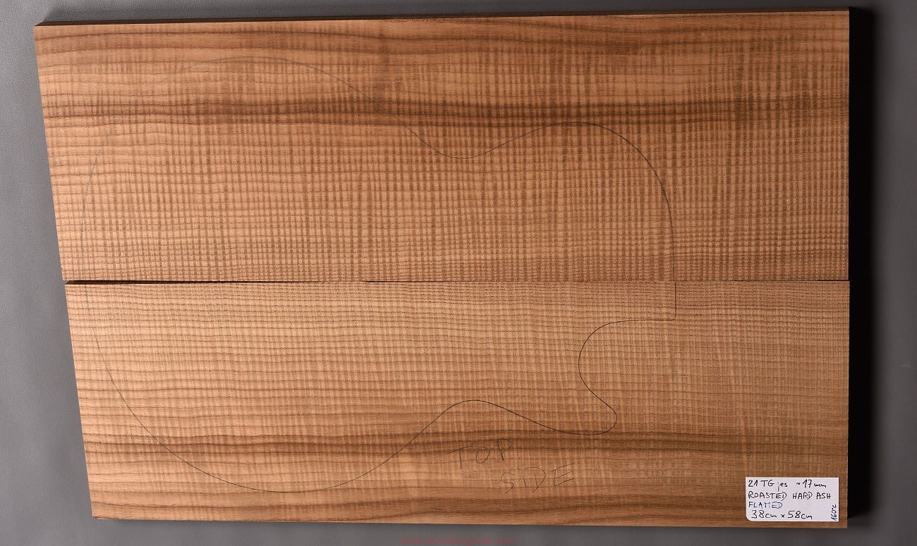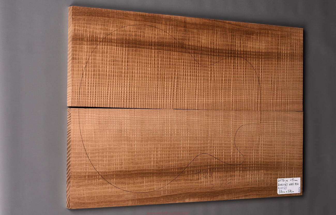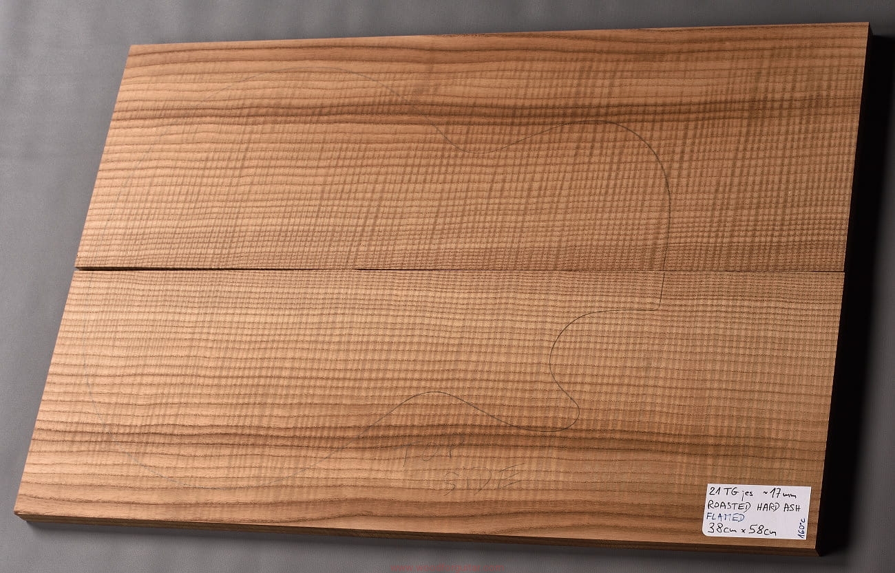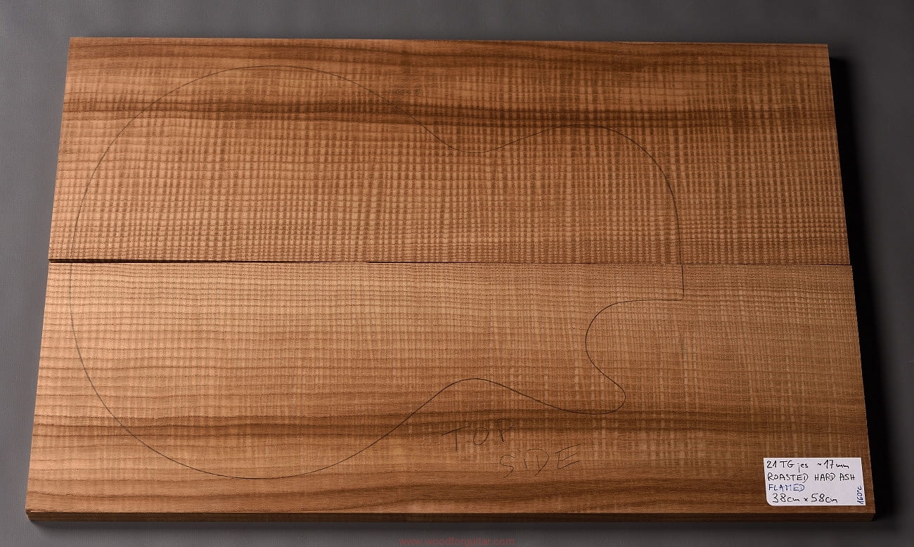 (2-częściowy zestaw wysokiej klasy drewna jesionowego falistego średniej-wysokiej gęstości, poddanego procesowi termowania, wielkość wystarczająca do większości projektów jako top korpusu. Polecamy do customowego instrumentu z górnej półki. Uwaga, w wyniku procesu pieczenia, drewno ma na stałe zmieniony kolor, jest nieco ciemniejsze, niż jesion nie poddany temu procesowi… kilka słów o procesie postarzania drewna metodą pieczenia można znaleźć nieco dalej…)…