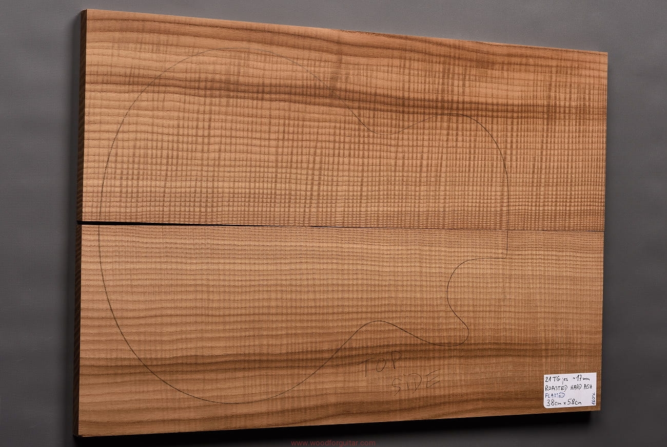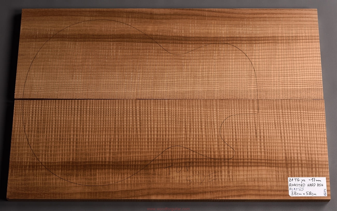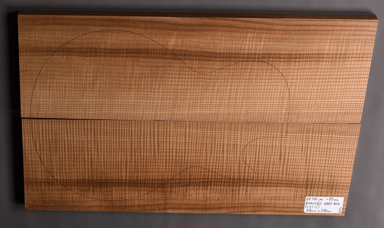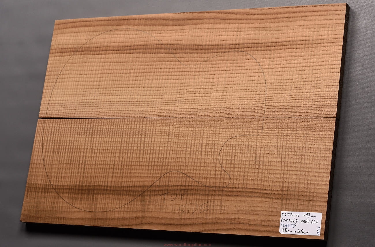 (2-częściowy zestaw wysokiej klasy drewna jesionowego falistego średniej-wysokiej gęstości, poddanego procesowi termowania, wielkość wystarczająca do większości projektów jako top korpusu. Polecamy do customowego instrumentu z górnej półki. Uwaga, w wyniku procesu pieczenia, drewno ma na stałe zmieniony kolor, jest nieco ciemniejsze, niż jesion nie poddany temu procesowi… kilka słów o procesie postarzania drewna metodą pieczenia można znaleźć nieco dalej…)…