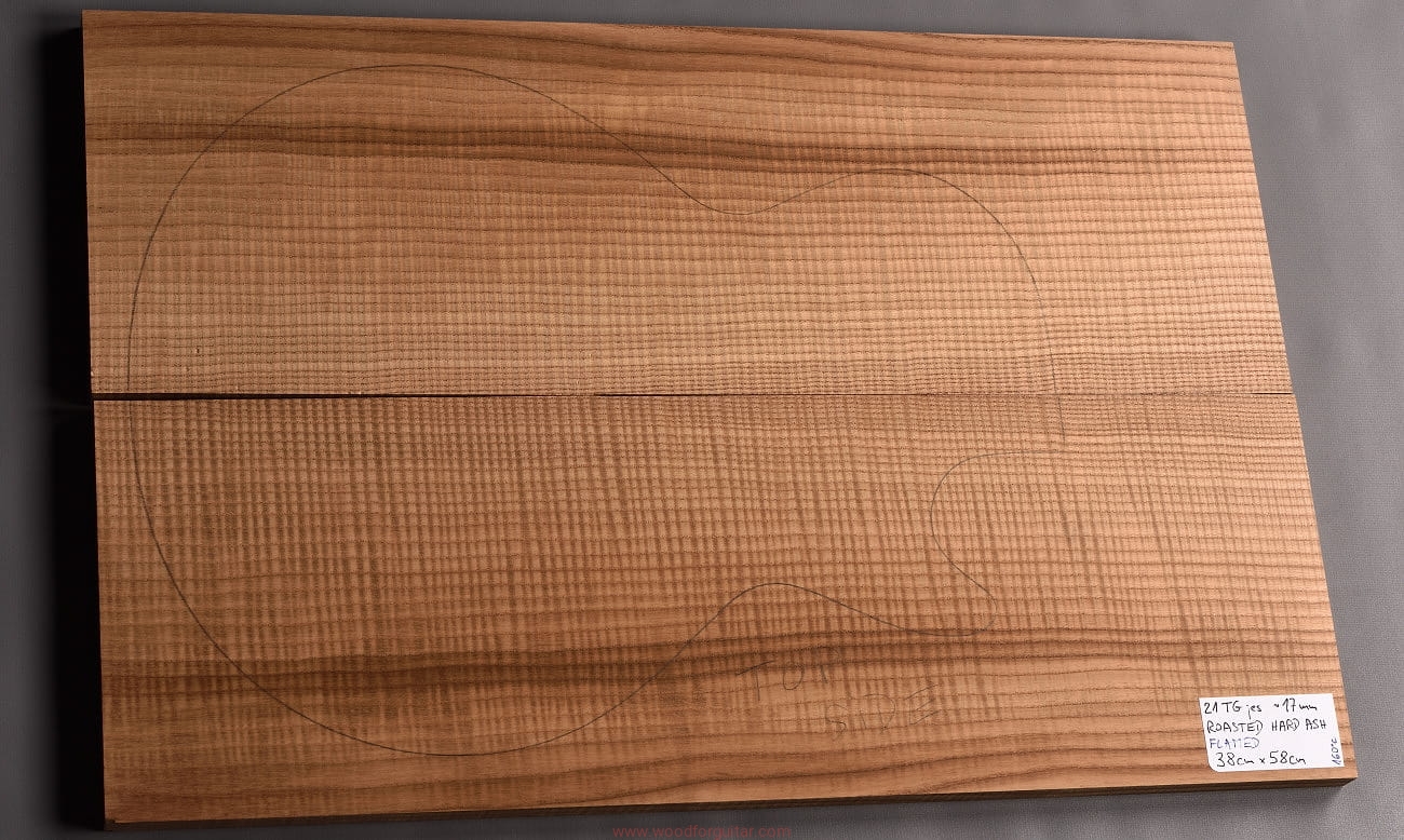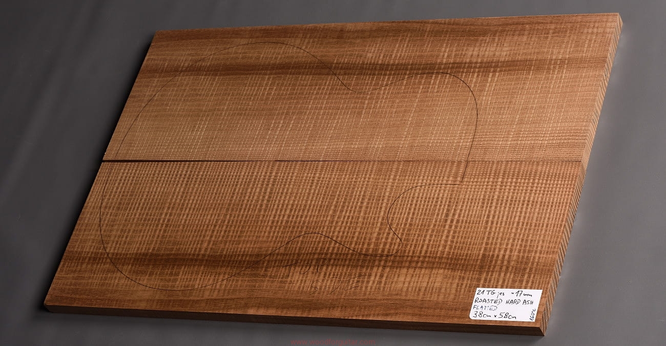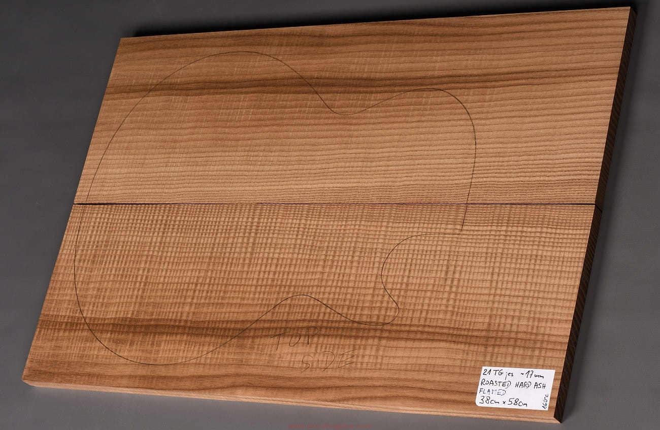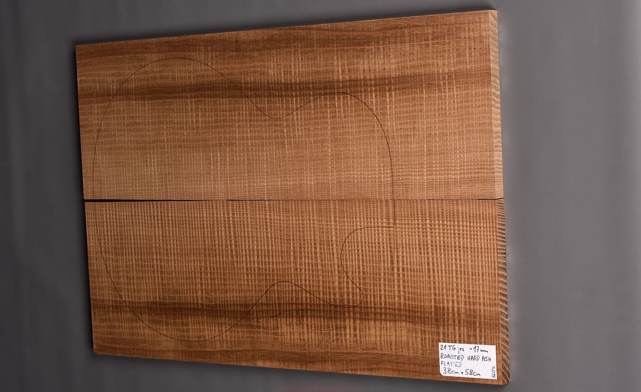 (2-częściowy zestaw wysokiej klasy drewna jesionowego falistego średniej-wysokiej gęstości, poddanego procesowi termowania, wielkość wystarczająca do większości projektów jako top korpusu. Polecamy do customowego instrumentu z górnej półki. Uwaga, w wyniku procesu pieczenia, drewno ma na stałe zmieniony kolor, jest nieco ciemniejsze, niż jesion nie poddany temu procesowi… kilka słów o procesie postarzania drewna metodą pieczenia można znaleźć nieco dalej…)…