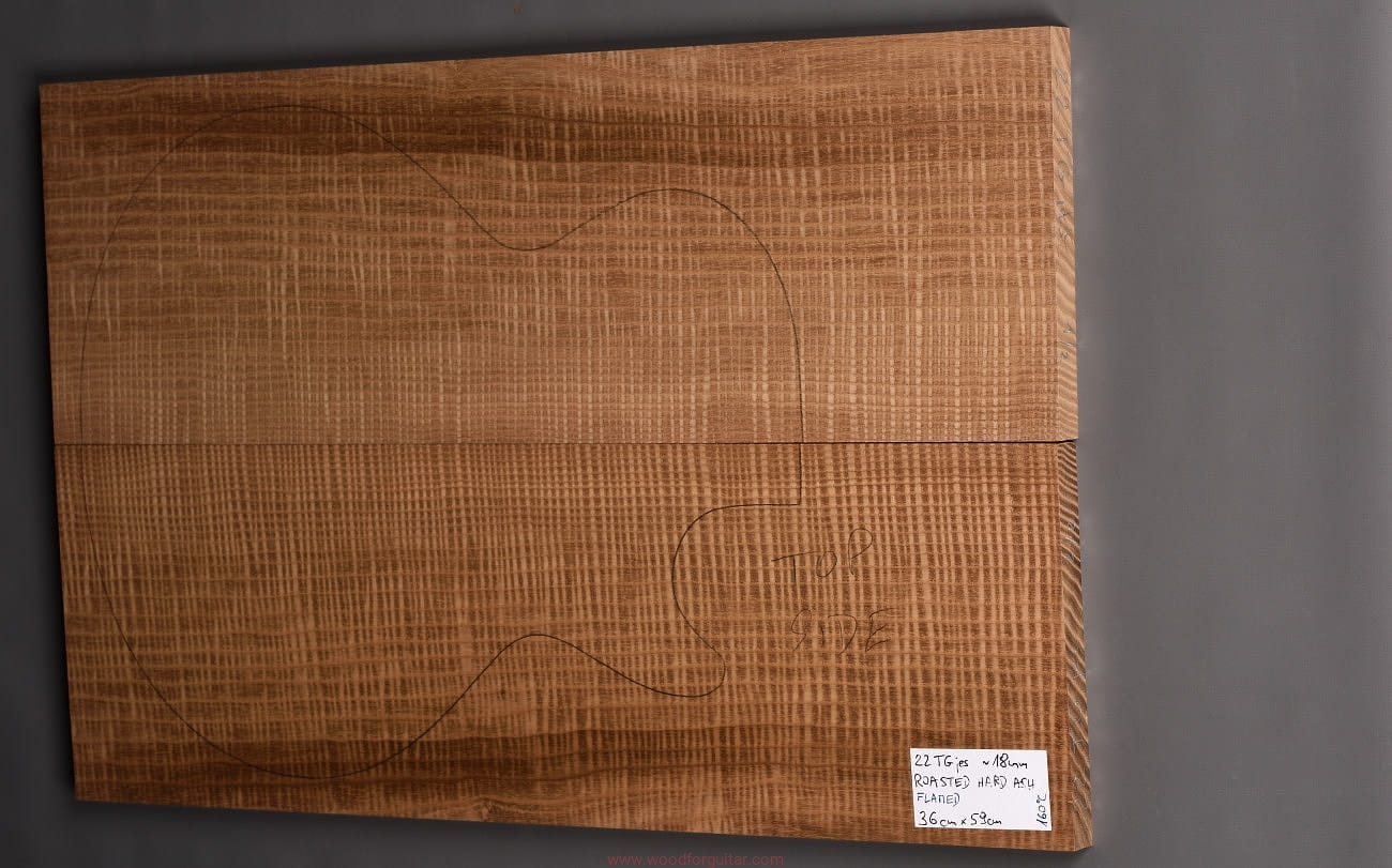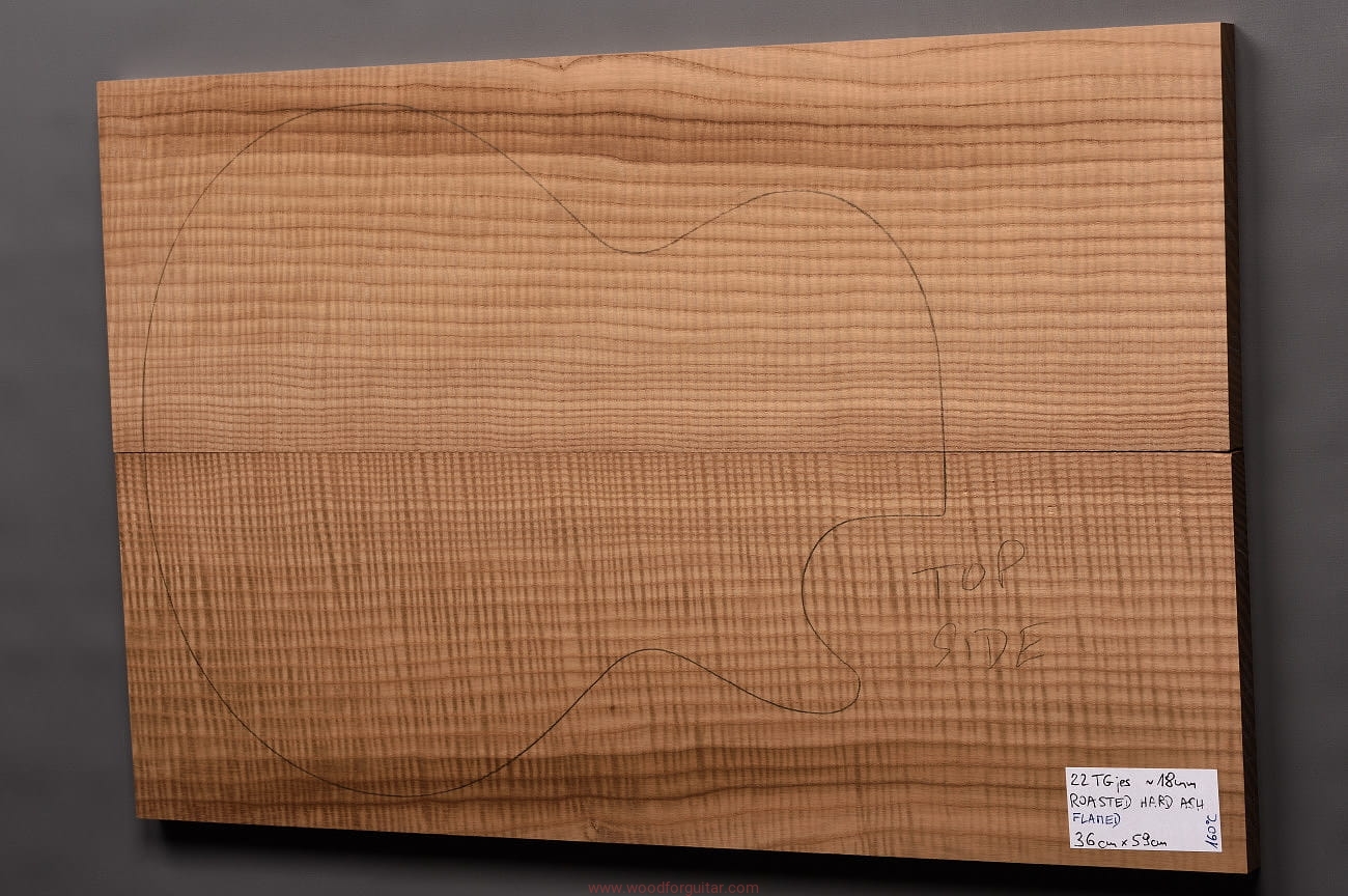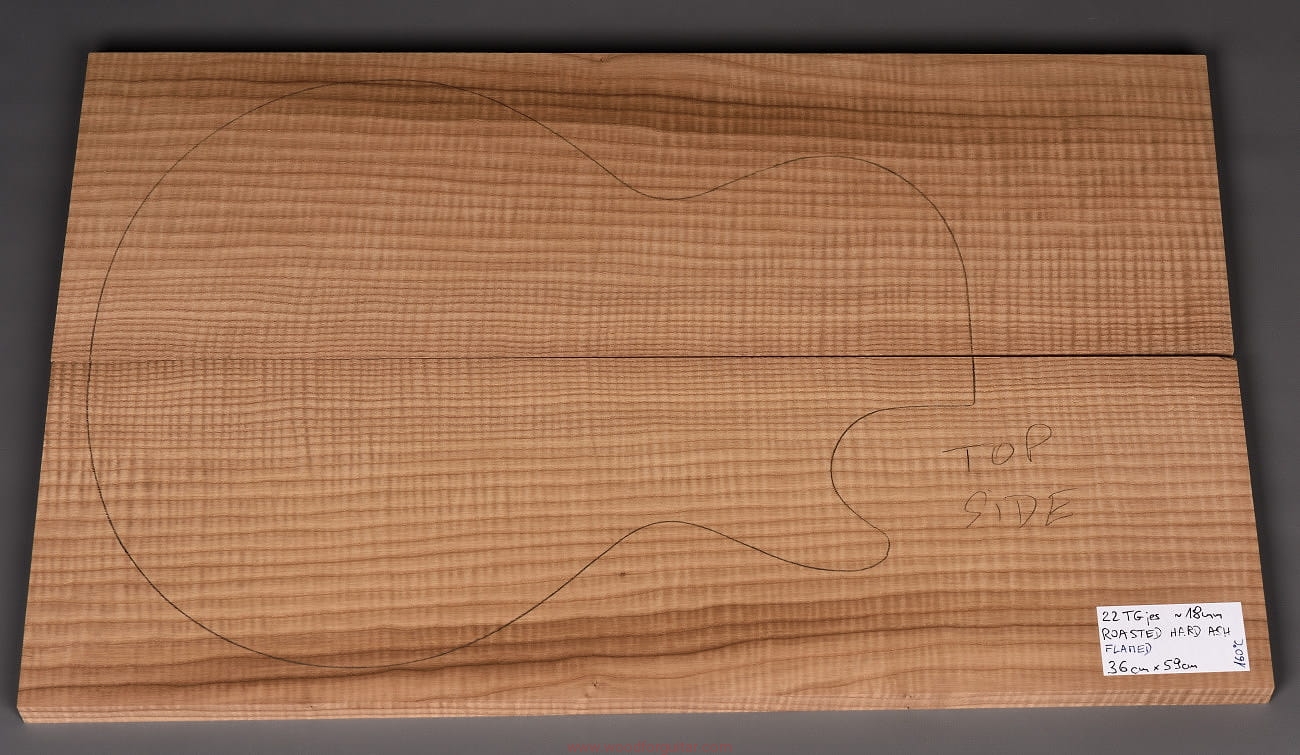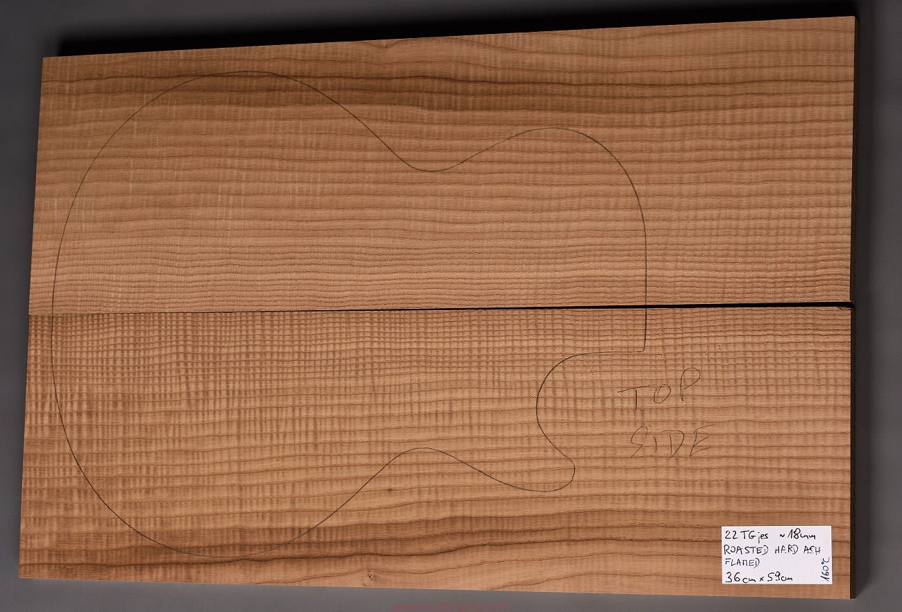 (2-częściowy zestaw wysokiej klasy drewna jesionowego falistego średniej-wysokiej gęstości, poddanego procesowi termowania, wielkość wystarczająca do większości projektów jako top korpusu. Polecamy do customowego instrumentu z górnej półki. Uwaga, w wyniku procesu pieczenia, drewno ma na stałe zmieniony kolor, jest nieco ciemniejsze, niż jesion nie poddany temu procesowi… kilka słów o procesie postarzania drewna metodą pieczenia można znaleźć nieco dalej…)…