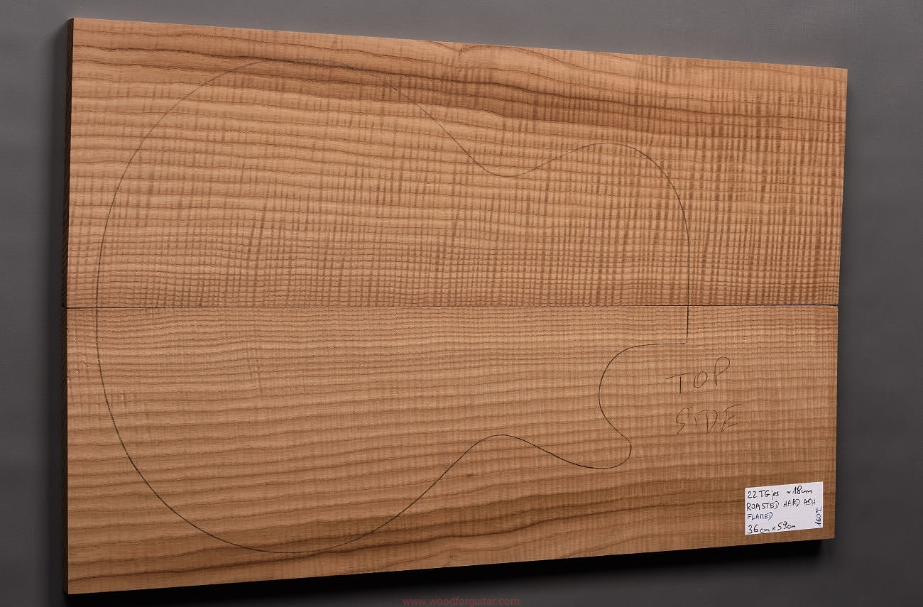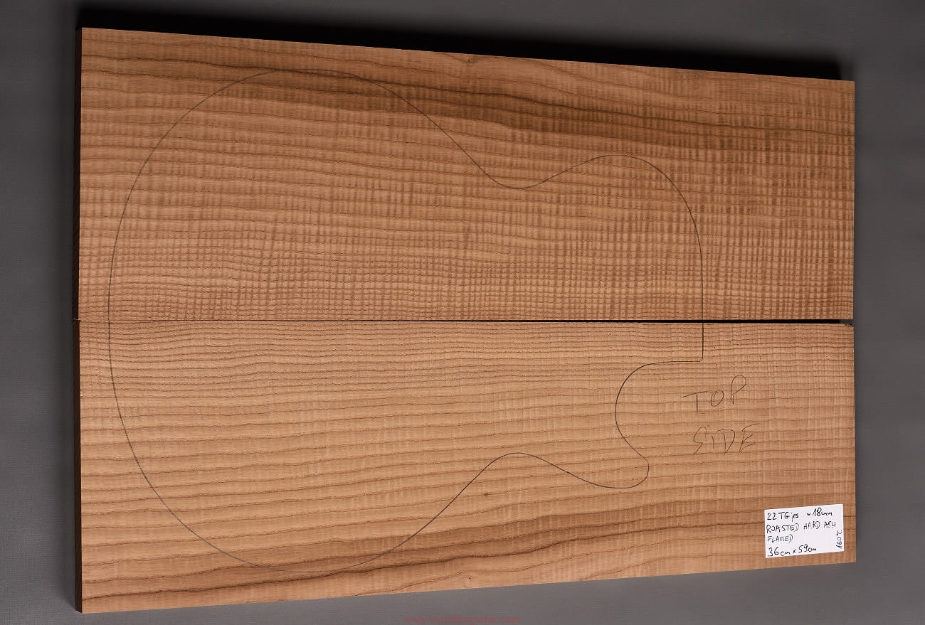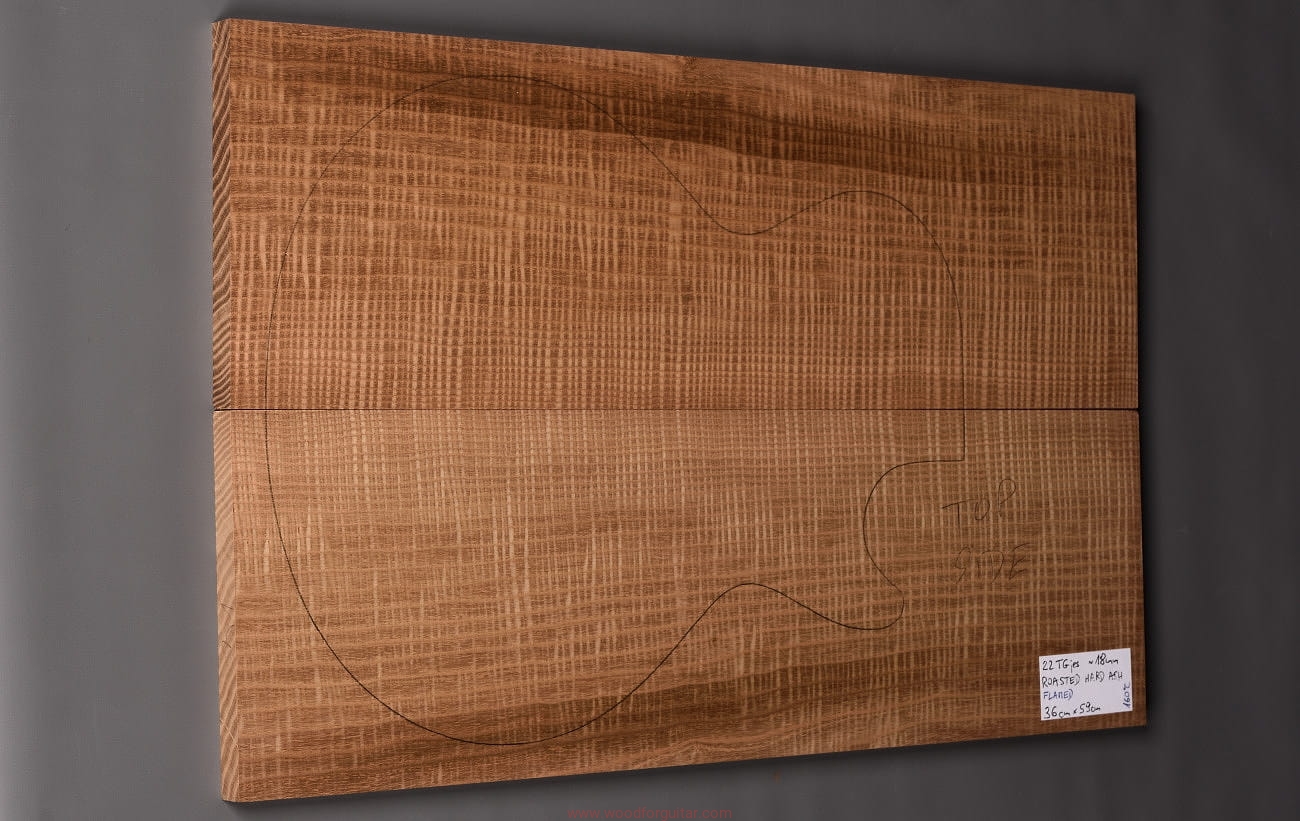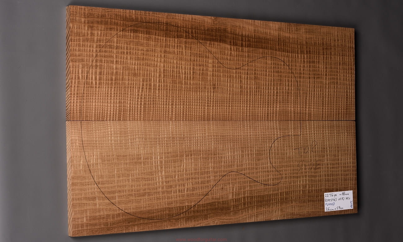 (2-częściowy zestaw wysokiej klasy drewna jesionowego falistego średniej-wysokiej gęstości, poddanego procesowi termowania, wielkość wystarczająca do większości projektów jako top korpusu. Polecamy do customowego instrumentu z górnej półki. Uwaga, w wyniku procesu pieczenia, drewno ma na stałe zmieniony kolor, jest nieco ciemniejsze, niż jesion nie poddany temu procesowi… kilka słów o procesie postarzania drewna metodą pieczenia można znaleźć nieco dalej…)…