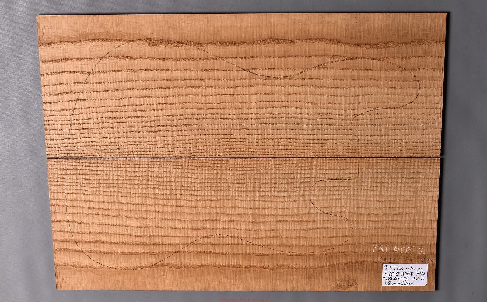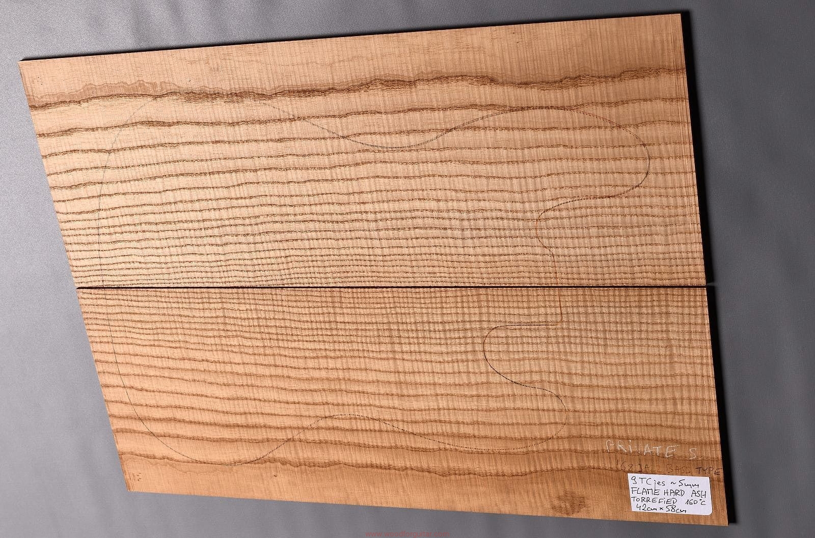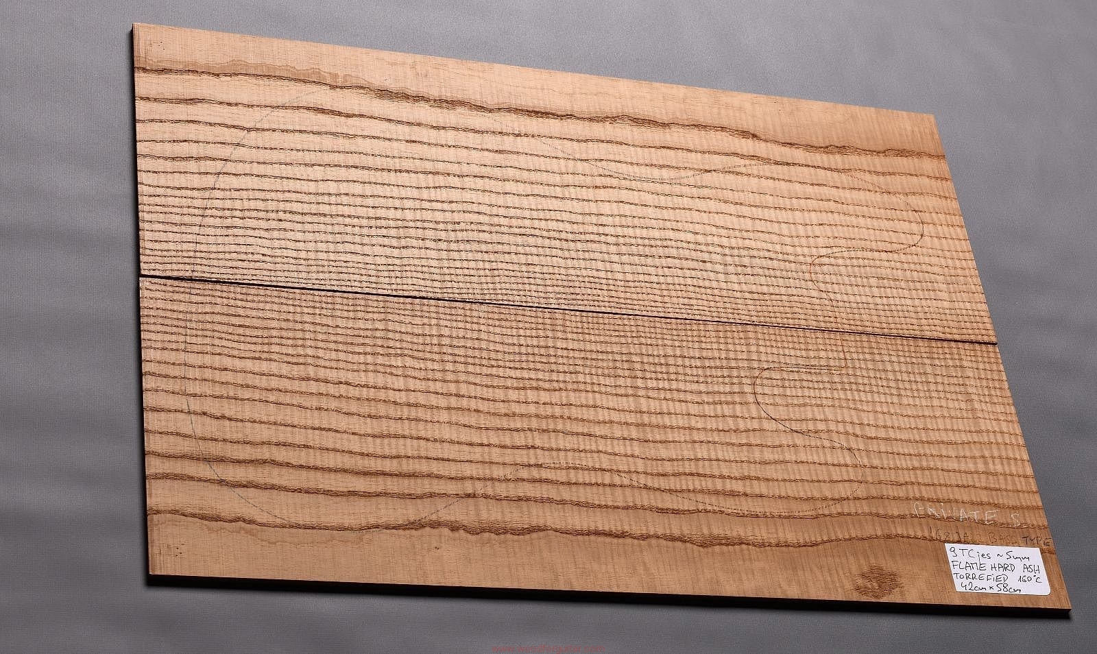 (2-częściowy zestaw wysokiej klasy drewna jesionowego falistego wysokiej gęstości, poddanego procesowi termowania, wielkość wystarczająca do większości projektów jako top korpusu, rysunek przedstawia kształt korpusu typu ’68 Jazz Bass. Polecamy do customowego instrumentu z górnej półki. Uwaga, w wyniku procesu pieczenia, drewno ma na stałe zmieniony kolor, jest ciemniejsze, niż jesion nie poddany temu procesowi… kilka słów o procesie postarzania drewna metodą pieczenia można znaleźć nieco dalej…)…