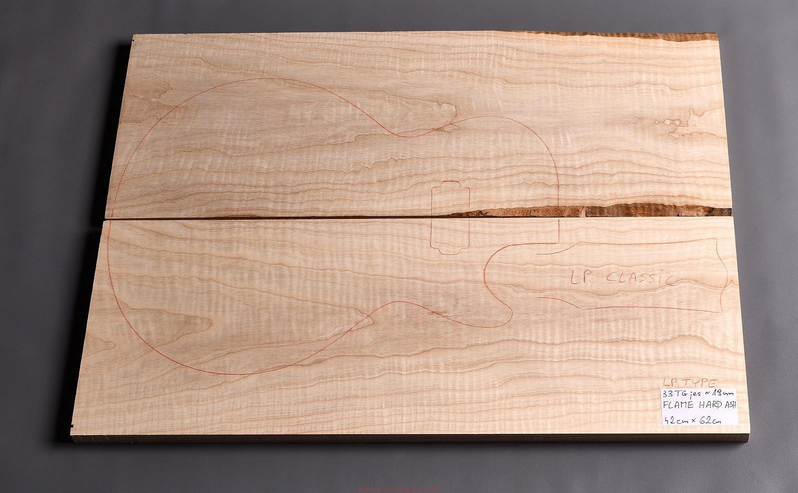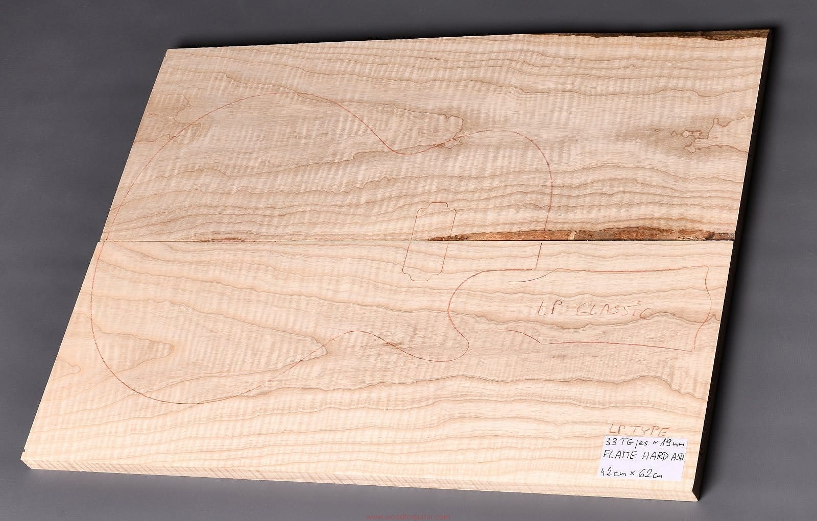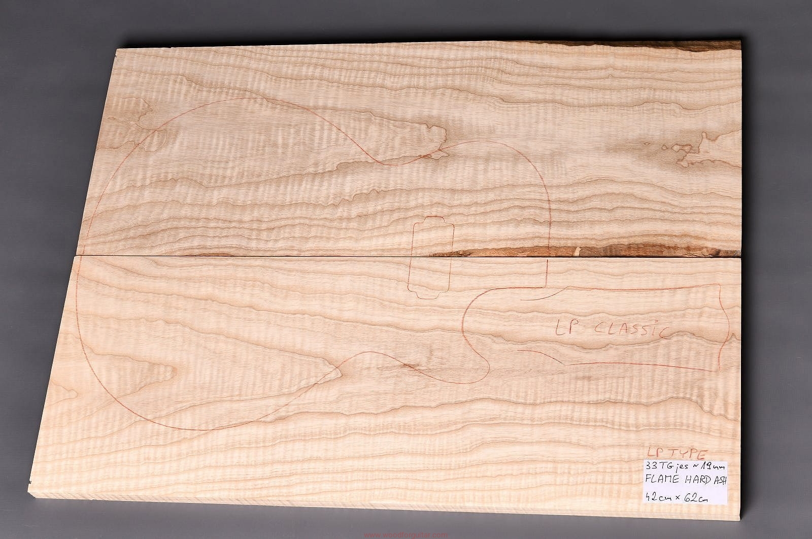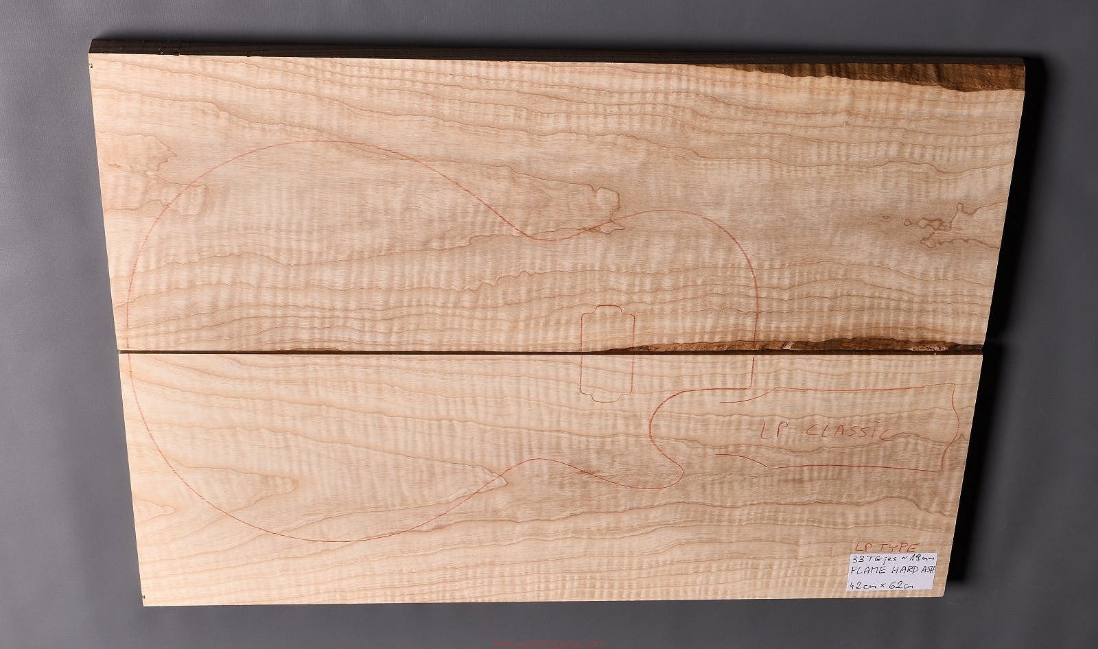 (2-częściowy zestaw wysokiej klasy drewna jesionowego falistego wysokiej gęstości, wielkość wystarczająca do większości projektów jako top korpusu, rysunek przedstawia kształt korpusu typu Les Paul. Polecamy do customowego instrumentu z górnej półki. Uwaga, od tylnej strony zaznaczona wada drewna do samodzielnej naprawy)…