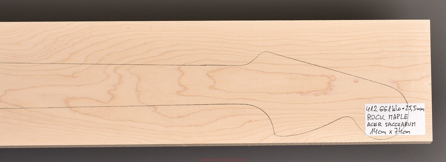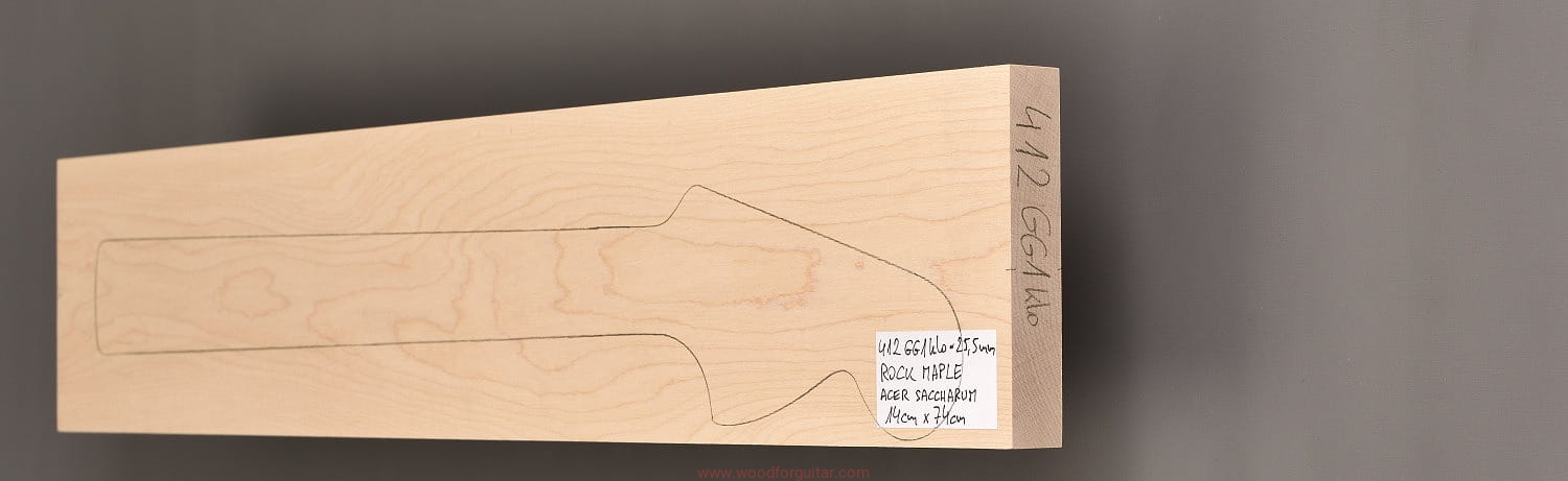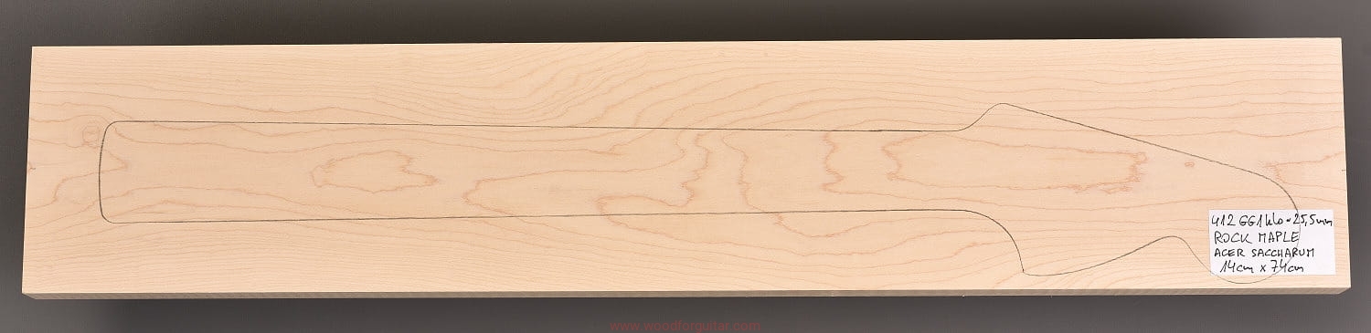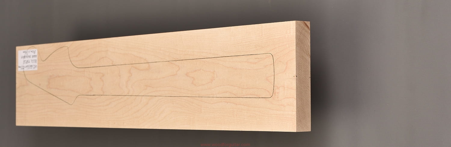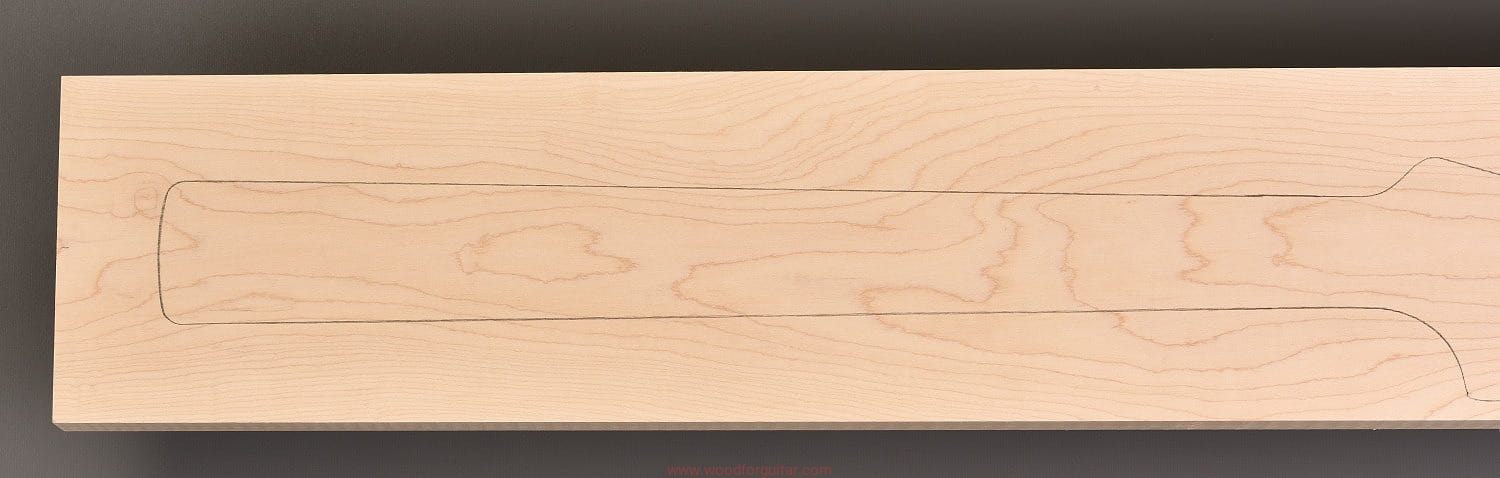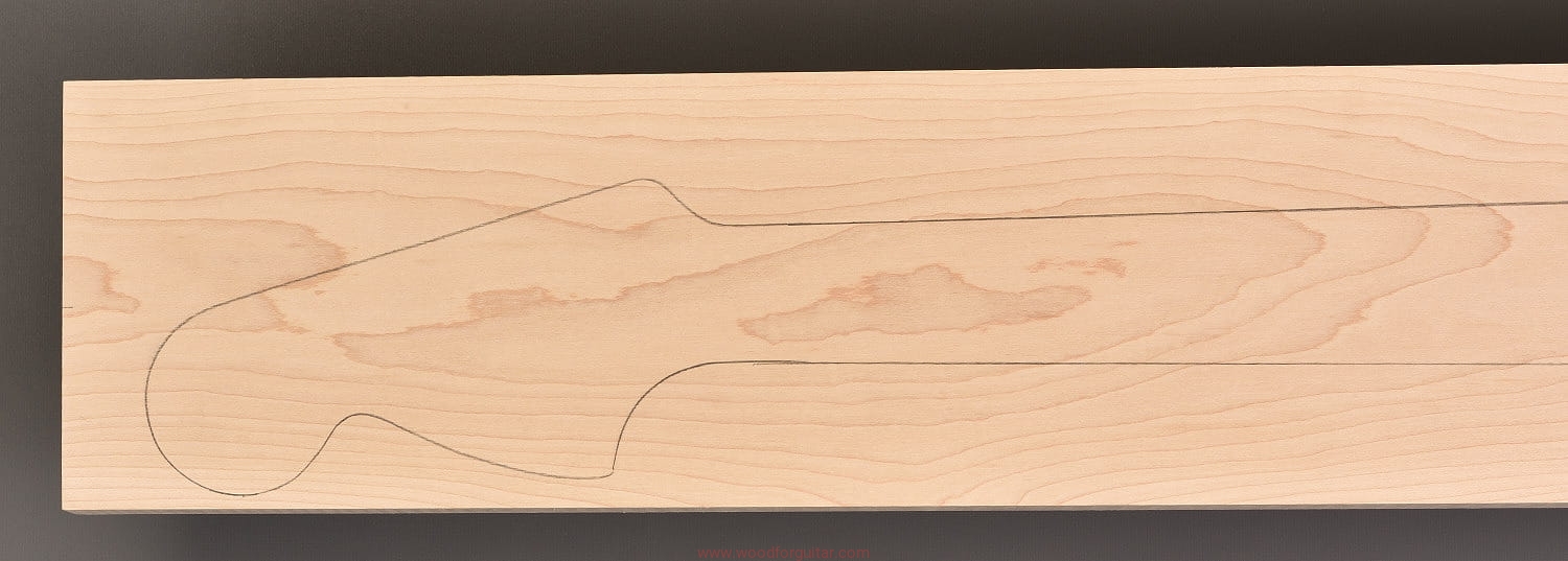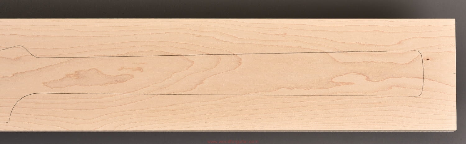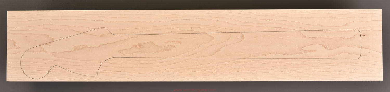 (1 kawałek drewna wysokiej gęstości, cięte płasko/stycznie – słoje w przekroju równoległe lub prawie równoległe do powierzchni. W formatkę wrysowano kształt gryfu typu Strat. Jak zawsze, dla zwiększenia stabilności gryfu, polecamy dodatkowo użycie podstrunnicy wykonanej z palisandru, hebanu, lub też Pau Ferro, które brzmieniowo doskonale uzupełniają się z klonem)…
