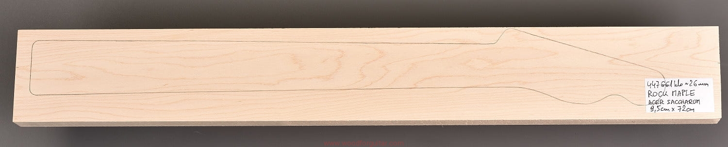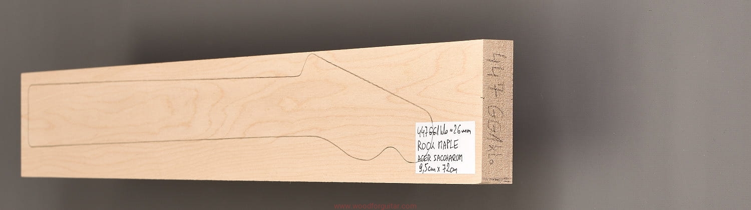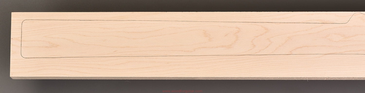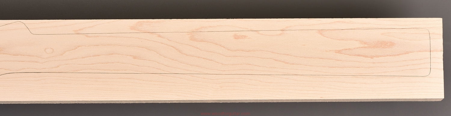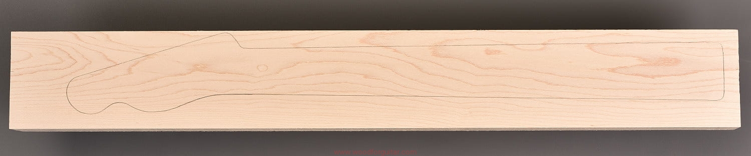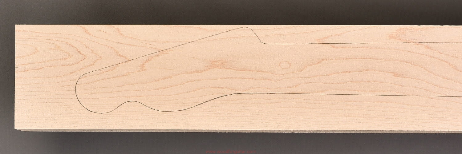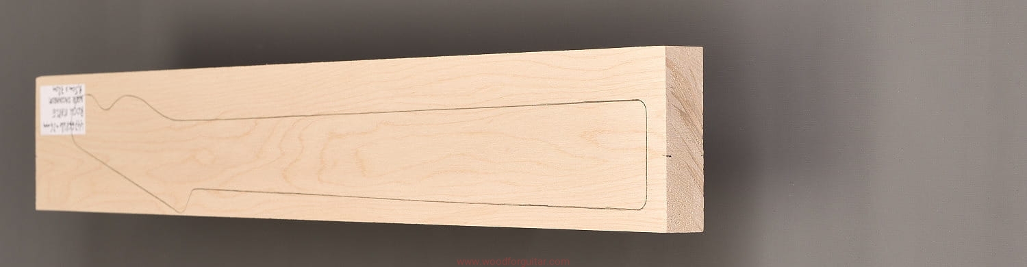 (1 kawałek drewna średniej gęstości, cięte płasko/stycznie – słoje w przekroju równoległe lub prawie równoległe do powierzchni. W formatkę wrysowano kształt gryfu typu Tele. Jak zawsze, dla zwiększenia stabilności gryfu, polecamy dodatkowo użycie podstrunnicy wykonanej z palisandru, hebanu, lub też Pau Ferro, które brzmieniowo doskonale uzupełniają się z klonem)…