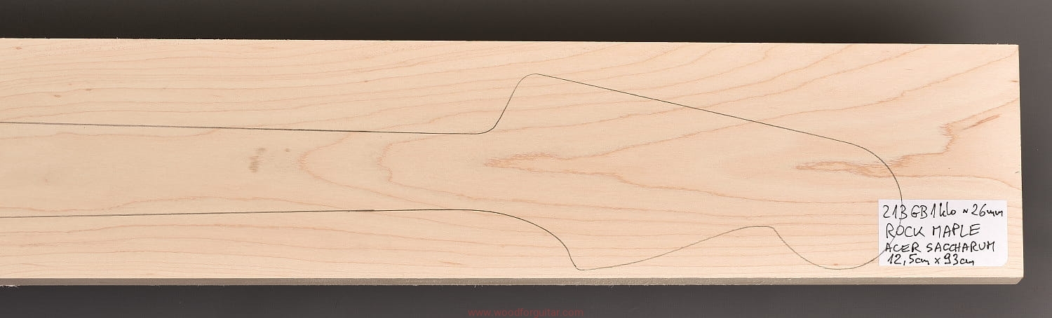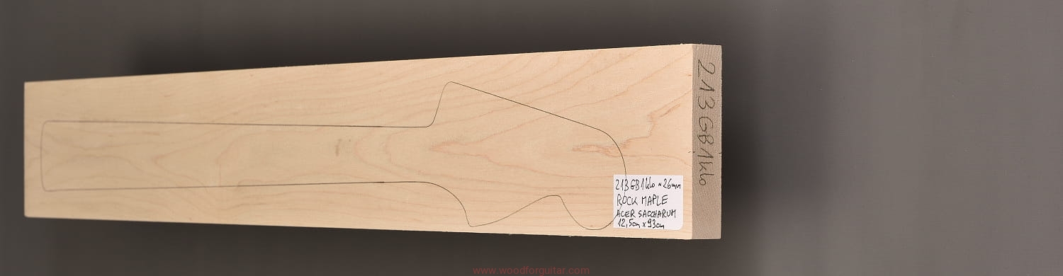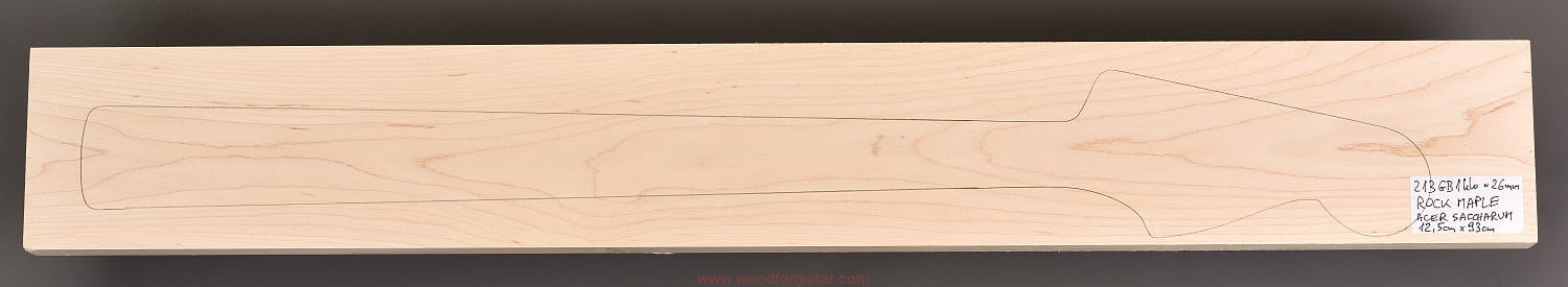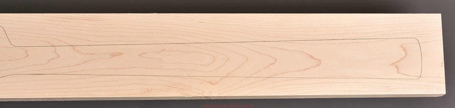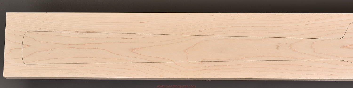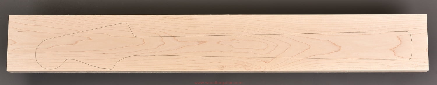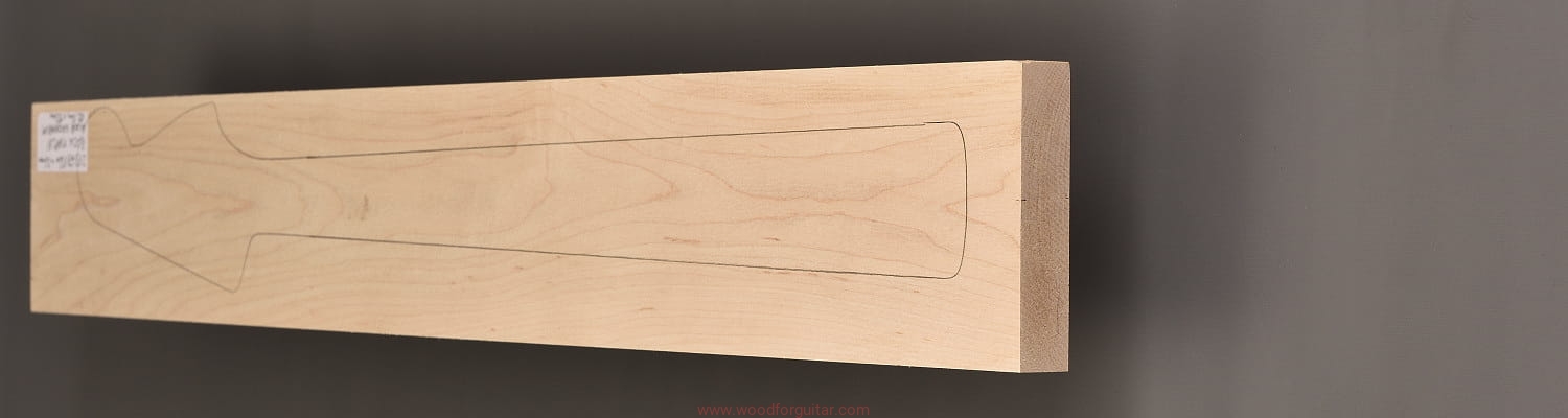 (1 kawałek drewna średniej gęstości, cięte płasko/stycznie – słoje w przekroju równoległe lub prawie równoległe do powierzchni. W formatkę wrysowano kształt gryfu typu Jazz-bass. Jak zawsze, dla zwiększenia stabilności gryfu, polecamy dodatkowo użycie podstrunnicy wykonanej z palisandru, hebanu, lub też Pau Ferro, które brzmieniowo doskonale uzupełniają się z klonem)…