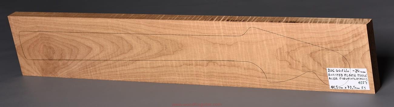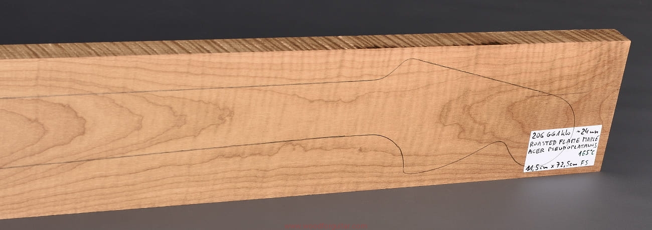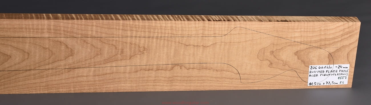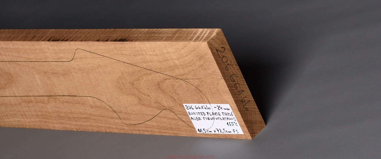 Drewno, po okresie ok. 2-letniego sezonowania, zostało poddane procesowi powolnego suszenia próżniowego do wilgotności ok. 7%. Po suszeniu było wypiekane w komorze beztlenowej w temperaturze do 165 st. C. Zabieg ten, to technicznie przyspieszony proces starzenia się drewna, który ma na celu zwiększenie twardości, sztywności i stabilności drewna. Dodatkowo, utwardzona struktura drewna i zamknięte pory utrudniają pochłanianie wilgoci z powietrza, które nigdy nie jest obojętne na jakiekolwiek drewno. Ma to szczególne znaczenie właśnie w przypadku drewna klonu w różnych odmianach, który to jest wysoce niestabilny w zmiennych warunkach klimatycznych (temperatura, wilgotność, nasłonecznienie). Skutkiem ubocznym procesu wypiekania (dla niektórych wielkim plusem) jest znaczne ściemnienie drewna i charakterystyczny zapach, przypominający zapach palonej kawy zbożowej. Im wyższa temperatura wypiekania, tym stopień ściemnienia większy, a zapach intensywniejszy. Brzmieniowo wypiekane drewno teoretycznie tylko zyskuje, a czy tak rzeczywiście jest… ten tylko się dowie, kto sam to sprawdzi. Nas, w Woodforguitar, długo nie trzeba było przekonywać, „Roasted Maple” to jest to.
