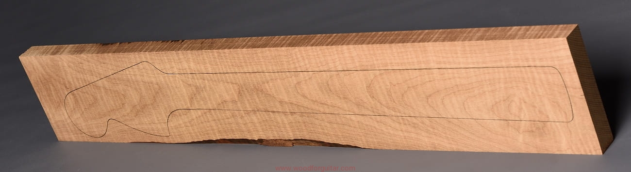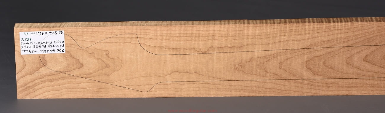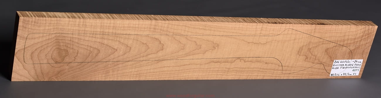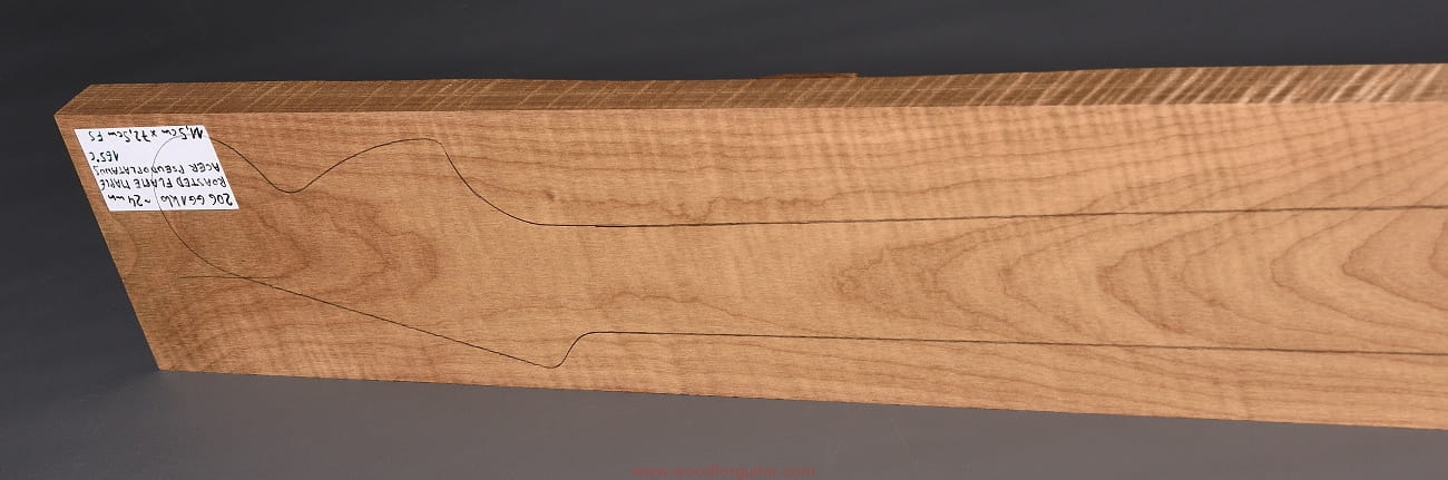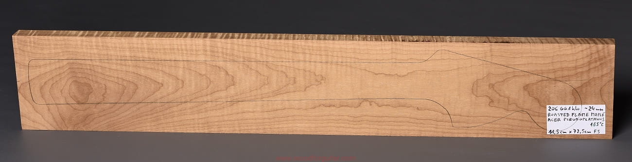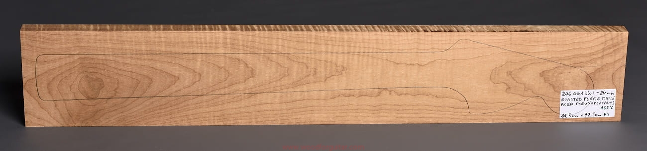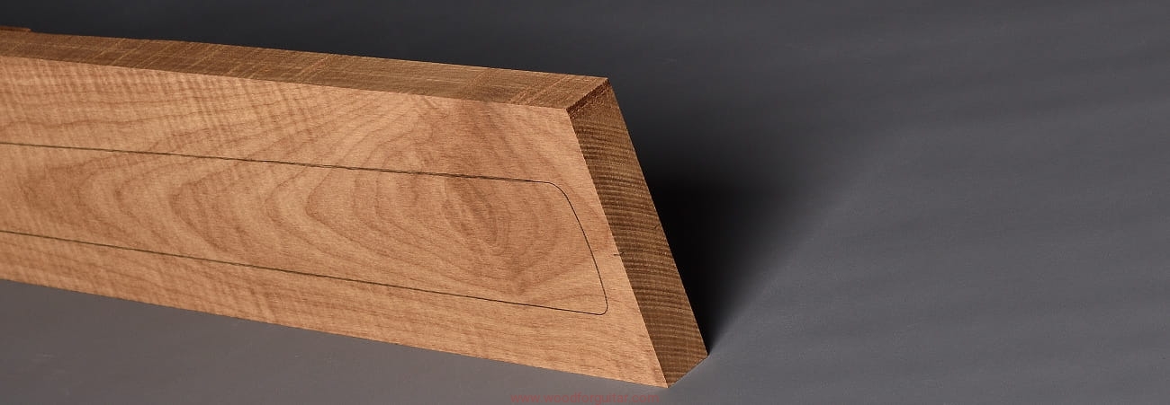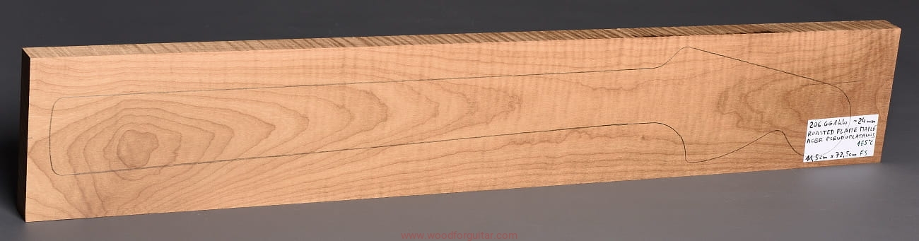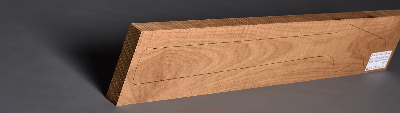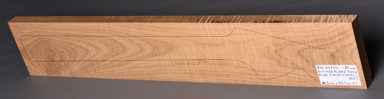 (1 kawałek drewna średniej gęstości, drewno wypiekane w warunkach beztlenowych, cięte „płasko” – słoje w przekroju równoległe i prawie równoległe do powierzchni. Sugerujemy użycie w konstrukcji z podstrunnicą wykonaną z palisandru, hebanu lub Pau Ferro, wraz ze wzmacniającymi prętami grafitowymi. Uwaga, w wyniku procesu pieczenia, drewno ma na stałe zmieniony kolor, jest wyraźnie ciemniejsze, niż drewno nie poddane temu procesowi… kilka słów o procesie postarzania drewna metodą pieczenia można znaleźć nieco dalej…)…