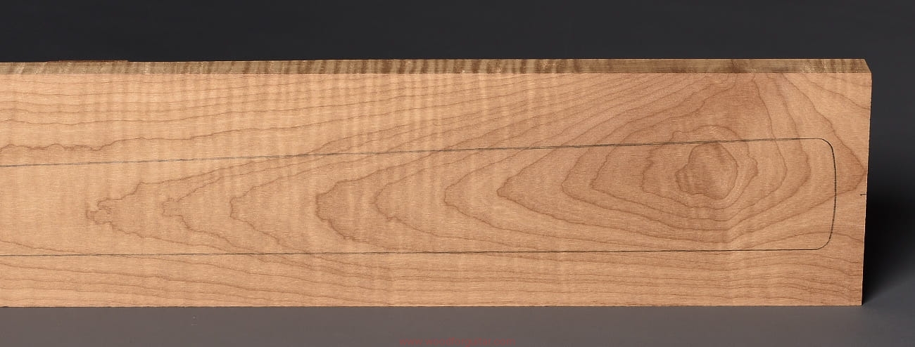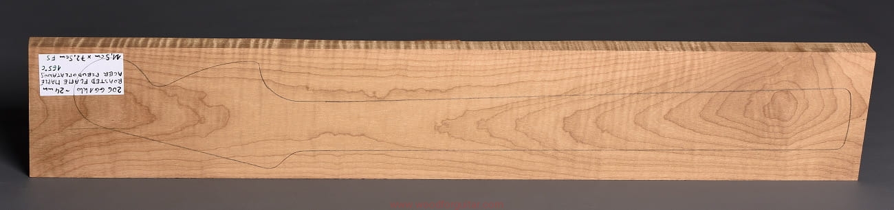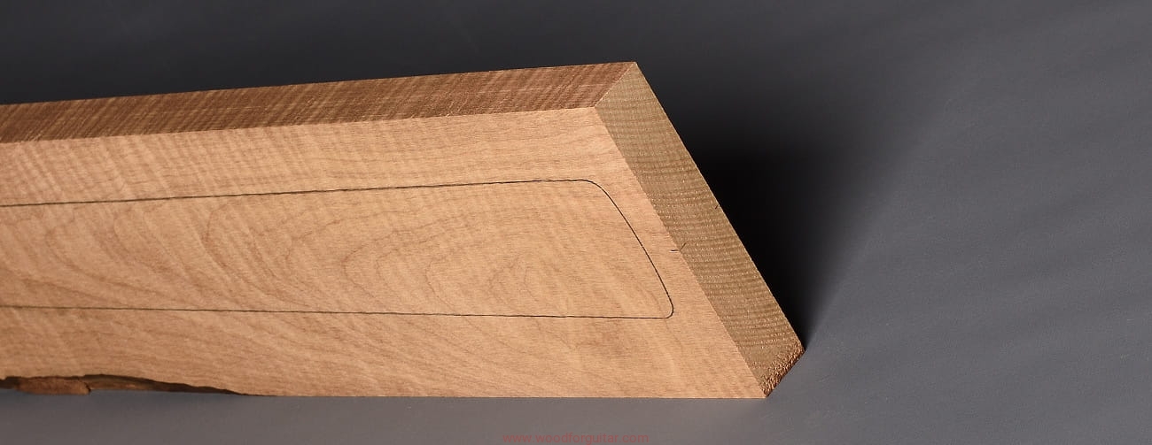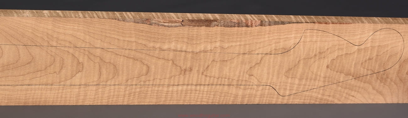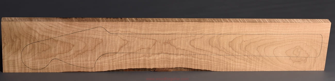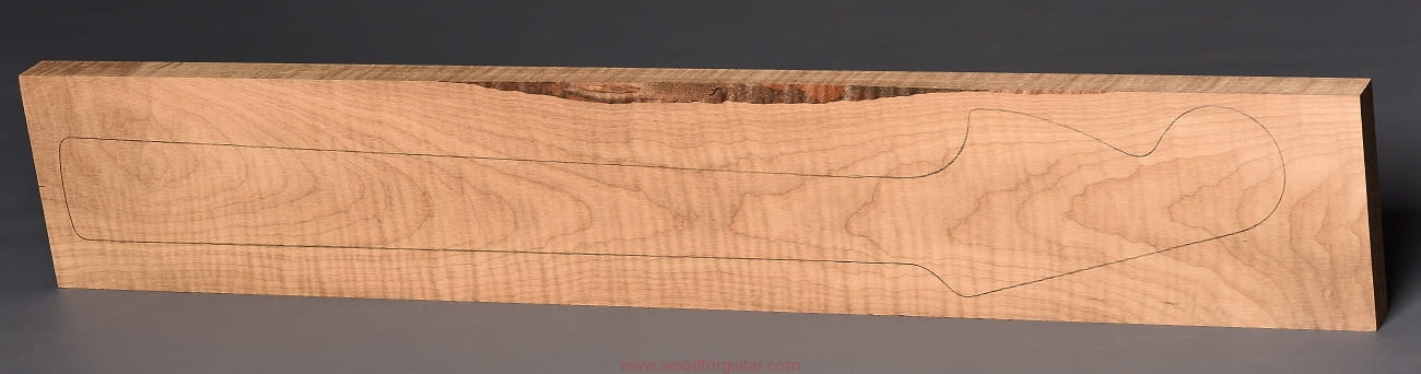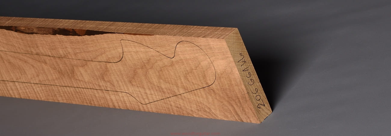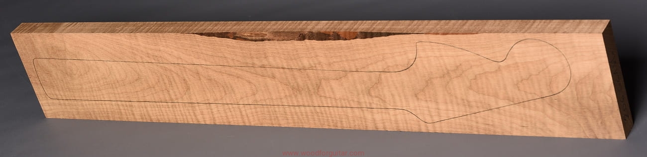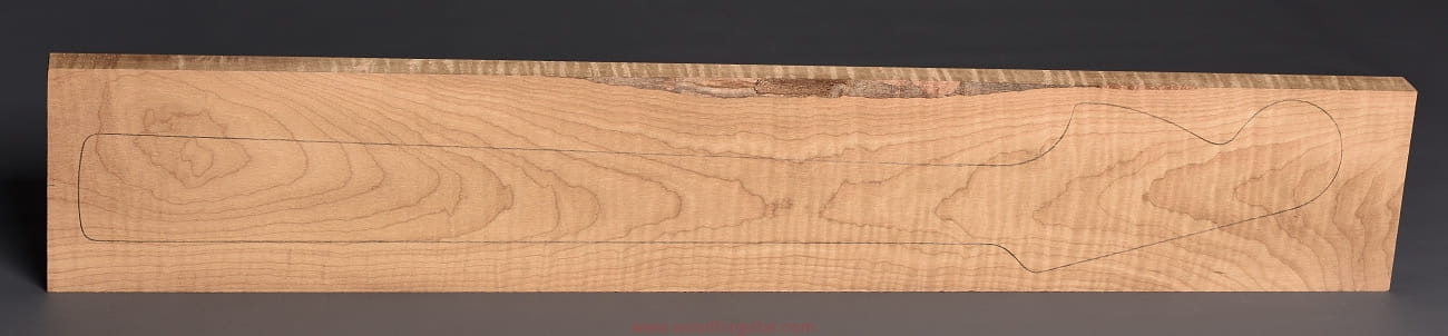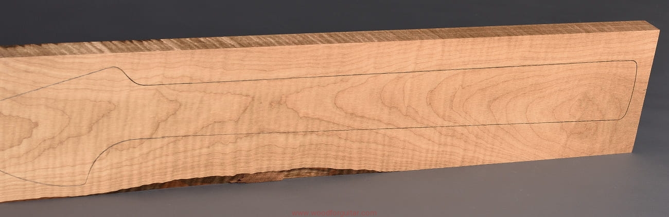 (1 kawałek drewna średniej gęstości, drewno wypiekane w warunkach beztlenowych, cięte „płasko” – słoje w przekroju równoległe i prawie równoległe do powierzchni. Sugerujemy użycie w konstrukcji z podstrunnicą wykonaną z palisandru, hebanu lub Pau Ferro, wraz ze wzmacniającymi prętami grafitowymi. Uwaga, w wyniku procesu pieczenia, drewno ma na stałe zmieniony kolor, jest wyraźnie ciemniejsze, niż drewno nie poddane temu procesowi… kilka słów o procesie postarzania drewna metodą pieczenia można znaleźć nieco dalej…)…