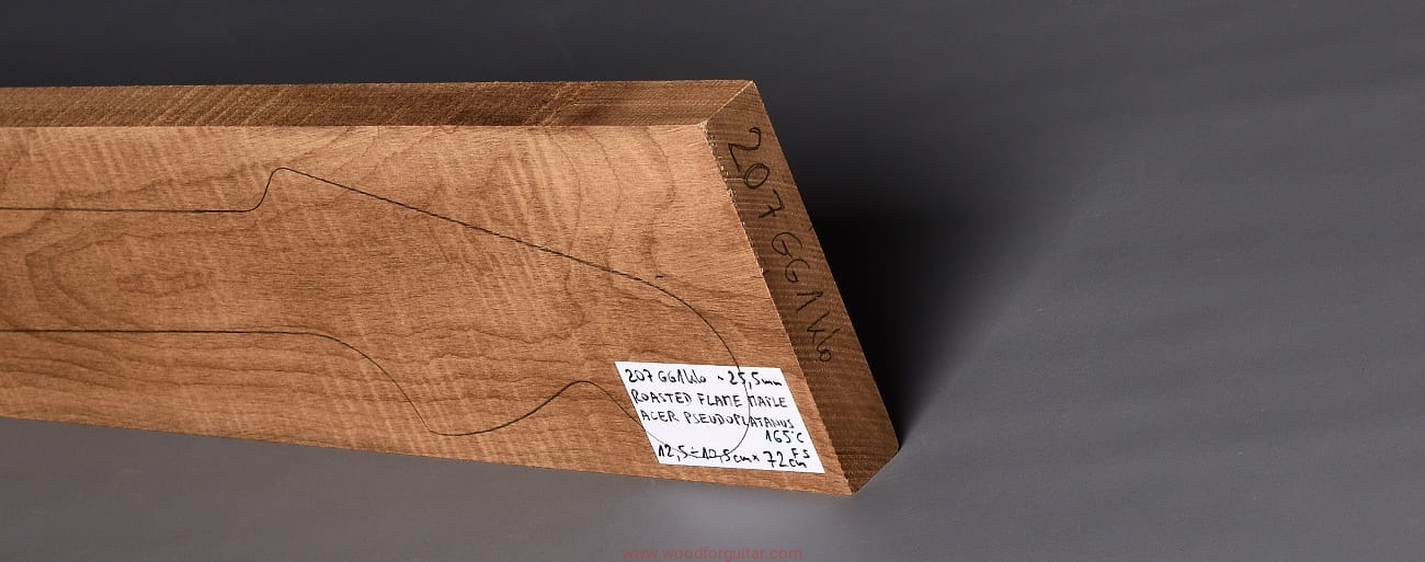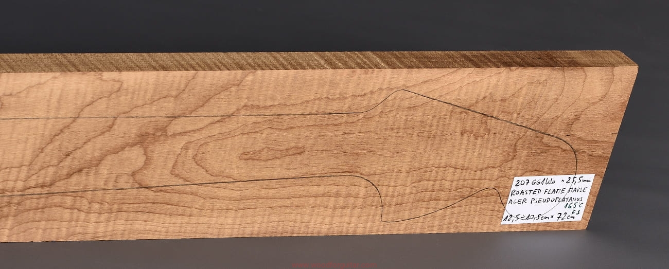 Drewno, po okresie ok. 2-letniego sezonowania, zostało poddane procesowi powolnego suszenia próżniowego do wilgotności ok. 7%. Po suszeniu było wypiekane w komorze beztlenowej w temperaturze do 165 st. C. Zabieg ten, to technicznie przyspieszony proces starzenia się drewna, który ma na celu zwiększenie twardości, sztywności i stabilności drewna. Dodatkowo, utwardzona struktura drewna i zamknięte pory utrudniają pochłanianie wilgoci z powietrza, które nigdy nie jest obojętne na jakiekolwiek drewno. Ma to szczególne znaczenie właśnie w przypadku drewna klonu w różnych odmianach, który to jest wysoce niestabilny w zmiennych warunkach klimatycznych (temperatura, wilgotność, nasłonecznienie). Skutkiem ubocznym procesu wypiekania (dla niektórych wielkim plusem) jest znaczne ściemnienie drewna i charakterystyczny zapach, przypominający zapach palonej kawy zbożowej. Im wyższa temperatura wypiekania, tym stopień ściemnienia większy, a zapach intensywniejszy. Brzmieniowo wypiekane drewno teoretycznie tylko zyskuje, a czy tak rzeczywiście jest… ten tylko się dowie, kto sam to sprawdzi. Nas, w Woodforguitar, długo nie trzeba było przekonywać, „Roasted Maple” to jest to.