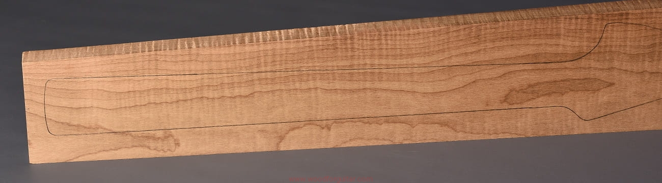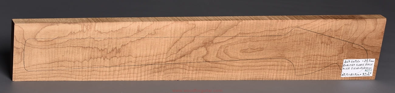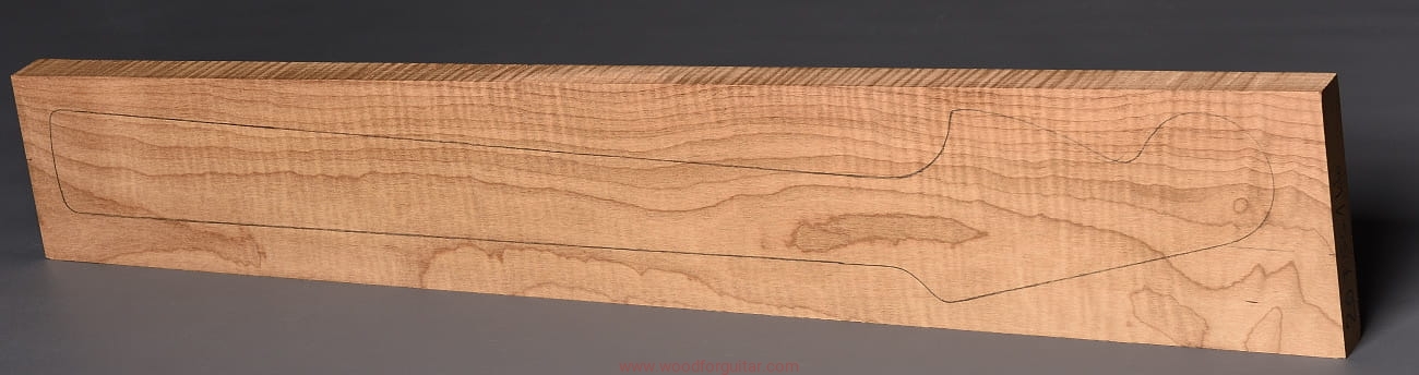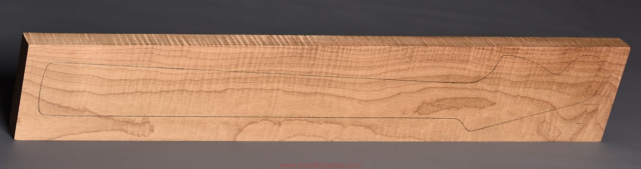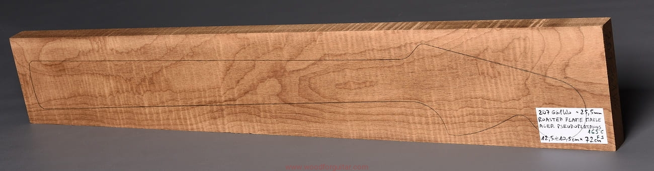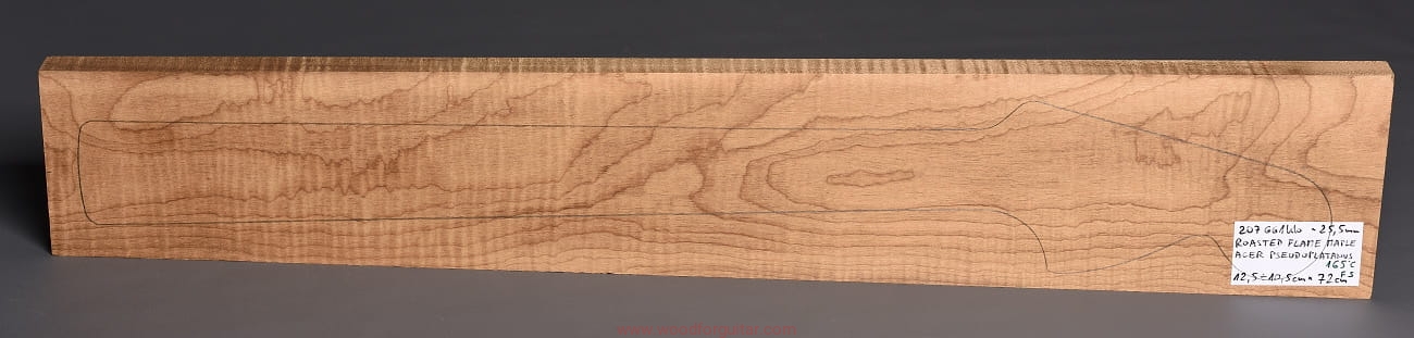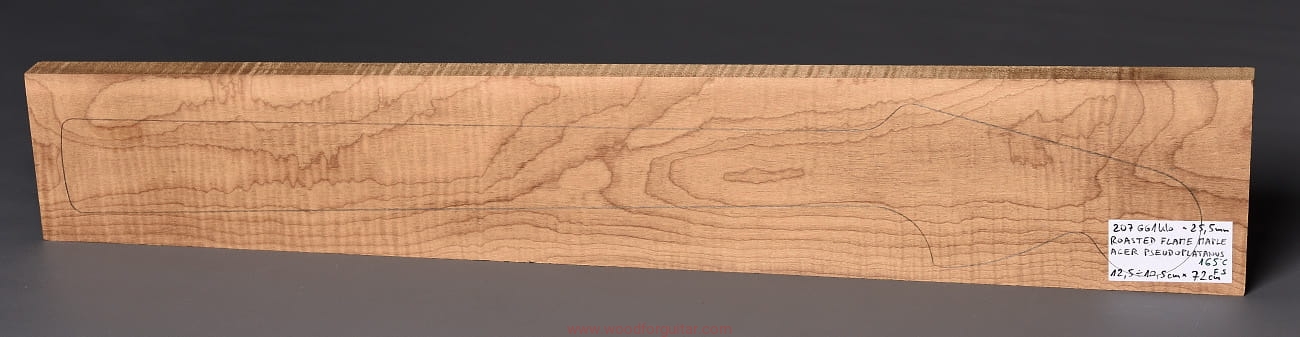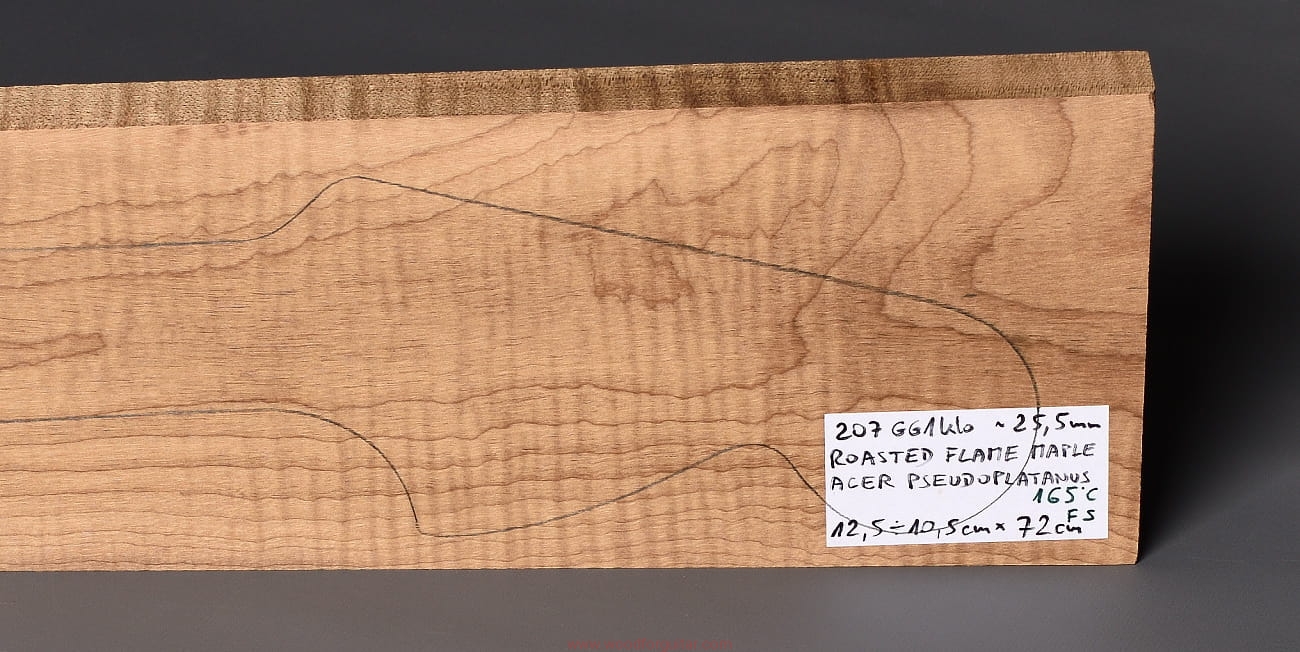 (1 kawałek drewna średniej gęstości, drewno wypiekane w warunkach beztlenowych, cięte „płasko” – słoje w przekroju równoległe i prawie równoległe do powierzchni. Sugerujemy użycie w konstrukcji z podstrunnicą wykonaną z palisandru, hebanu lub Pau Ferro, wraz ze wzmacniającymi prętami grafitowymi. Uwaga, w wyniku procesu pieczenia, drewno ma na stałe zmieniony kolor, jest wyraźnie ciemniejsze, niż drewno nie poddane temu procesowi… kilka słów o procesie postarzania drewna metodą pieczenia można znaleźć nieco dalej…)…
