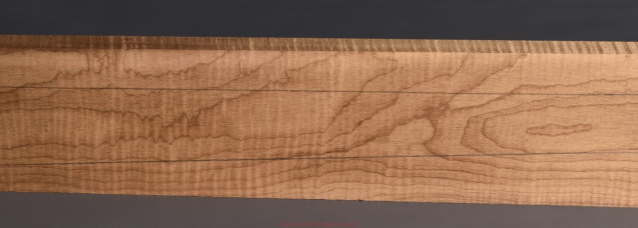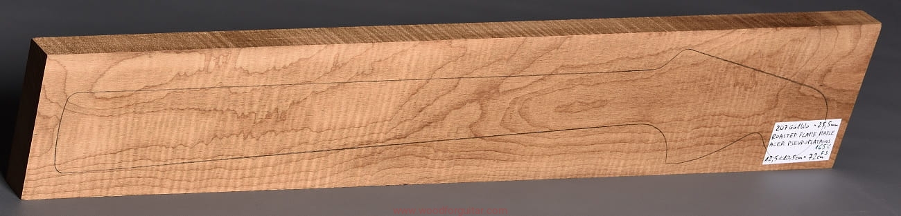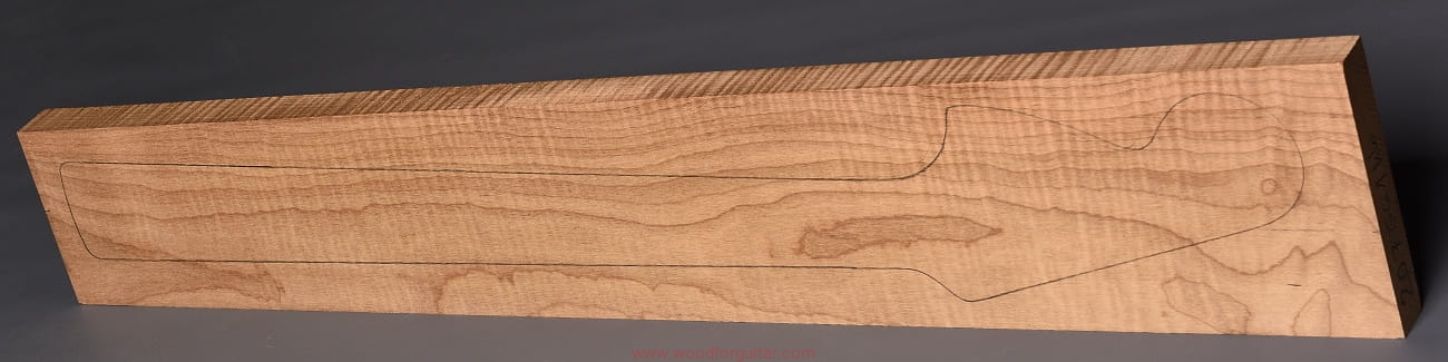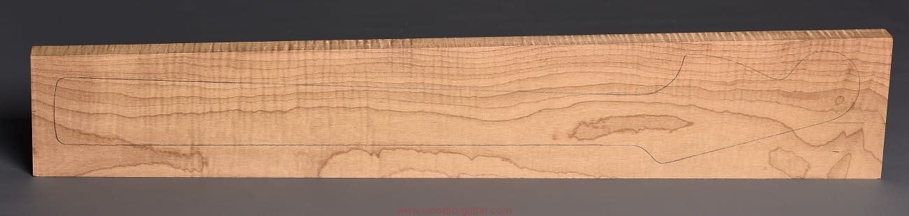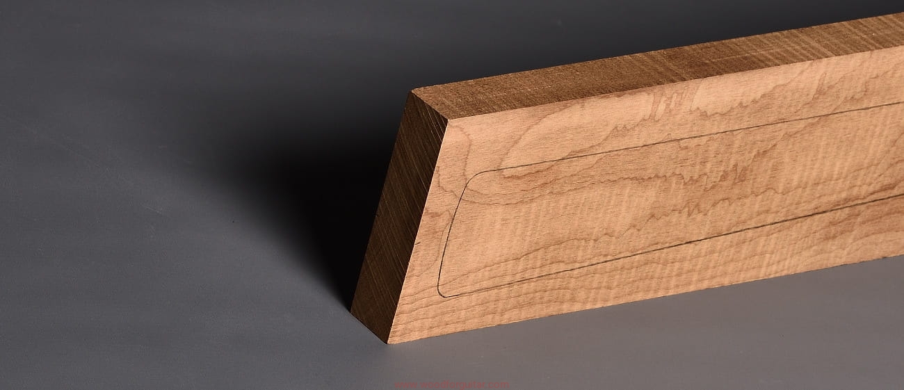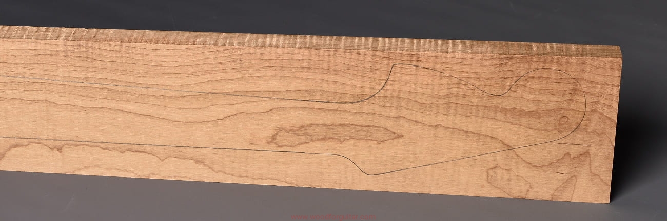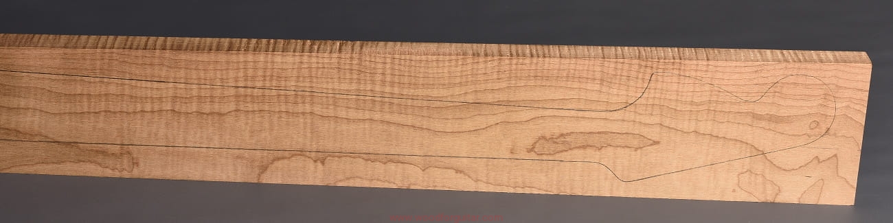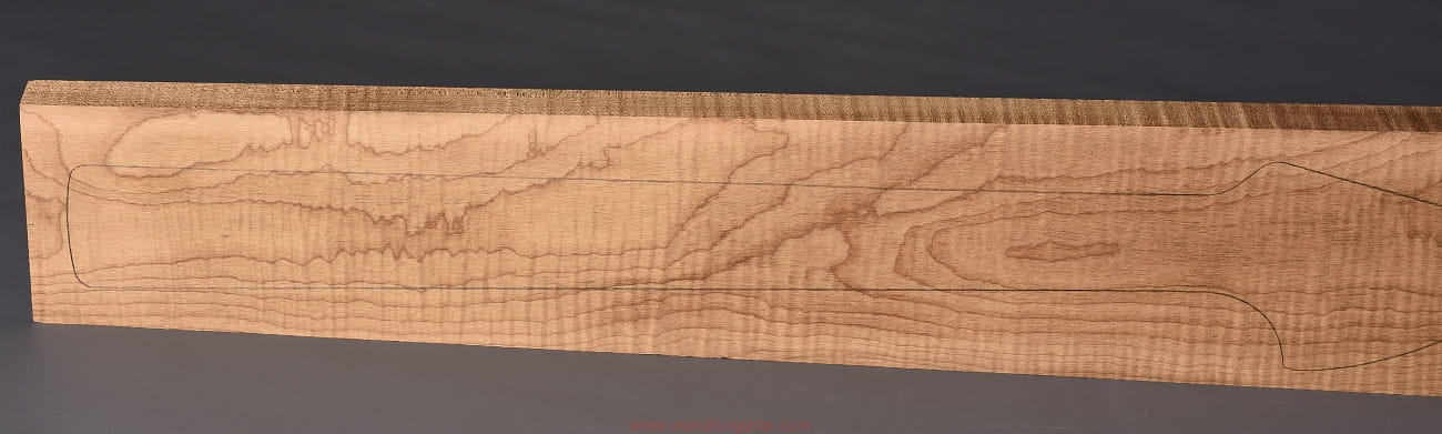(1 kawałek drewna średniej gęstości, drewno wypiekane w warunkach beztlenowych, cięte „płasko” – słoje w przekroju równoległe i prawie równoległe do powierzchni. Sugerujemy użycie w konstrukcji z podstrunnicą wykonaną z palisandru, hebanu lub Pau Ferro, wraz ze wzmacniającymi prętami grafitowymi. Uwaga, w wyniku procesu pieczenia, drewno ma na stałe zmieniony kolor, jest wyraźnie ciemniejsze, niż drewno nie poddane temu procesowi… kilka słów o procesie postarzania drewna metodą pieczenia można znaleźć nieco dalej…)…