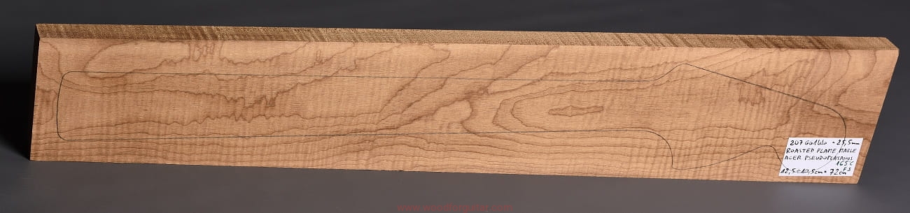 z przeznaczeniem na gryf gitary lub innego instrumentu, w ramach którego można wykorzystać przedstawiony kawałek drewna. Zdjęcia dotyczą tego konkretnego numerowanego kawałka. Drewno ma wstępnie oszlifowane obydwie powierzchnie, jest suche i gotowe do użycia. Dostosowanie wymiarów do własnych celów należy przeprowadzić samodzielnie. Jak zawsze w przypadku pracy z drewnem, zalecamy zaaklimatyzowanie produktu w miejscu docelowym przez okres kilku tygodni. Każdy, nawet najbardziej stabilny gatunek drewna nie jest obojętny na zmiany wilgotności, temperatury i innych czynników zewnętrznych.
