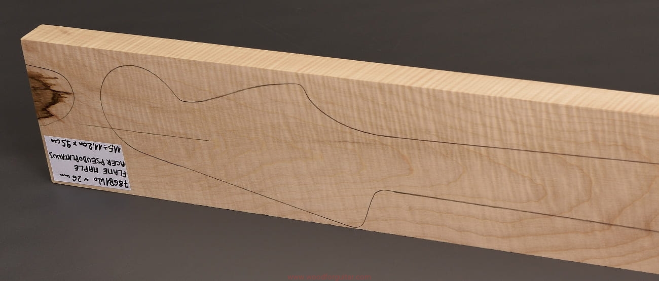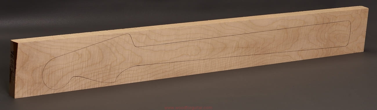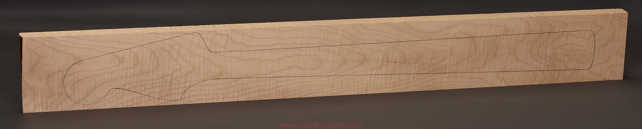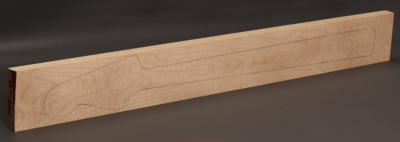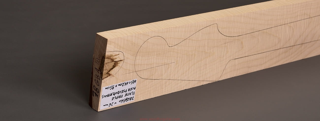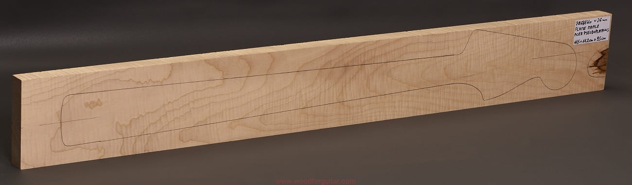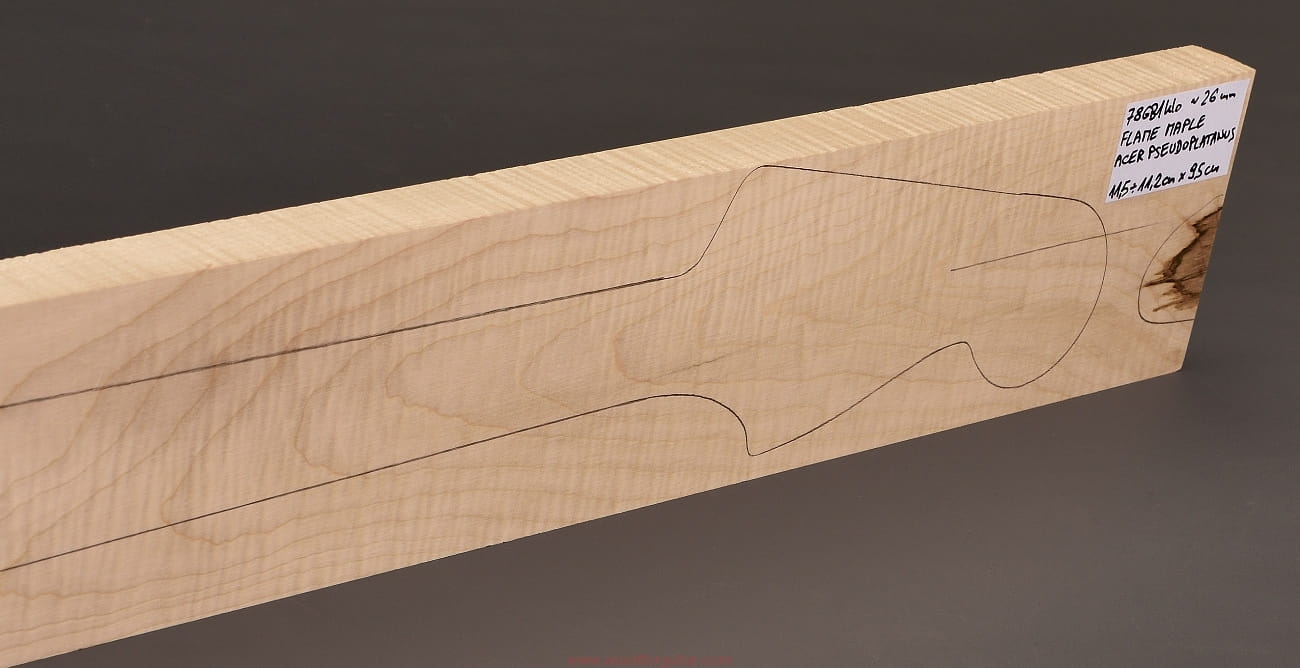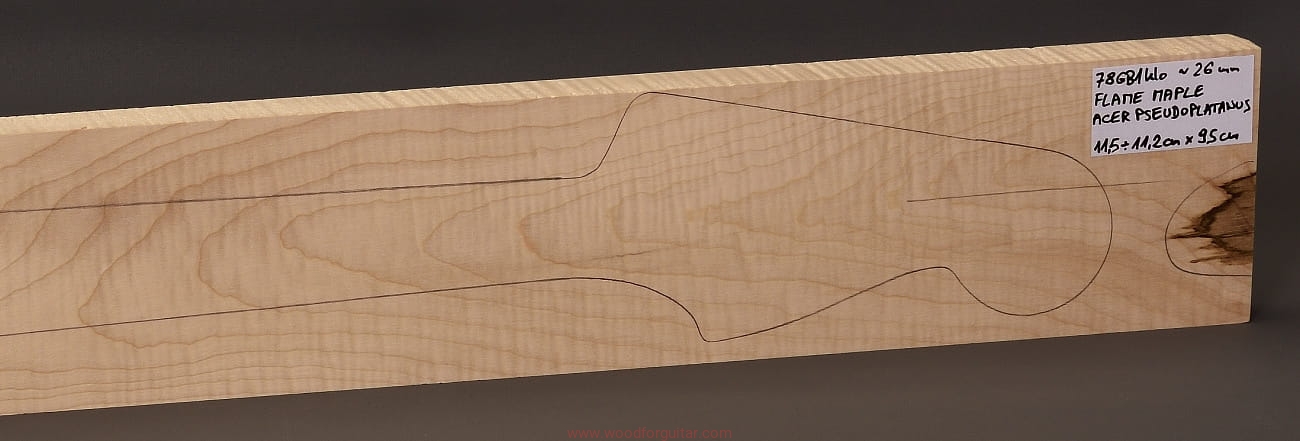 (1 kawałek drewna średniej gęstości, cięte „płasko” - słoje w przekroju równoległe i prawie równoległe do powierzchni. Sugerujemy użycie w konstrukcji z podstrunnicą wykonaną z drewna Pau Ferro, palisandrowego lub hebanu, idealnie współgrającymi z tym typem klonu)…
