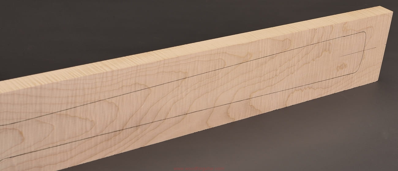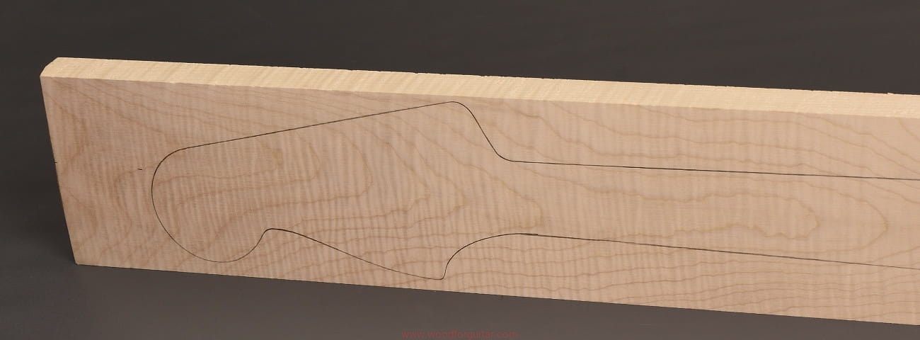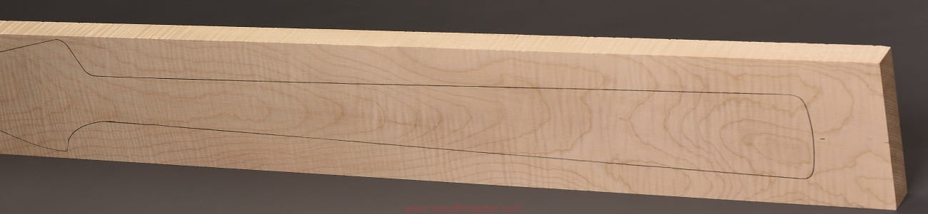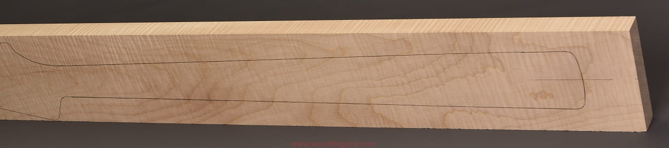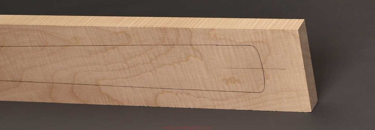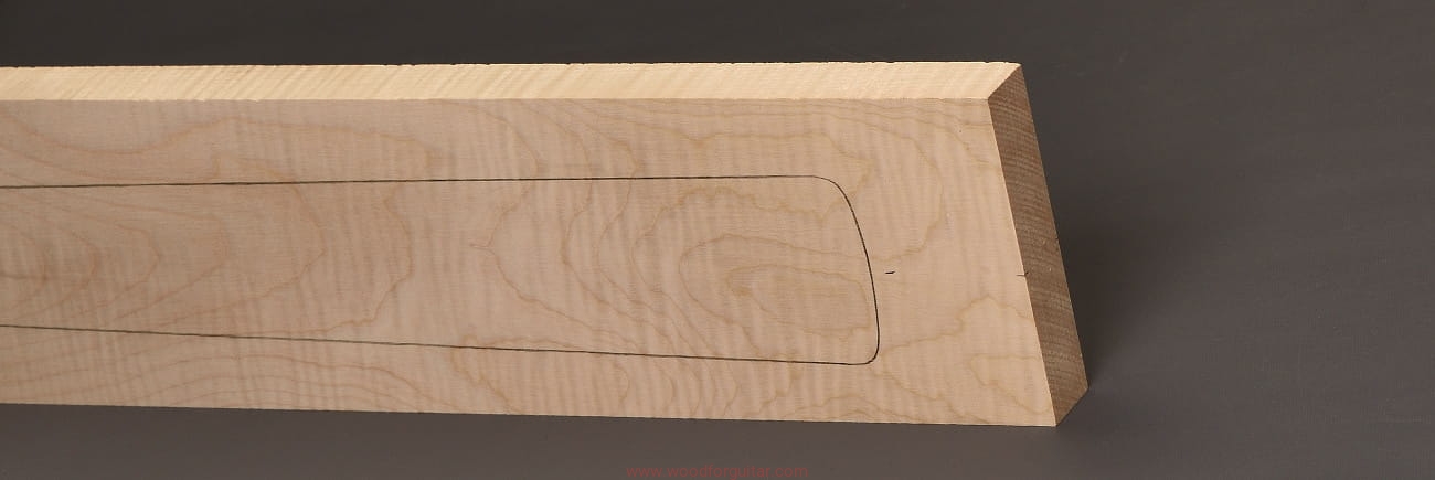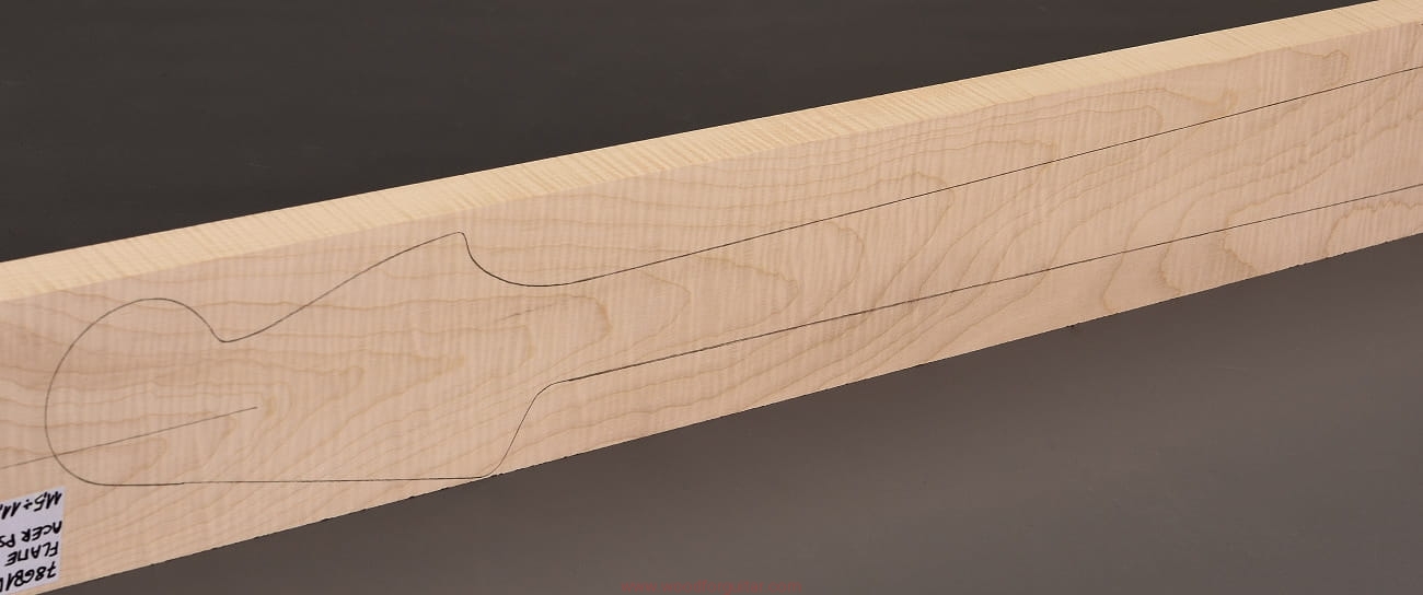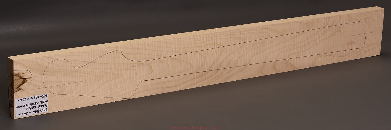 (1 kawałek drewna średniej gęstości, cięte „płasko” - słoje w przekroju równoległe i prawie równoległe do powierzchni. Sugerujemy użycie w konstrukcji z podstrunnicą wykonaną z drewna Pau Ferro, palisandrowego lub hebanu, idealnie współgrającymi z tym typem klonu)…