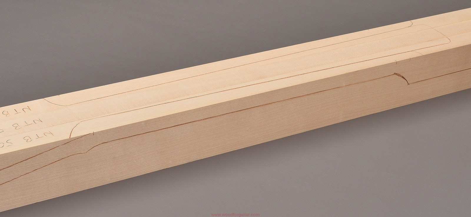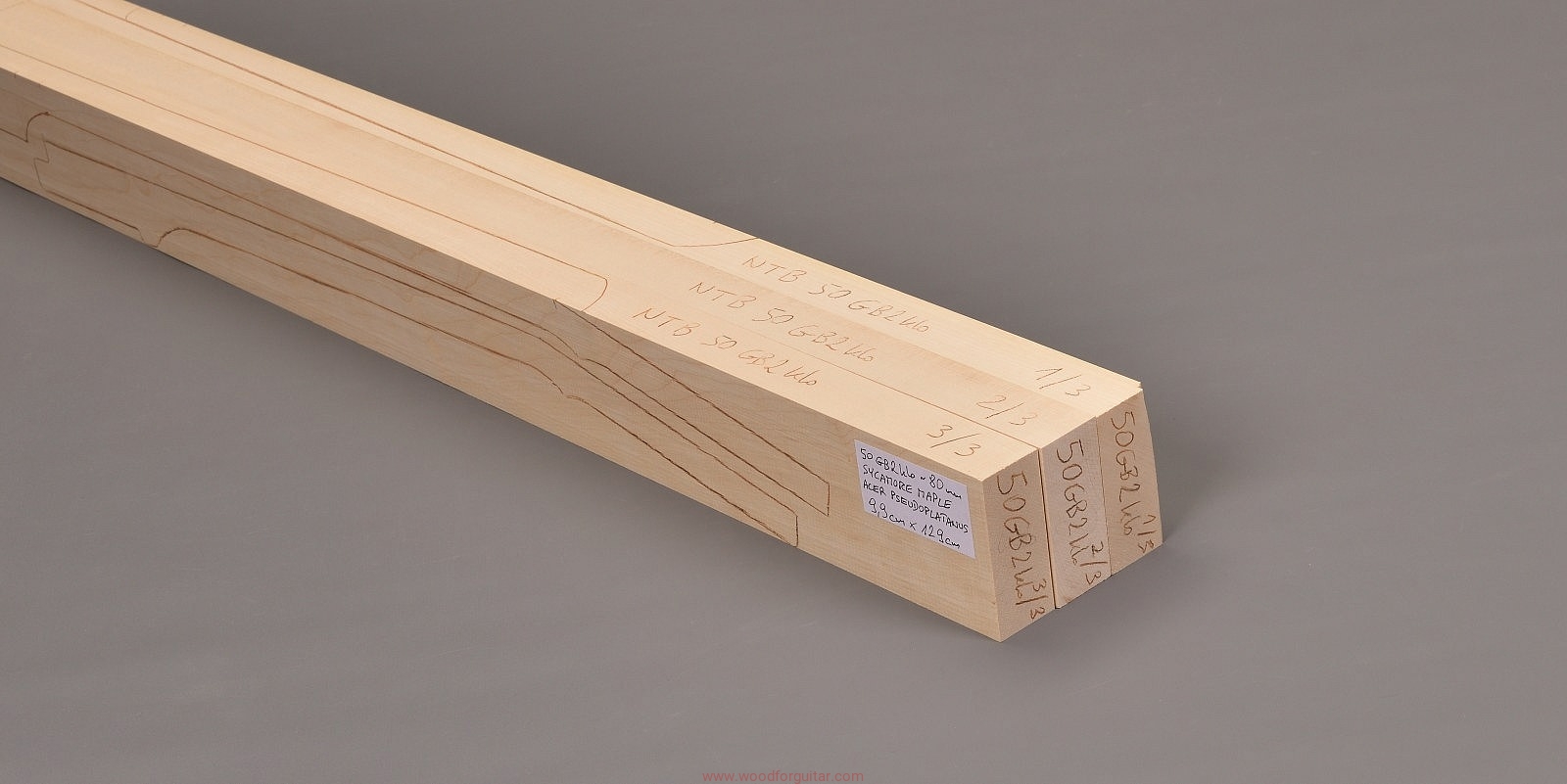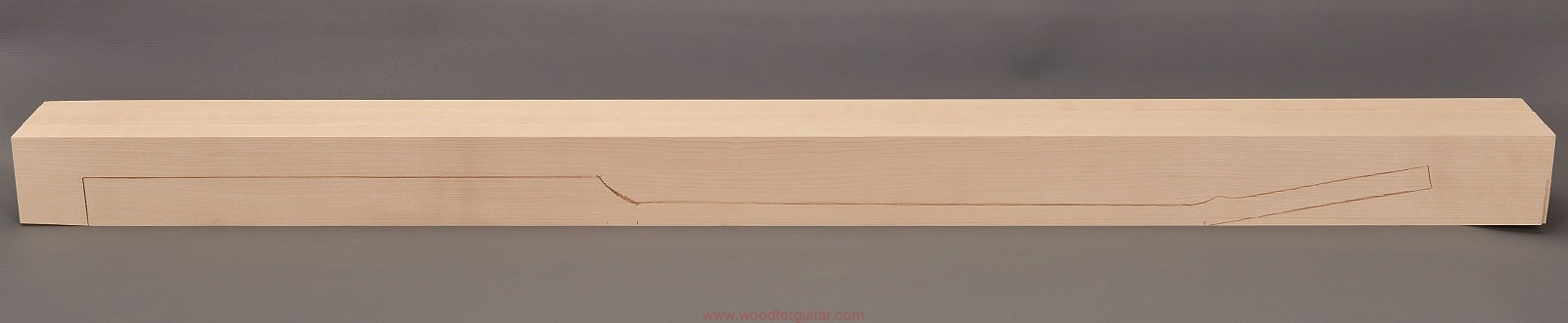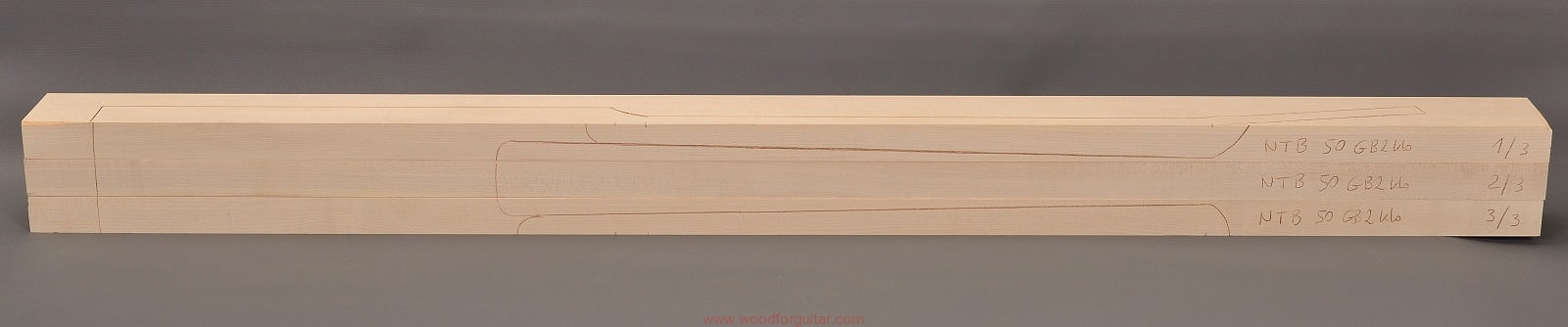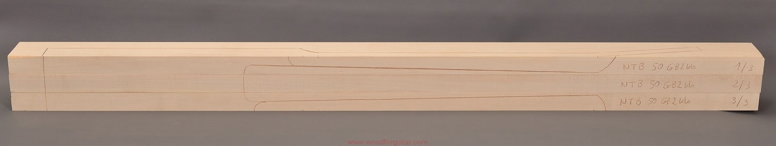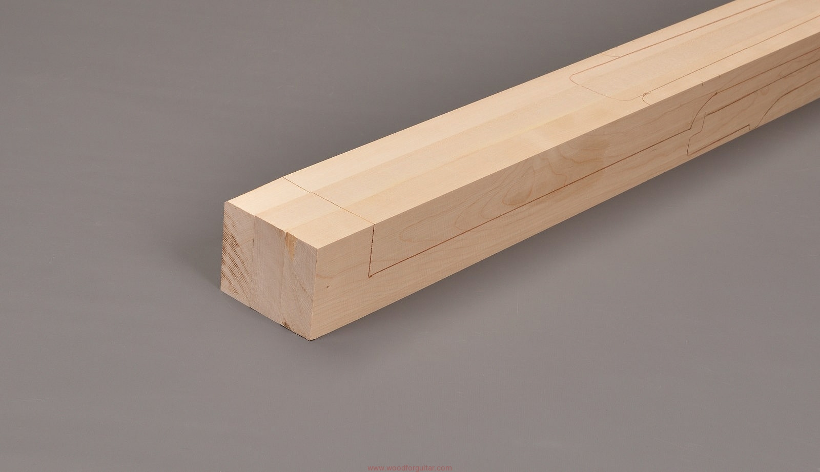 (3-cz. zestaw wysokiej klasy drewna klonu jaworowego o niskiej gęstości. Sugerujemy użycie w konstrukcji gryfu Neck Through Body z pochyłą główką i z podstrunnicą wykonaną z palisandru, hebanu lub Pau Ferro. W formatkę wrysowano poglądowy kształt gryfu basowego NTB, wielkość pozwala na dodatkowe wykonanie 3-cz. gryfu typu Les Paul)…