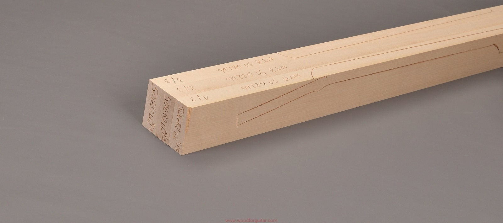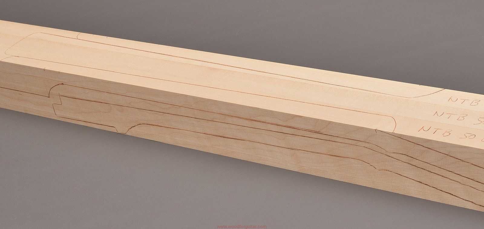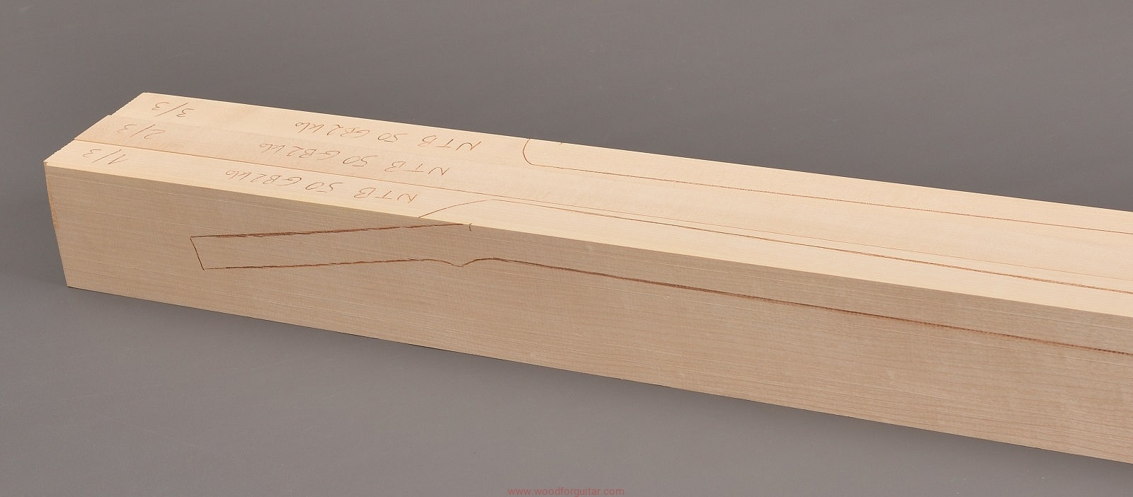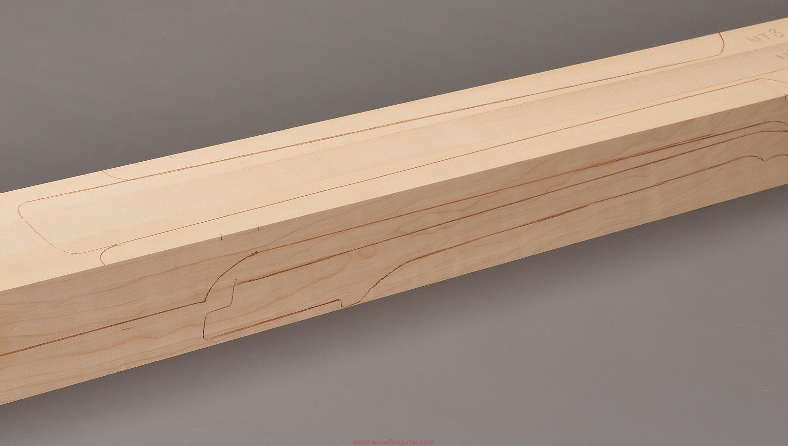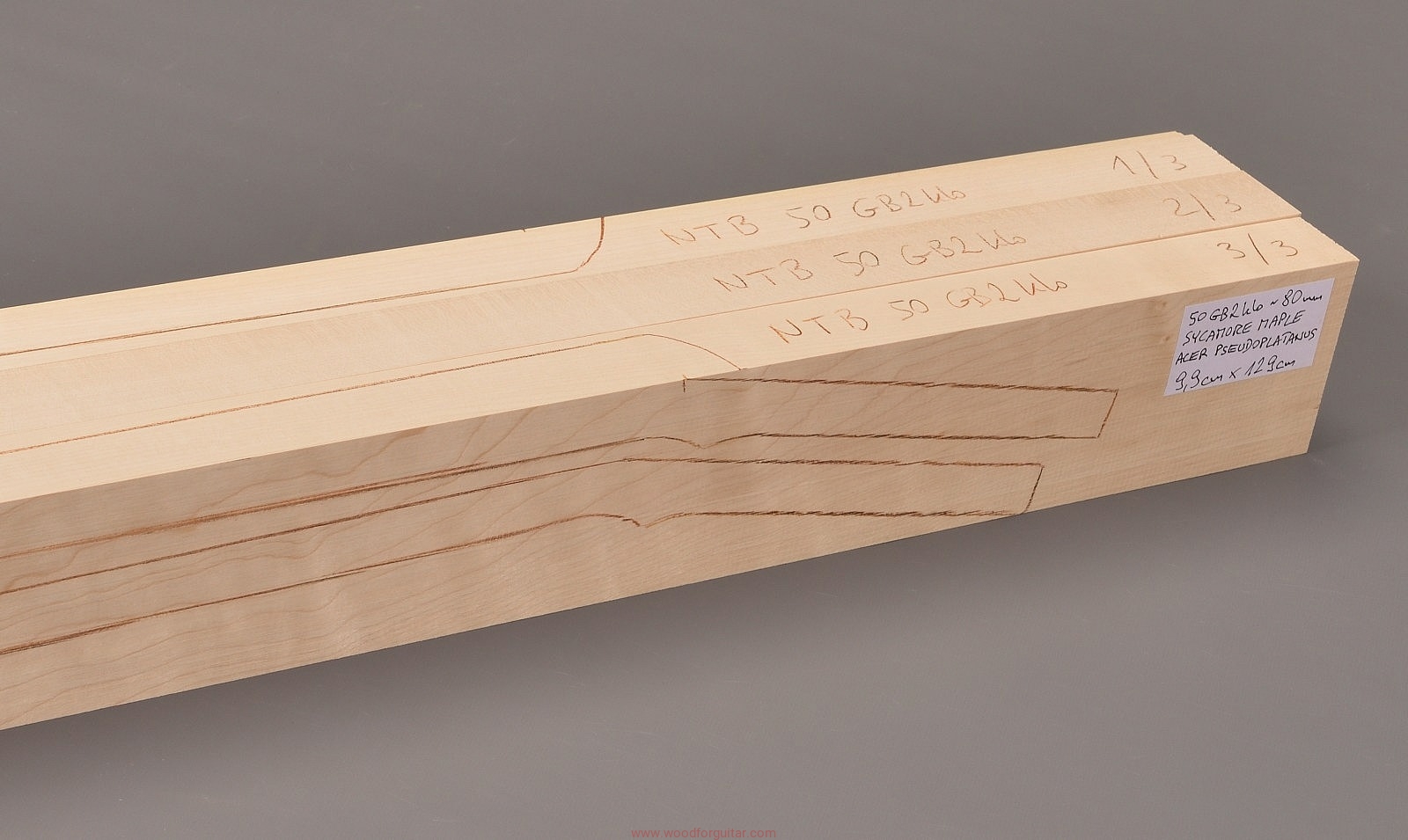 (3-cz. zestaw wysokiej klasy drewna klonu jaworowego o niskiej gęstości. Sugerujemy użycie w konstrukcji gryfu Neck Through Body z pochyłą główką i z podstrunnicą wykonaną z palisandru, hebanu lub Pau Ferro. W formatkę wrysowano poglądowy kształt gryfu basowego NTB, wielkość pozwala na dodatkowe wykonanie 3-cz. gryfu typu Les Paul)…