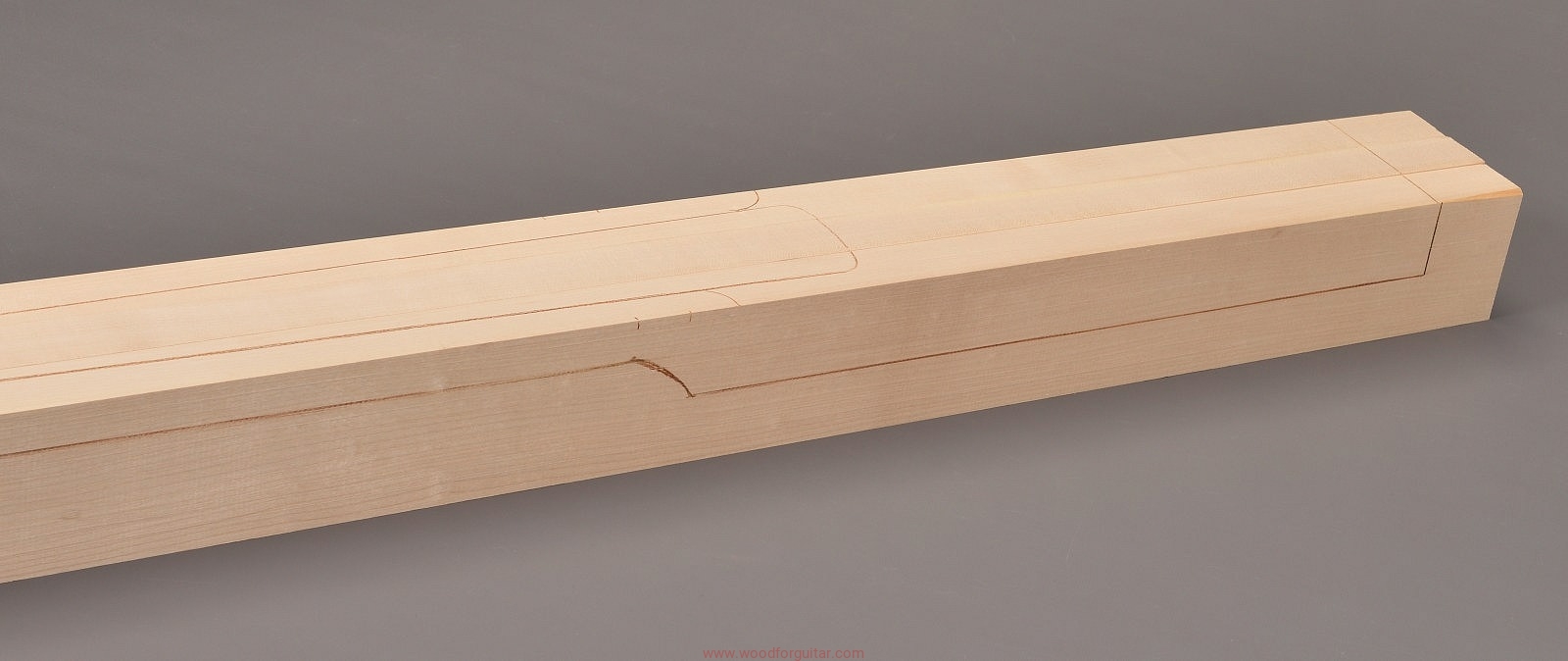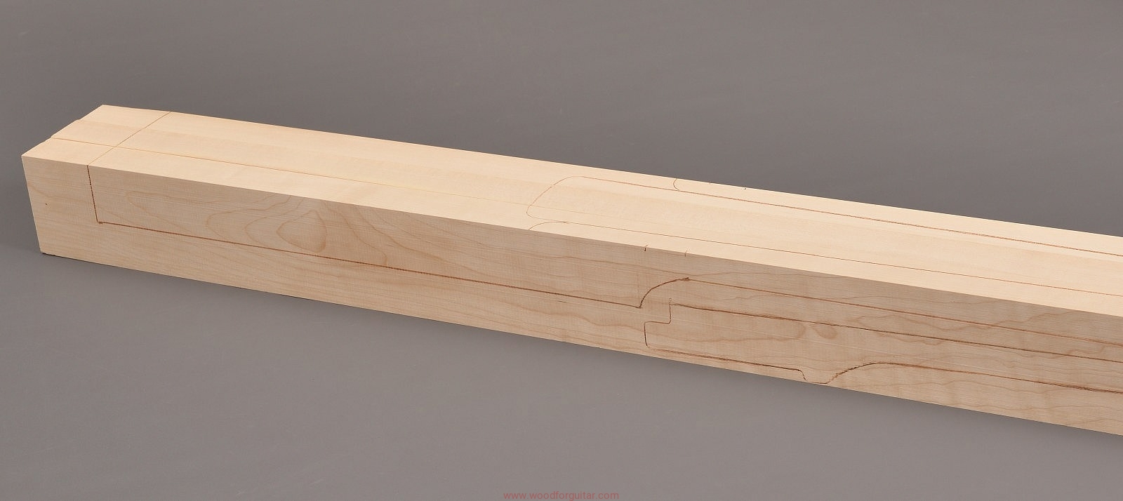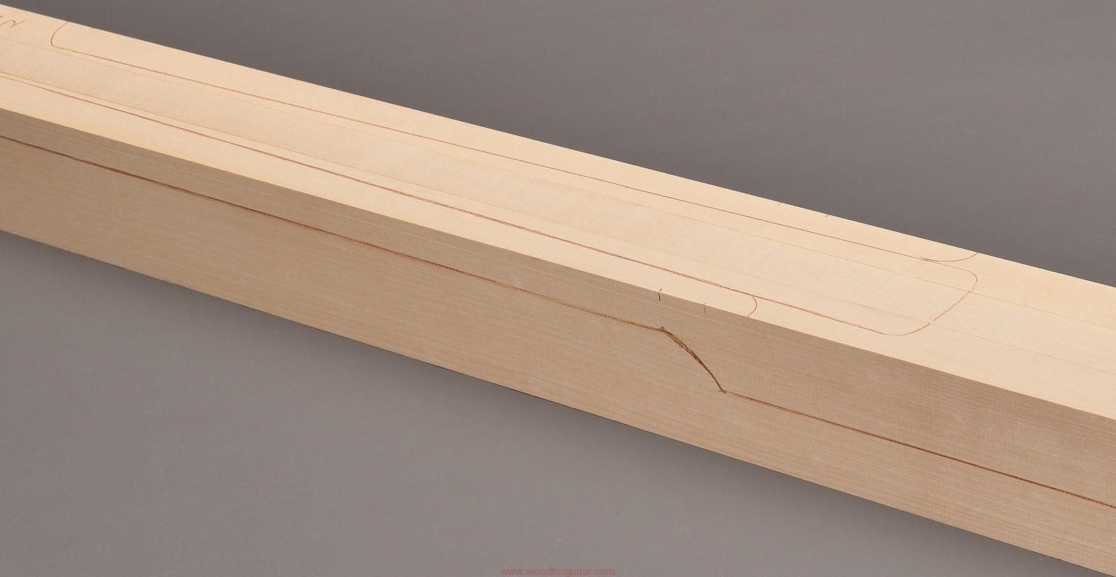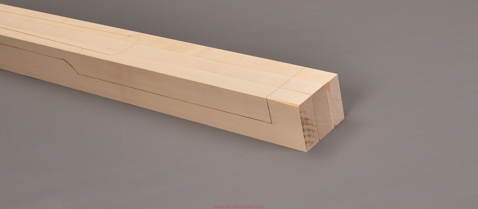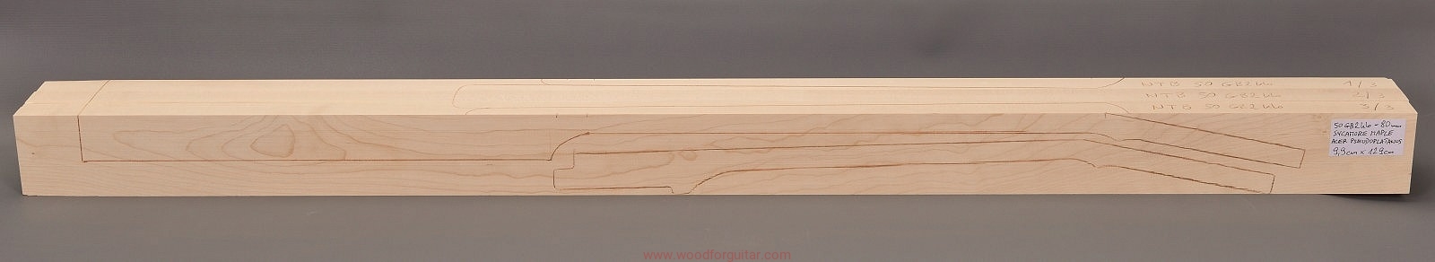 (3-cz. zestaw wysokiej klasy drewna klonu jaworowego o niskiej gęstości. Sugerujemy użycie w konstrukcji gryfu Neck Through Body z pochyłą główką i z podstrunnicą wykonaną z palisandru, hebanu lub Pau Ferro. W formatkę wrysowano poglądowy kształt gryfu basowego NTB, wielkość pozwala na dodatkowe wykonanie 3-cz. gryfu typu Les Paul)…