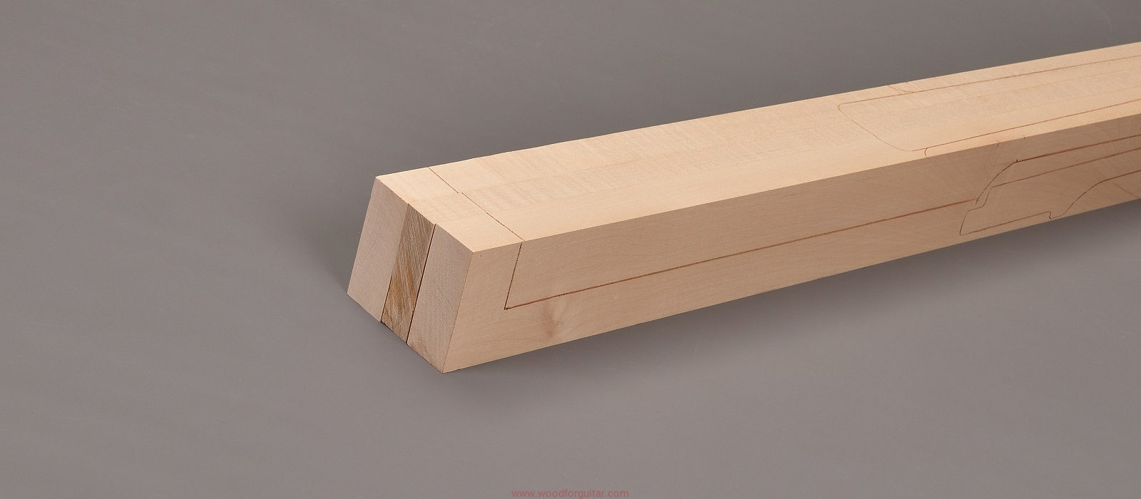 (3-cz. zestaw wysokiej klasy drewna klonu jaworowego średniej gęstości. Sugerujemy użycie w konstrukcji gryfu Neck Through Body z pochyłą główką i z podstrunnicą wykonaną z palisandru, hebanu lub Pau Ferro. W formatkę wrysowano poglądowy kształt gryfu basowego NTB, wielkość pozwala na dodatkowe wykonanie 3-cz. gryfu typu Les Paul)…