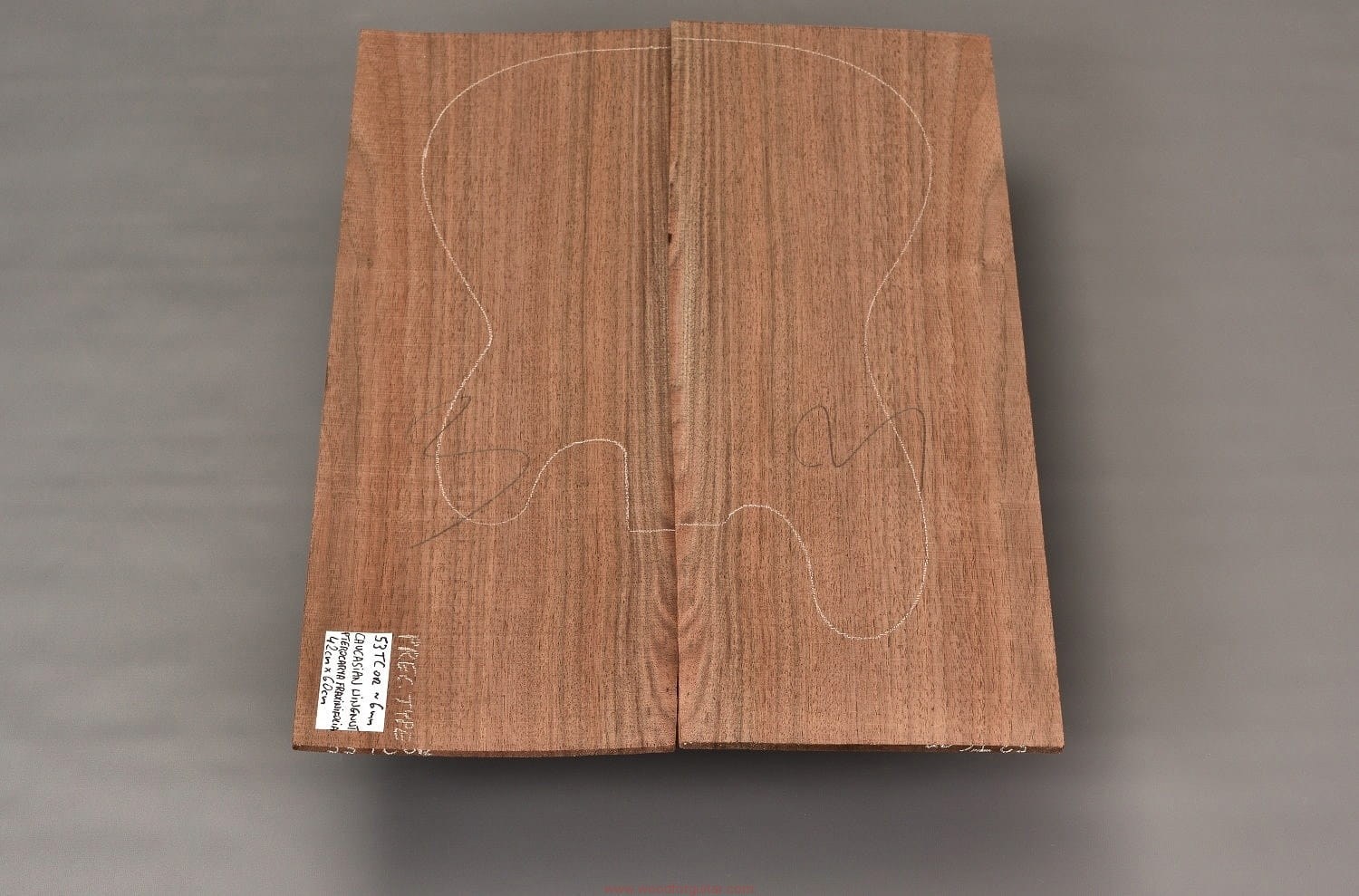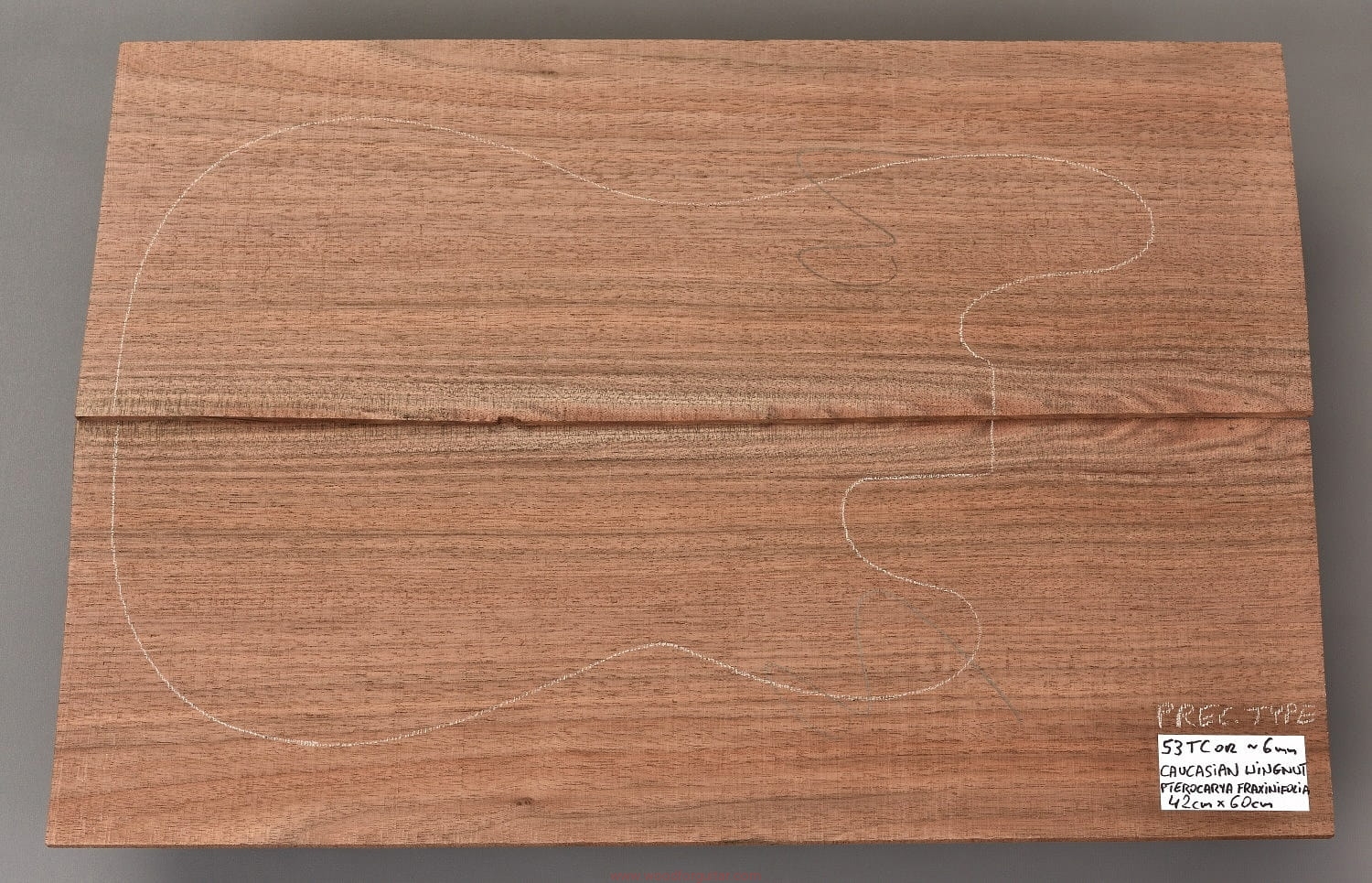 (2-cz. zestaw drewna średniej gęstości, połówki niesklejone, wielkość pozwala na zastosowanie w gitarze akustycznej jako top lub spód. W formatkę wrysowano kształt korpusu typu Precission. Przedstawiony zestaw to bardzo rzadko spotykana odmiana orzecha – skrzydłorzech kaukaski)…