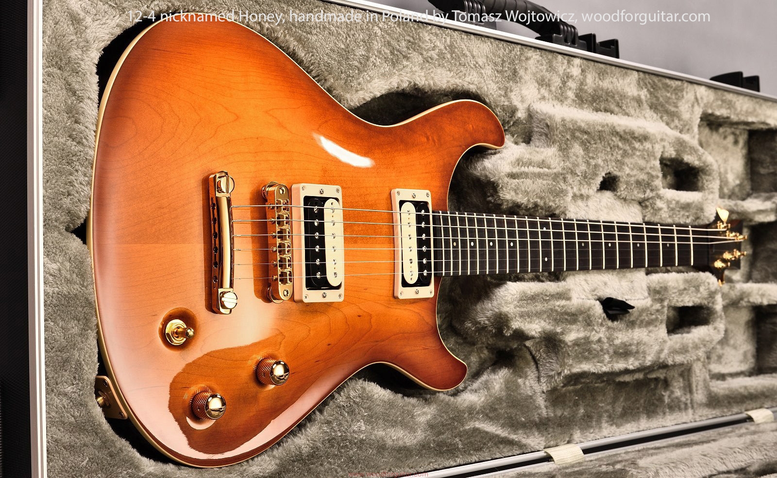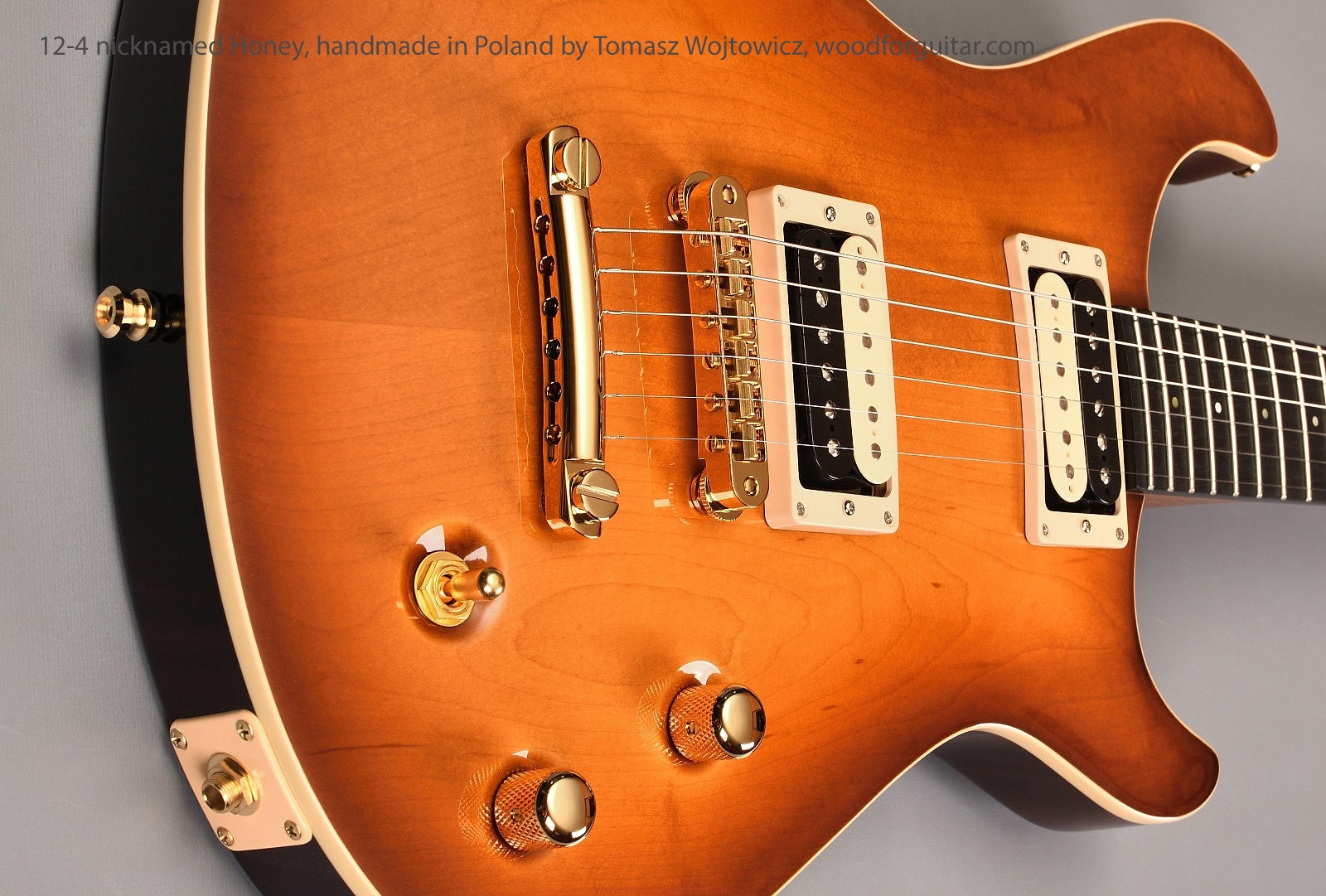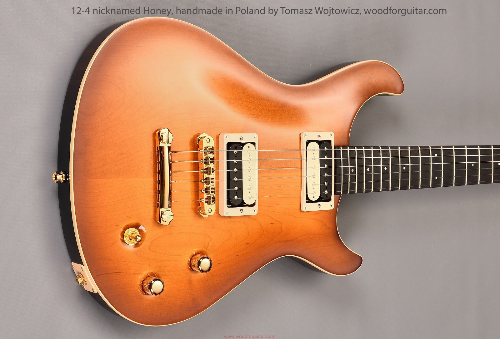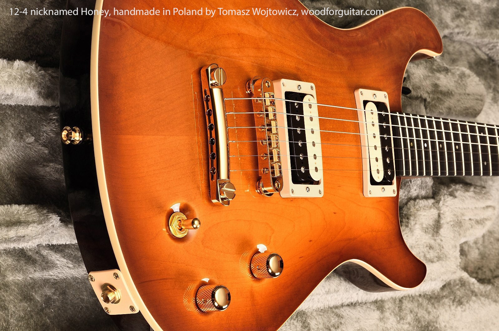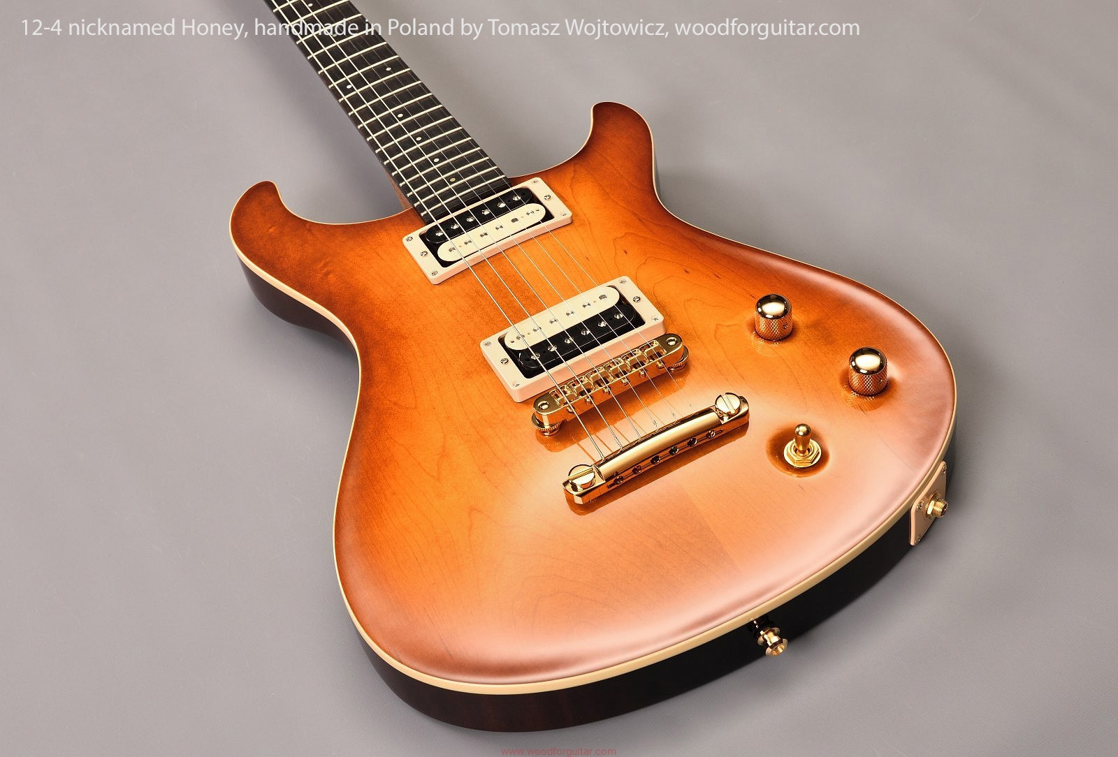 Sześciostrunowa gitara elektryczna o numerze seryjnym 12-4, nazwana „Honey”, wykonana ręcznie w Polsce przez Tomasza Wojtowicza, jedna z 25 gitar wchodzących w skład kolekcji „25 guitars collection – handmade by Tomasz Wojtowicz”. Wykonanie gitary zostało całkowicie zakończone w styczniu 2026r, gitara powstawała ponad 17 lat. Dlaczego tak długo? Bo jak zwykle w przypadku gitar z „25 guitars collection” każda z gitar w tej serii powstawała, powstaje i będzie powstawać niespiesznie, w chwilach wyjątkowych… kiedy jest czas i dobra energia. Honey to gitara stworzona do klasycznego rocka oraz bluesa, która została wykonana tradycyjnymi metodami, przy użyciu standardowych, ogólnie dostępnych narzędzi. Zalicza się do instrumentów oldschool’owych, wykonanych ręcznie bez użycia maszyn typu CNC. Dla jednych brzydki, dla innych to piękny efekt połączenia wiedzy, doświadczenia oraz cierpliwości, który jest stworzony głównie do intensywnego grania. W budowie instrumentu użyto klasycznych gatunków drewna wysokiej jakości, sezonowanych przez wiele lat w warunkach suchych. Jest to szczególny, oryginalny instrument, posiadający swój własny charakter, o brzmieniu ciepłym „mahoniowym”, grubym, „drewnianym” z dużą dozą górnolotnego jadu. Konstrukcja gitary, użyte materiały oraz osprzęt sugerują zastosowanie w gatunkach muzycznych, określanych ogólnie jako: classic rock, rock, blues oraz pokrewnych. Oczywiście, tu nie ma granic. W zależności od ustawień czułych potencjometrów, rodzaju i ustawień wzmacniacza, dodatkowych wspomagaczy, … można ukręcić brzmienia do zastosowania w przeróżnych projektach muzycznych. W gitarze zastosowano zestaw jednych z najlepszych na świecie niewoskowanych przetworników typu classic humbucker o niskim poziomie wyjściowym, a także wklejony gryf w standardowych rozmiarach, nie za cienkim, nie za grubym… lecz „w sam raz”. Gitara została wyposażona w osprzęt markowy topowej jakości. Honey to jedenasty instrument uruchomiony w rodzinie „25 guitars collection”, wcześniej uruchomione zostały: Bernard, Winston, Theodore, Leonard, Eddie, Ozzy, Tony, Tweety, Woody oraz Blondie. Pierwsze podłączenie do wzmacniacza ukazało prawdziwą naturę instrumentu, który okazał się być... dziwny. Co powiedziała Honey i dlaczego jest dziwna? „Mogę miękko szeptać. Mogę twardo krzyczeć. Ale nie będę oszukiwać i nie zamaskuję żadnego z twoich potknięć. Powiem więcej… brutalnie je podkreślę, czy to ci się podoba, czy nie”.